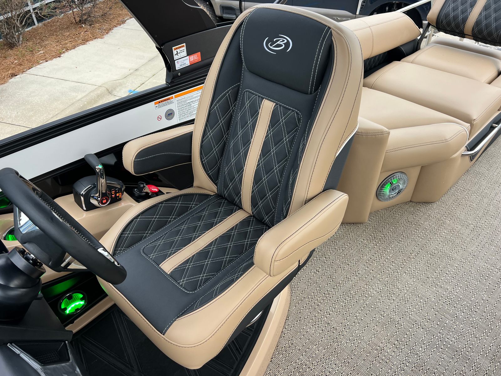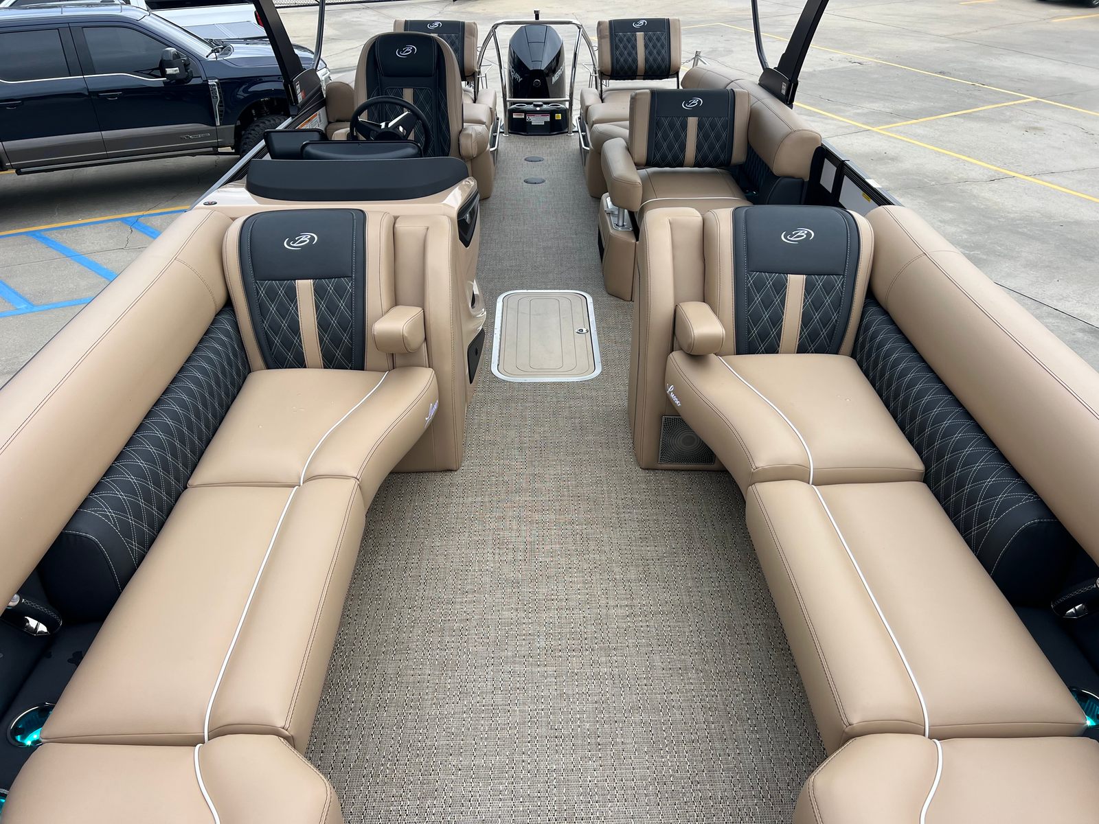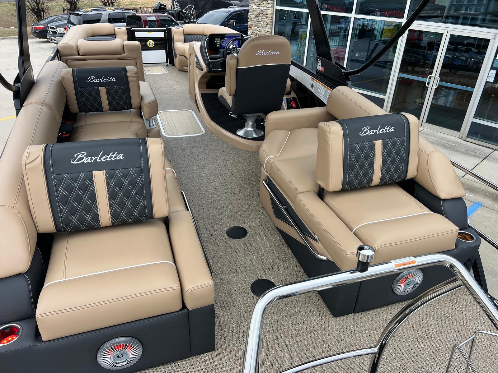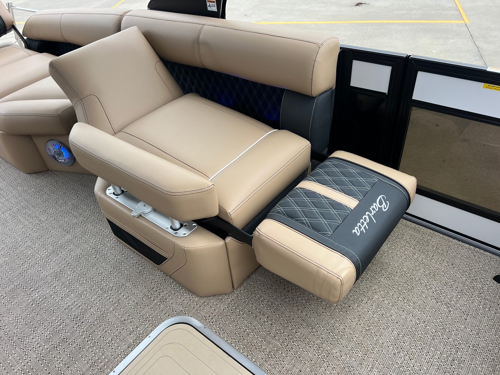 The Barletta Lusso L25M is packed with premium features designed to elevate your boating experience. The striking Winter White sweep color and Black Diamond accents create a modern, eye-catching look, while the Blackout Package Lusso railskin adds a touch of sophistication. The Carmella Tan with Onyx furniture provides plush, supportive seating, and the Amore Tan flooring is both stylish and easy to maintain. The Sport Bimini, installed in place of the standard bimini, offers superior shade and protection from the sun, allowing you to relax in comfort during long days on the water. The on-board battery charger with two batteries ensures you have reliable power for all your adventures, while the Mercury Digital DTS Pre-Rig for VERADO and stainless steel prop deliver optimal performance and control.