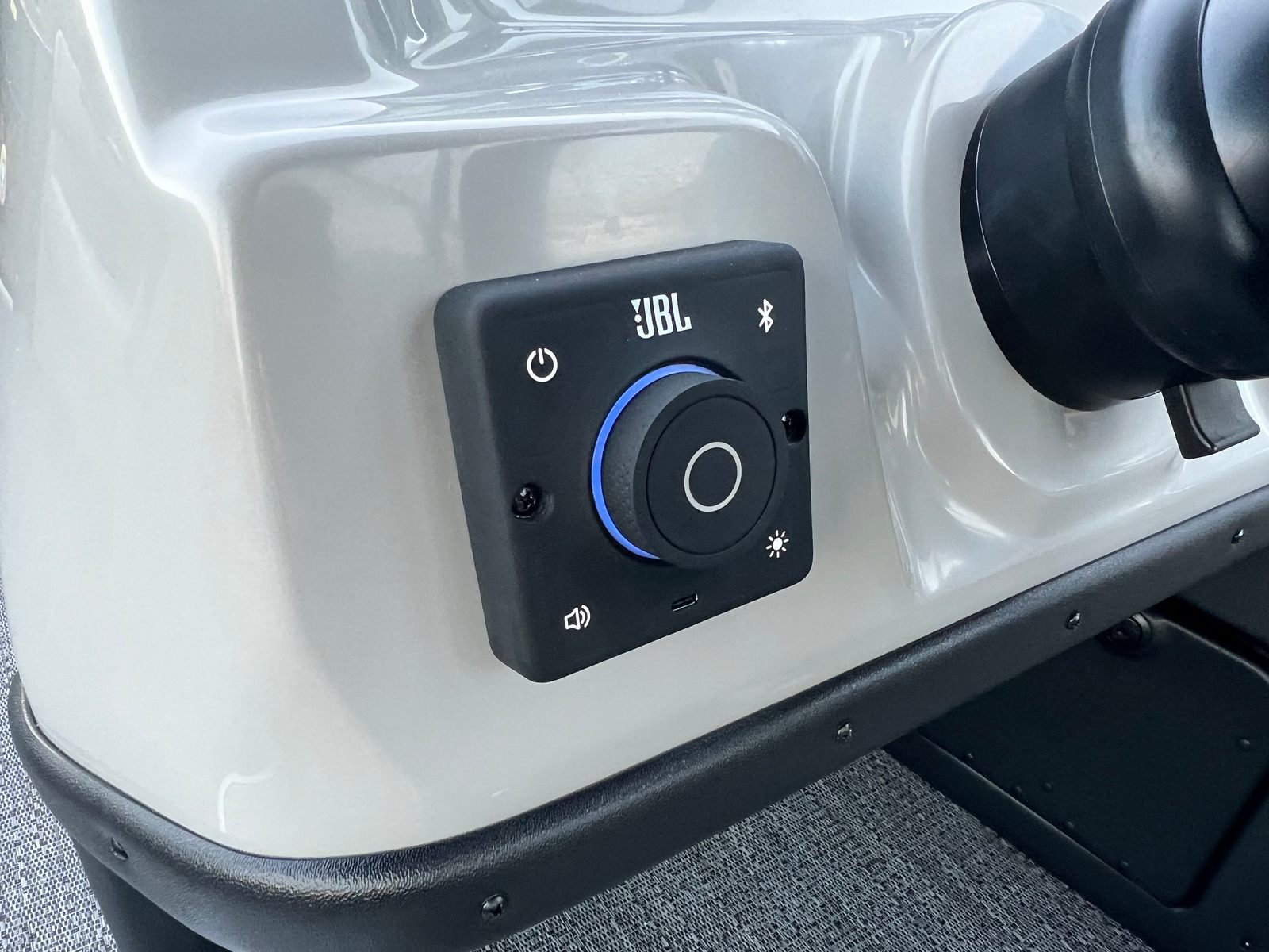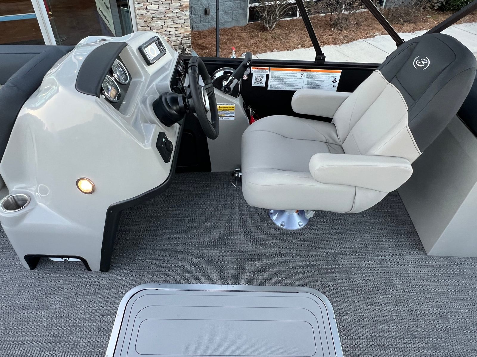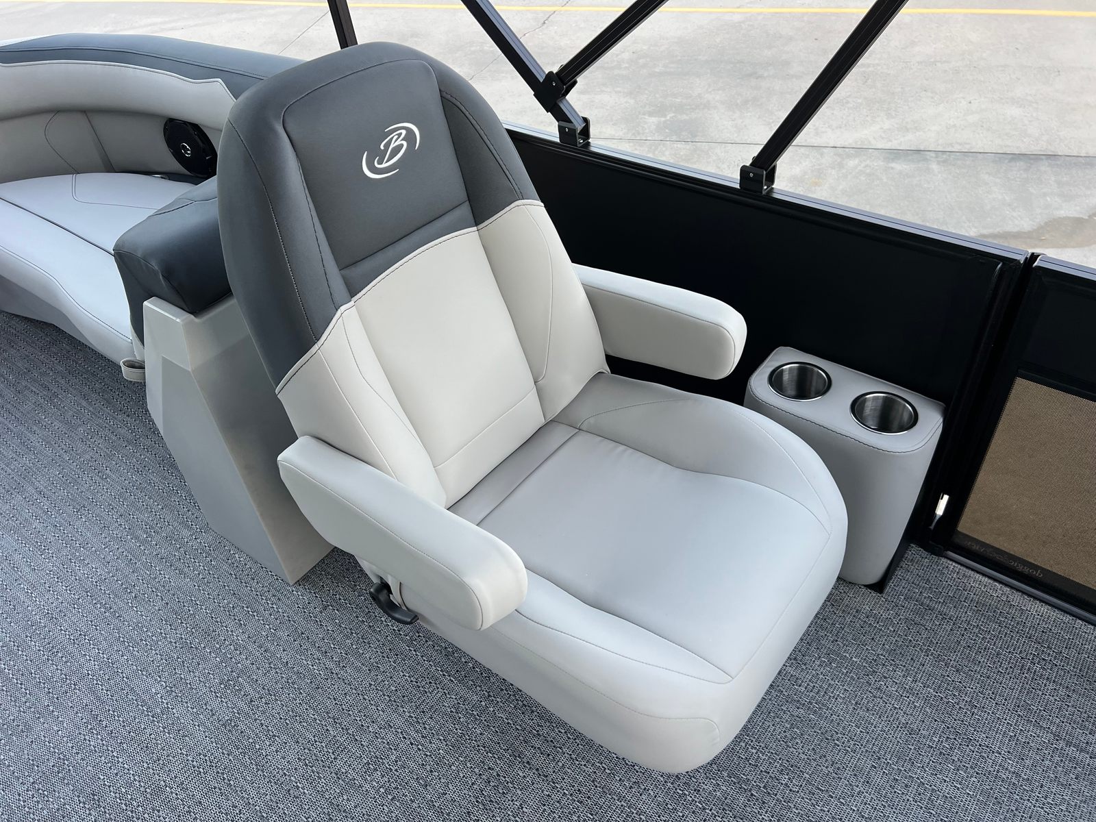 This Barletta pontoon boat is loaded with premium features designed to enhance your boating experience. The Matte Black Railskin color and Blackout Package Sanza create a striking visual statement, while the Marquesan Gray with Onyx furniture provides a luxurious and comfortable seating arrangement for all passengers. The Amore Gray flooring adds a touch of elegance and durability, ensuring your pontoon remains stylish and easy to maintain.The Triple Toon Package Sanza elevates the boat's stability and performance, allowing for smoother rides and improved handling, even with a full crew on board. One of the standout features is the in-floor midship storage, offering convenient space to stow away gear, water toys, and personal items, keeping the deck clutter-free and organized.