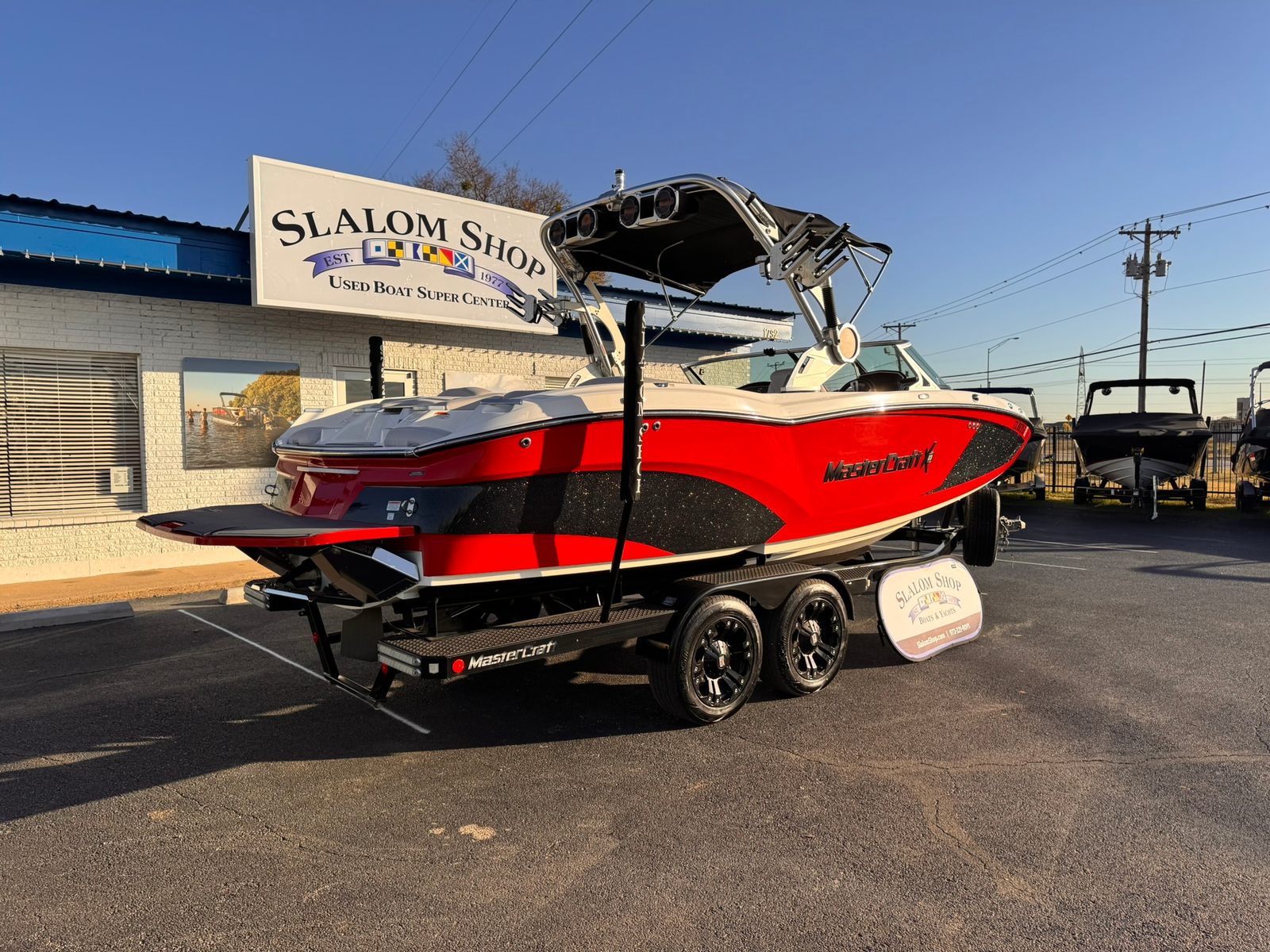 Now available on consignment at our Used Boat Super Center in Lewisville, this 2018 MasterCraft X23 is a high-performance wake and surf boat built for serious riders and luxury cruising. Finished in an eye-catching red and black metal flake gelcoat with a white and grey interior accented by red piping, this X23 is powered by the legendary Ilmor 6.2L Direct-Injected, Closed-Cooled engine producing 430 horsepower with 321 hours.