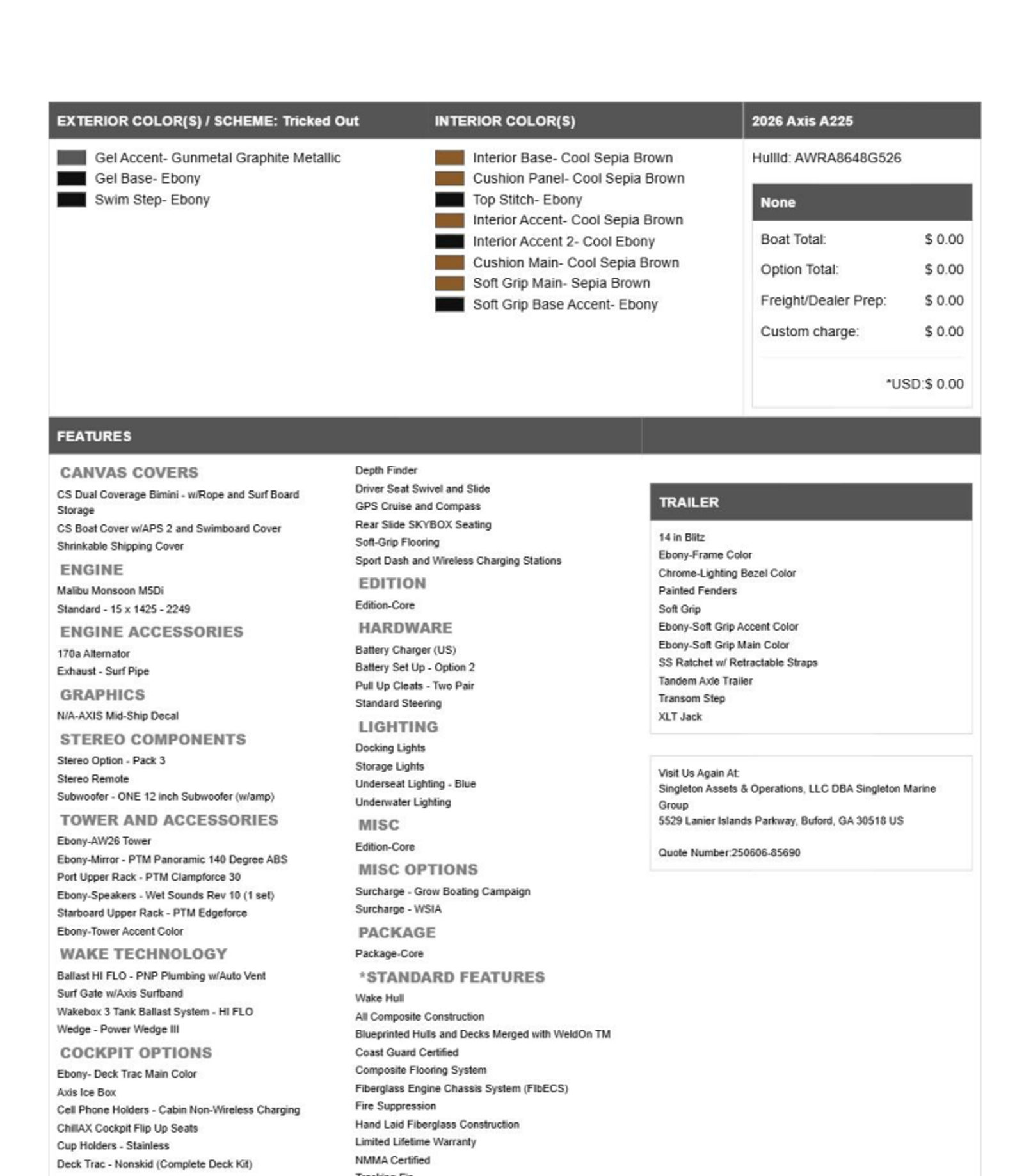 The 2026 Axis A225 is more than just a Ski & Wakeboard boat for sale; it is your ticket to endless fun, adventure, and unforgettable memories. With its powerful 400-horsepower engine, innovative features like GPS Cruise and Compass, Sport Dash, Wireless Charging Stations, and Coast Guard Certification, this Axis boat for sale delivers the perfect blend of performance, safety, and style. The Limited Lifetime Warranty and practical amenities like the Battery Charger, Storage Lights, and Axis Ice Box ensure you are ready for anything the water has to offer.Do not miss your chance to own the ultimate Ski & Wakeboard boat. Contact your local dealer today to learn more about the 2026 Axis A225 and start planning your next adventure on the water!