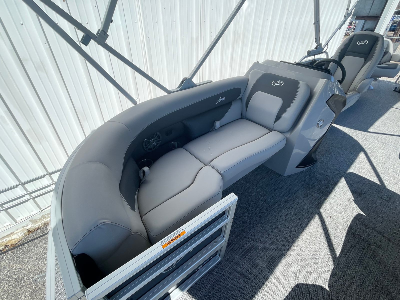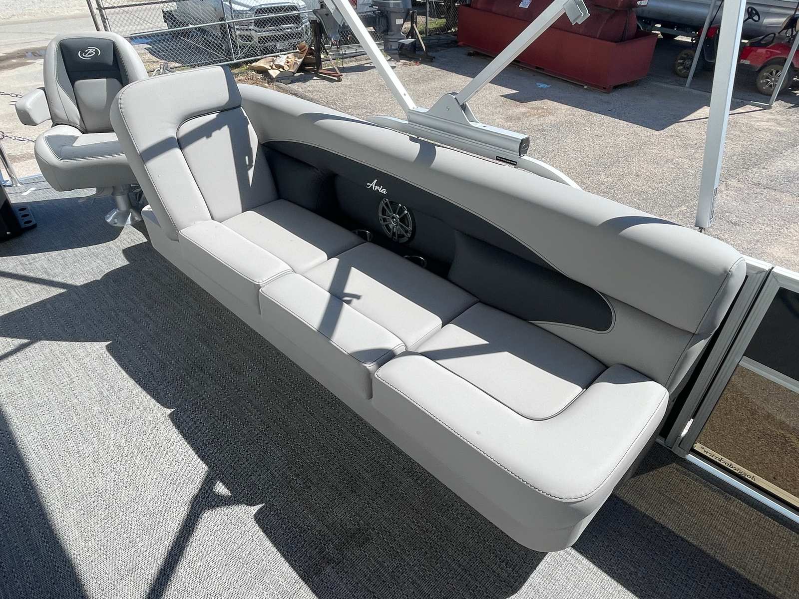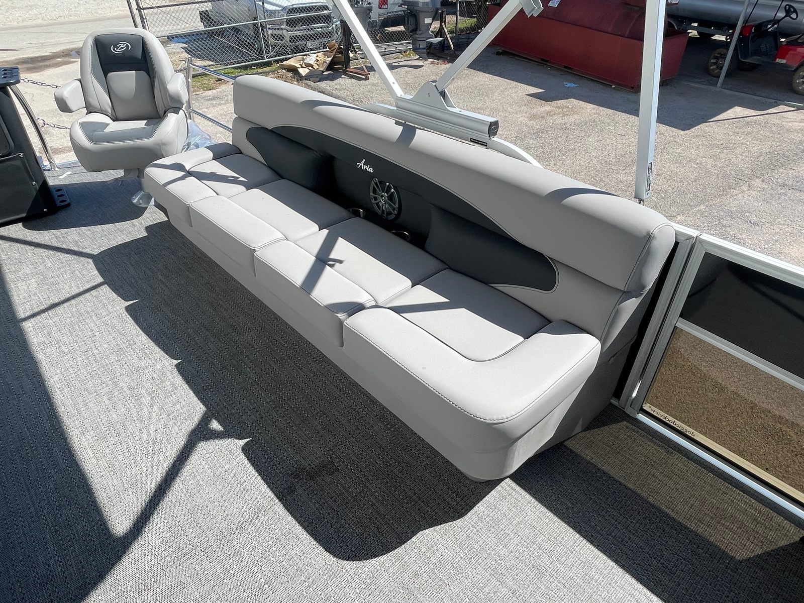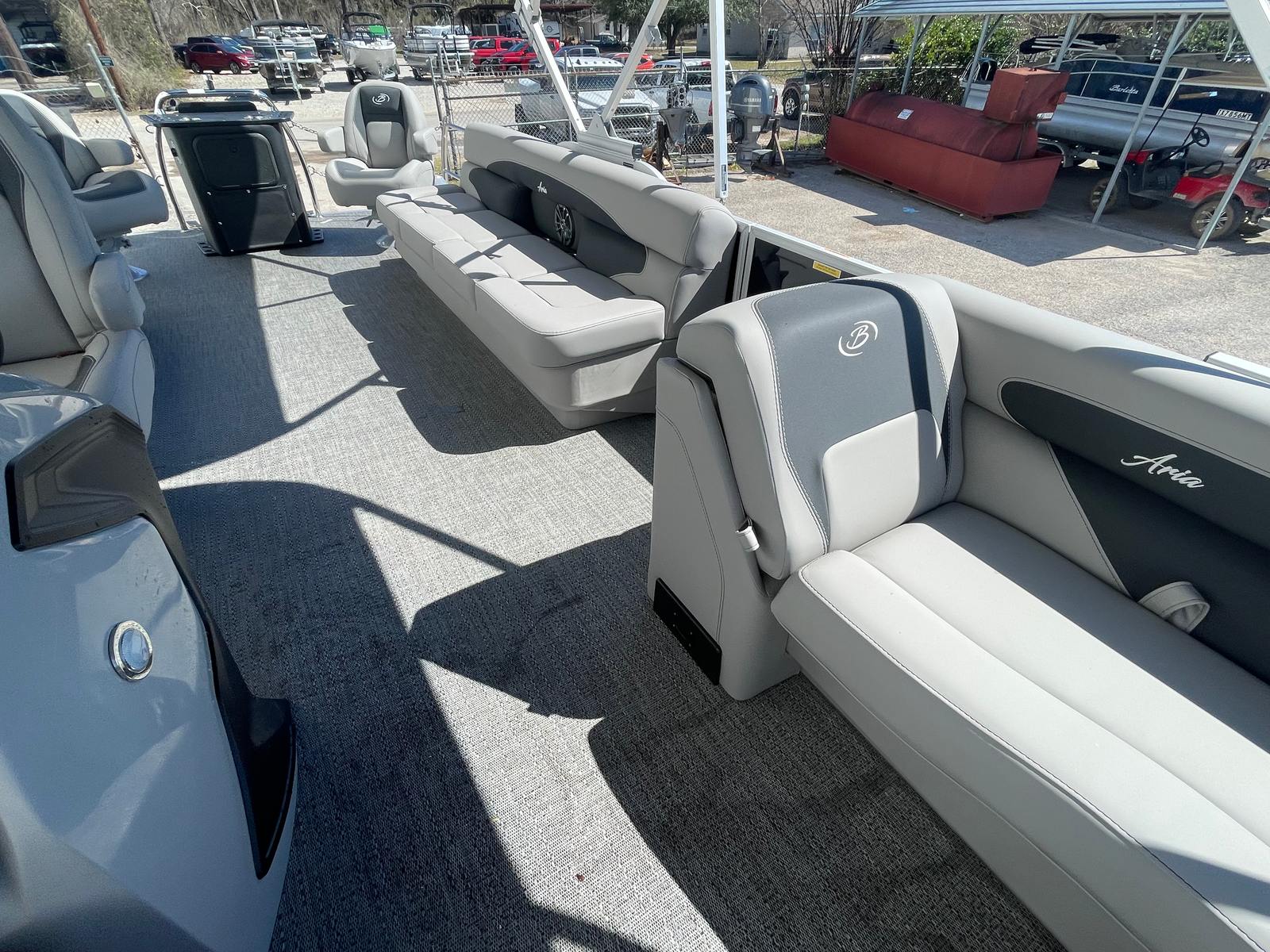 Step aboard the Aria A22CC and discover a world of comfort and convenience. The Tempest Gray furniture offers plush, supportive seating that invites you to relax and unwind, while the Amore Gray flooring provides a stylish, slip-resistant surface that is both practical and visually appealing. The Triple Toon Package Aria enhances stability and buoyancy, allowing for a smoother ride even when the water gets choppy.Enjoy the shade and protection of the double bimini, perfect for those sunny afternoons or when you want a break from the heat. The stainless steel flag pole with an American flag adds a patriotic touch and a sense of pride to your boating adventures. Navigating your favorite waterways is a breeze with the Eagle 5 GPS, providing accurate and reliable guidance wherever your journey takes you.
