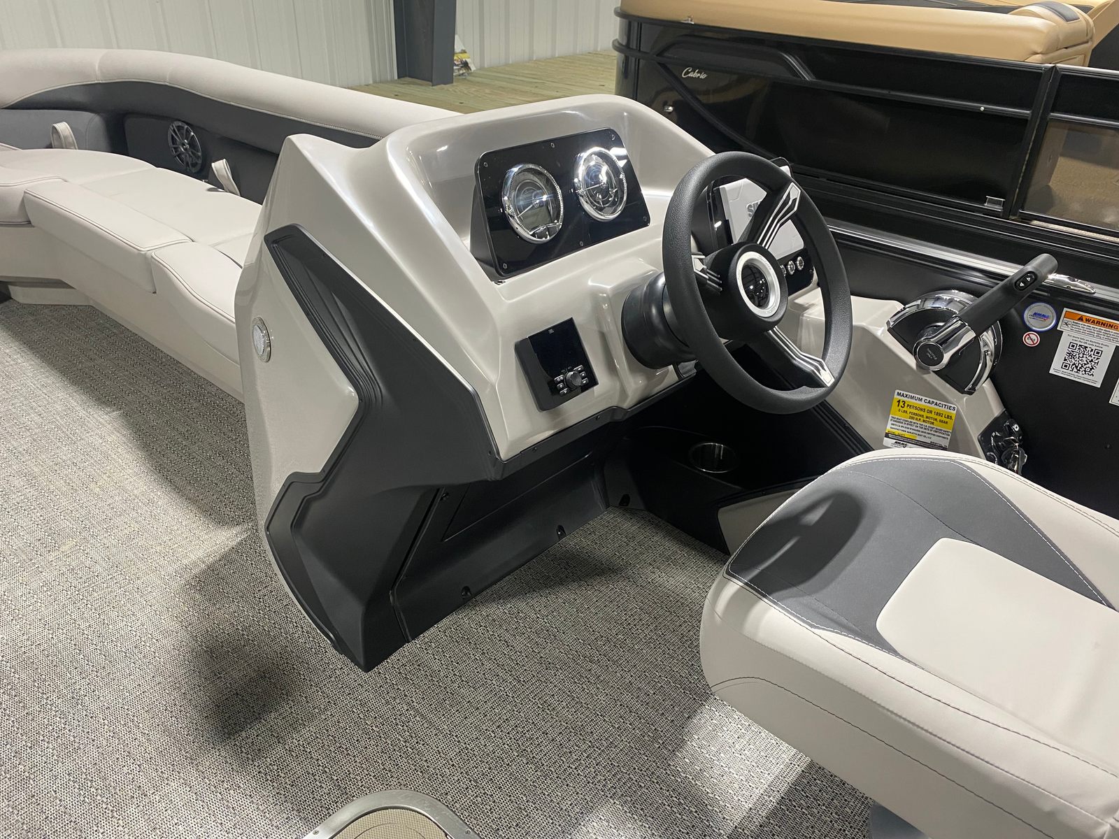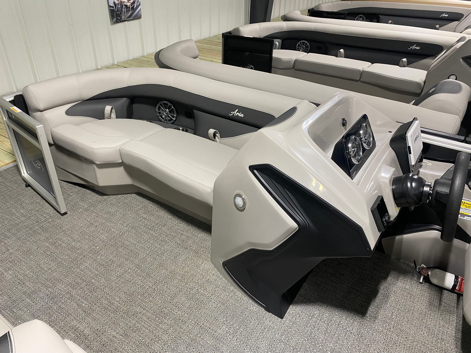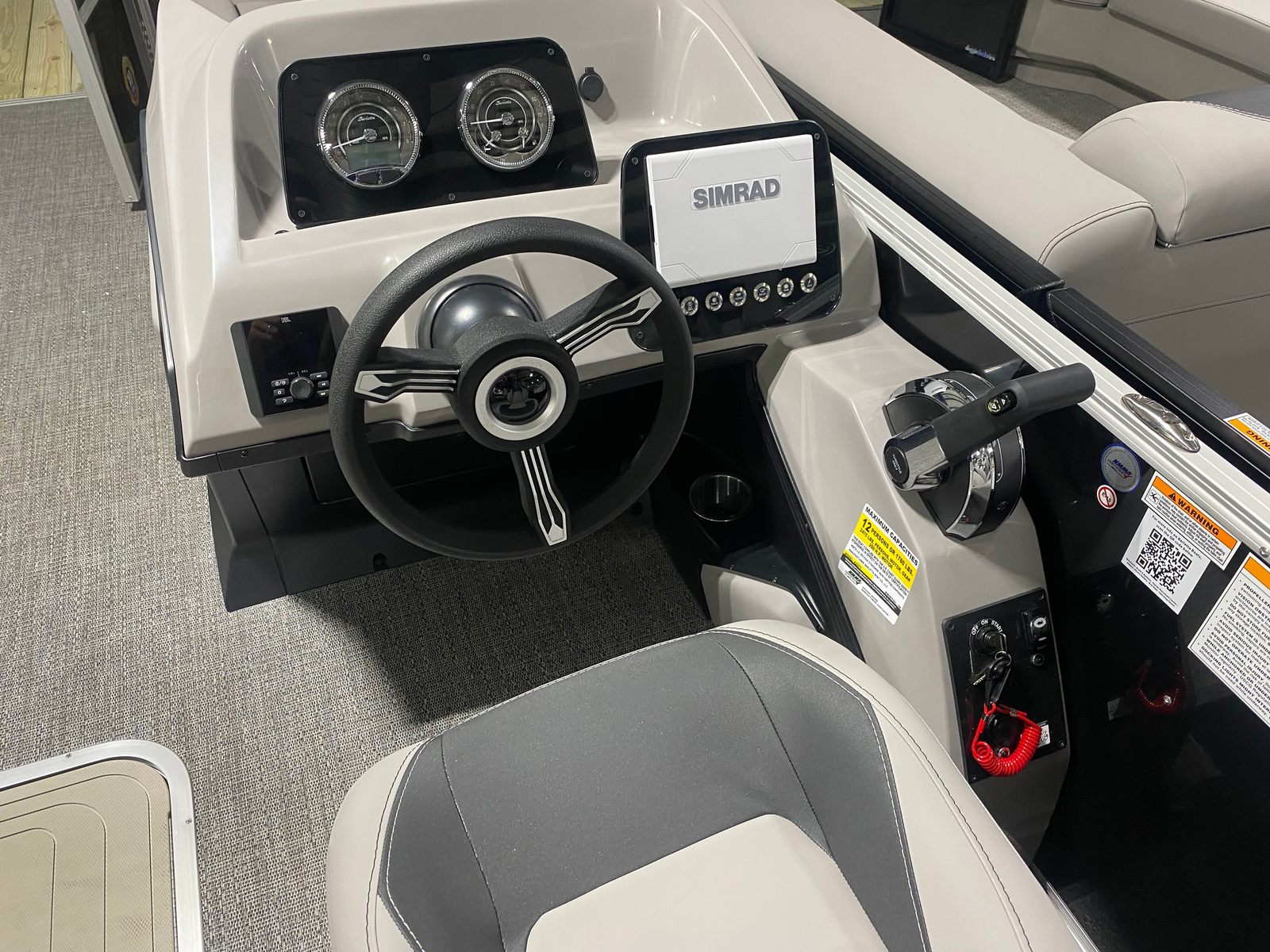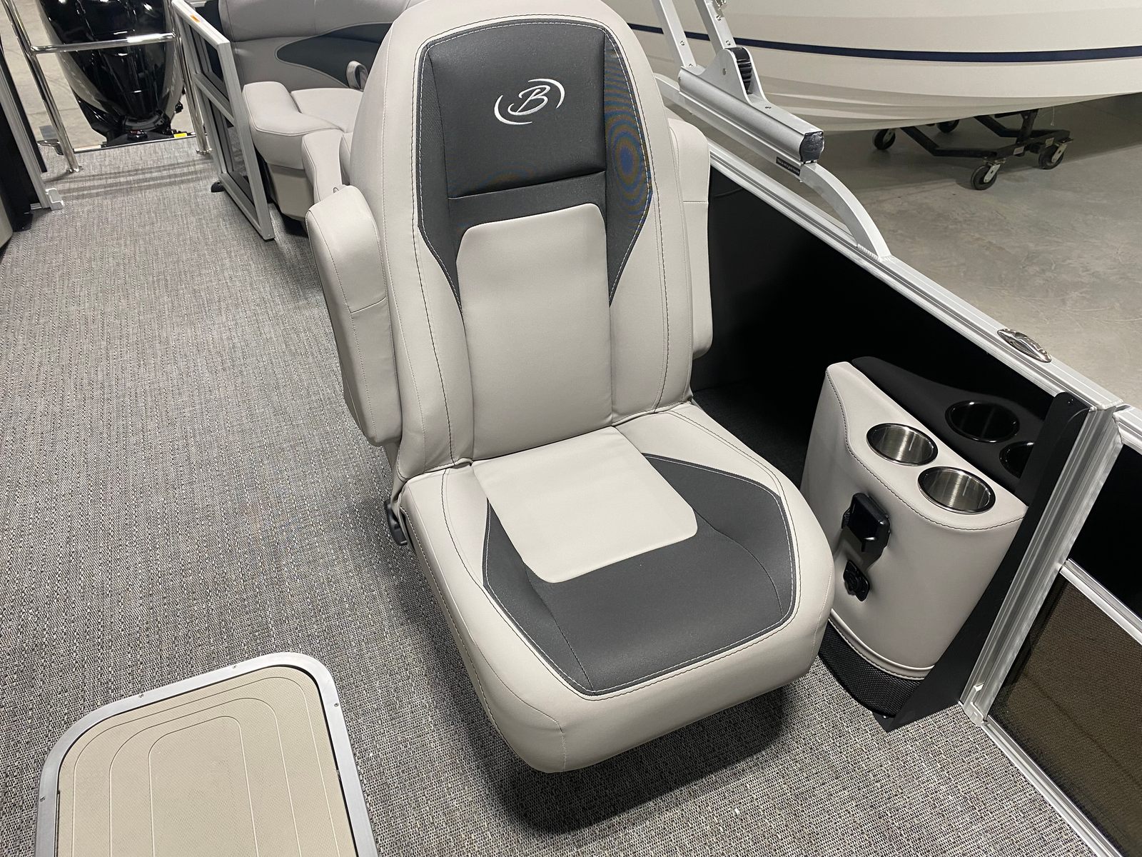 The Barletta Aria A22QC-Platinum is packed with premium features designed to enhance your time on the water. The stainless steel flag pole with an American flag adds a patriotic touch to the exterior, while the in-floor midship storage (available with the Triple Toon Package) provides ample space for all your gear and essentials. The helm is equipped with a state-of-the-art Simrad 7" G07 XSE, offering advanced navigation and control at your fingertips. The thoughtfully designed furniture in Tempest Gray ensures maximum comfort, and the Amore Gray flooring is both stylish and easy to maintain. Every detail has been carefully considered to provide a seamless blend of luxury, convenience, and functionality.