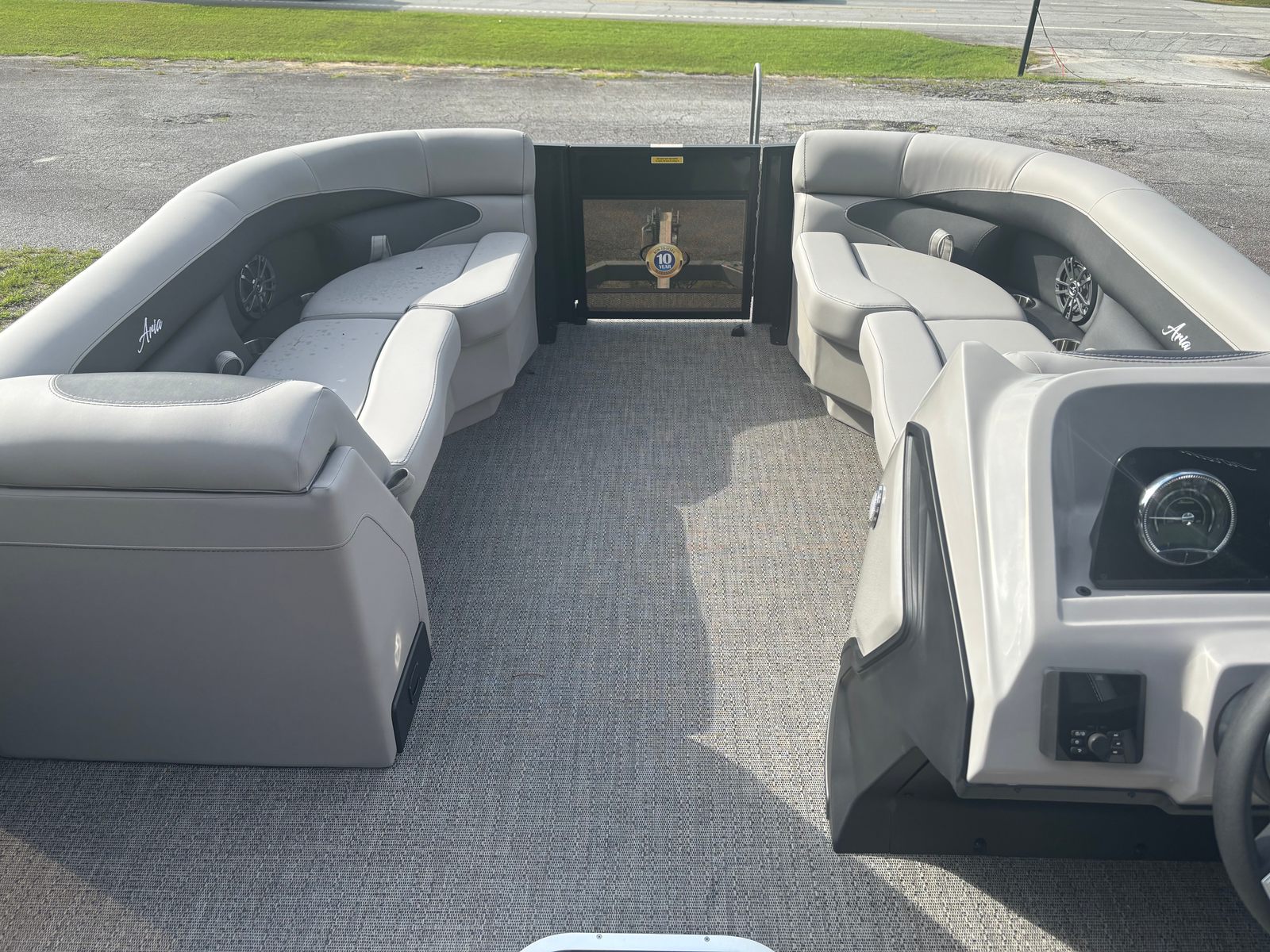 Step aboard and you’ll immediately notice the attention to detail in every aspect of the Barletta Aria A22QC-Platinum. The Tempest Gray furniture offers plush seating and a modern aesthetic, creating a welcoming environment for guests. The Amore Gray flooring is not only stylish but also durable and easy to maintain, making it ideal for active days on the water.One of the standout features is the in-floor midship storage, providing ample space to stow away gear, water toys, and personal items. This thoughtful addition keeps the deck clutter-free and ensures everything you need is within reach. The Triple Toon Package Aria enhances stability and buoyancy, allowing for smoother rides and increased passenger capacity.The stainless steel flag pole with an American flag adds a patriotic touch and a sense of pride to your boating adventures. The Black Diamond railskin color, paired with the Blackout Package Aria, gives the pontoon a bold, contemporary look that’s sure to impress.
