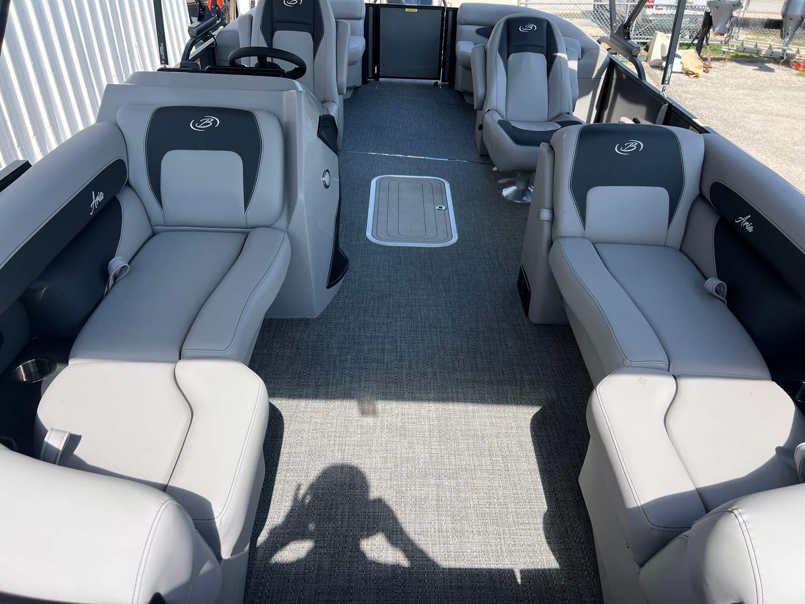 The Barletta Aria A22QC-Platinum is packed with special features that set it apart from other pontoon boats for sale. The Railskin Color Aria in Gray Moonstone gives the exterior a sophisticated and modern look, while the Blackout Package Aria adds a bold touch of elegance. Inside, the Tempest Gray furniture offers both comfort and style, creating a welcoming atmosphere for passengers. The Amore Gray flooring is not only visually appealing but also designed for durability and easy maintenance.One of the standout features is the Double Bimini canvas, providing ample shade and protection from the sun, so you can relax in comfort no matter the weather. The In Floor Midship Storage offers convenient space for stowing gear, water toys, and other essentials, keeping the deck clutter-free and organized. With the Triple Toon Package Aria, you’ll benefit from enhanced buoyancy and stability, making every ride smoother and more enjoyable.