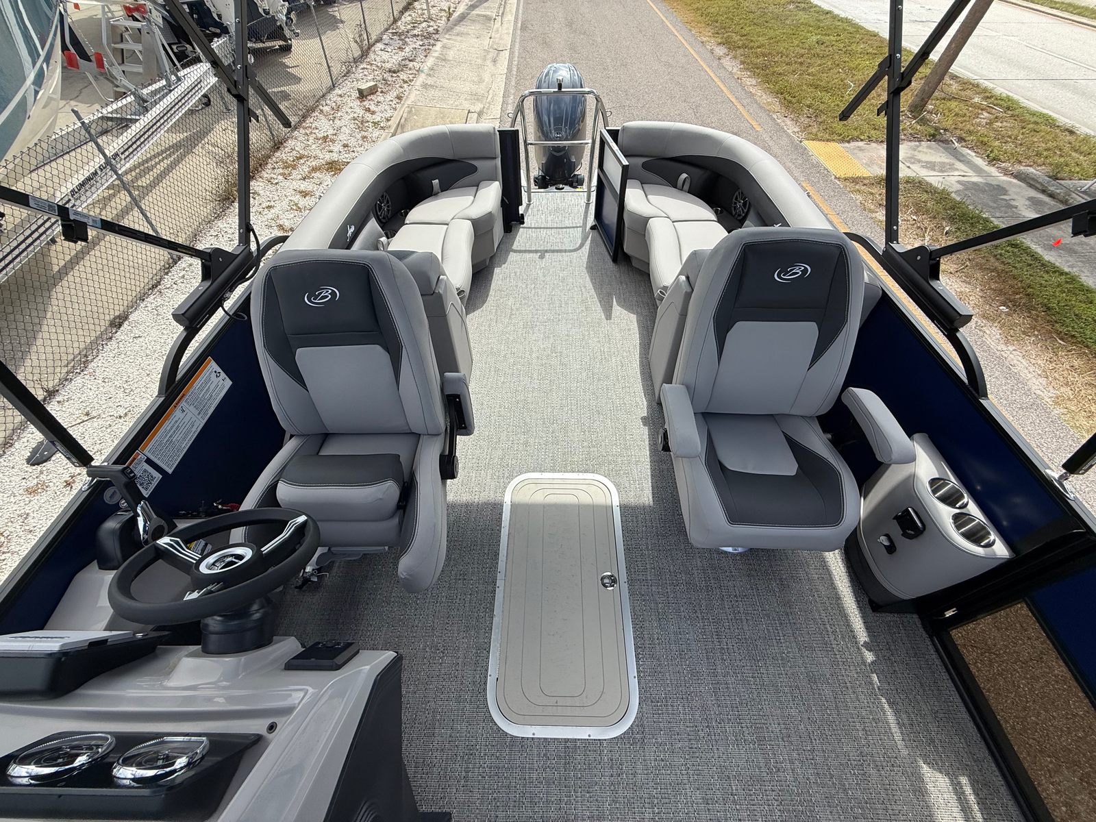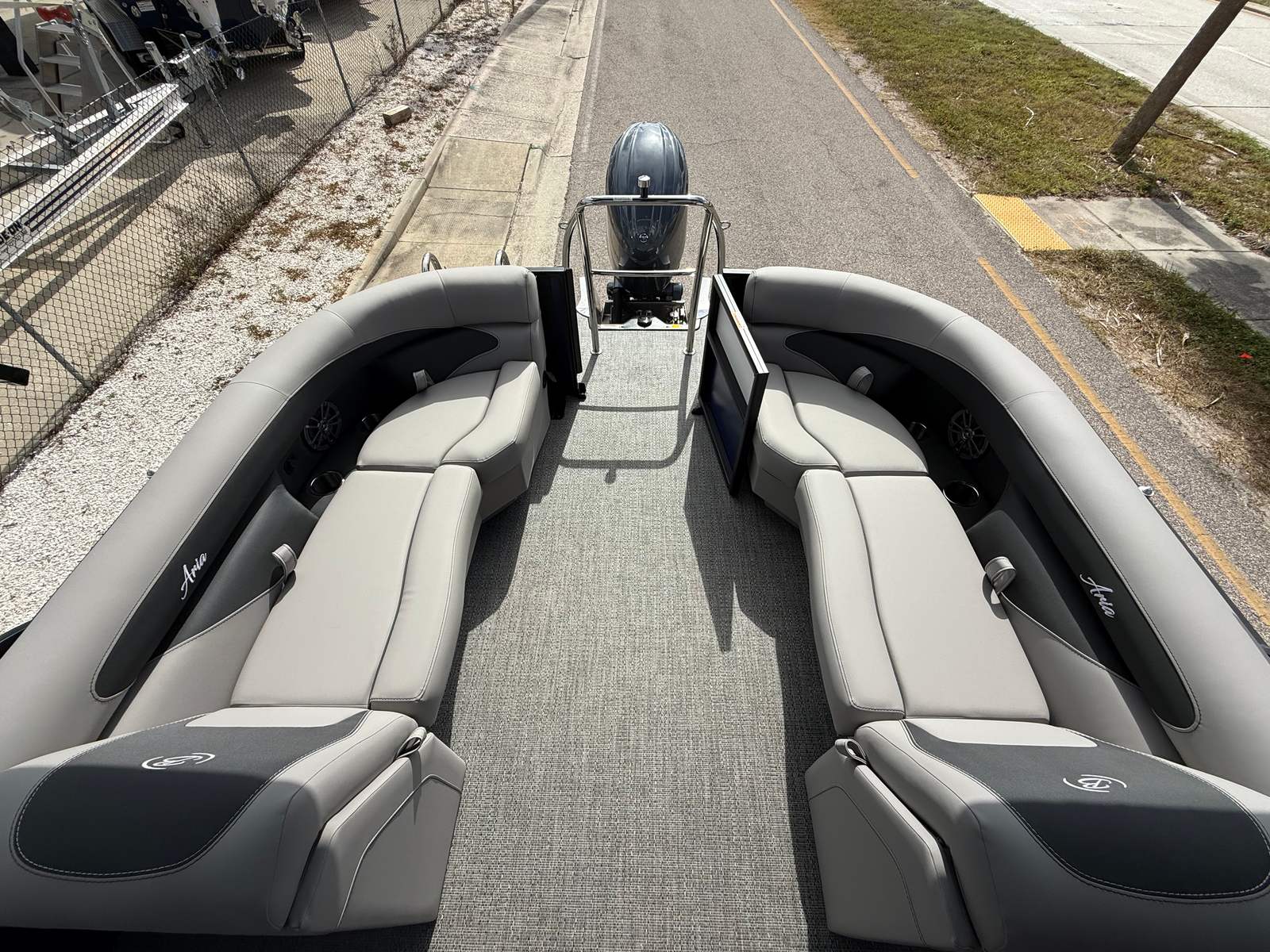 The Barletta Aria A22QC-Platinum is packed with features that elevate your boating experience. The Railskin Color Aria in Bohemian Blue, complemented by the Railskin Accent Aria in Winter White, creates a striking visual appeal that is sure to impress. The Blackout Package Aria adds a touch of sophistication, giving the boat a sleek and modern look. Inside, the Tempest Gray furniture offers both comfort and style, providing plush seating for all passengers. The Amore Gray flooring is not only visually appealing but also easy to clean and maintain, ensuring your pontoon always looks its best.As part of the Coastal Edition Aria, this pontoon is designed to withstand the elements, making it suitable for a variety of water environments. The Triple Toon Package Aria enhances the boat’s stability and performance, allowing for smoother rides and better handling. Every detail, from the railskin accents to the flooring and furniture, has been carefully selected to create a cohesive and inviting atmosphere on board.