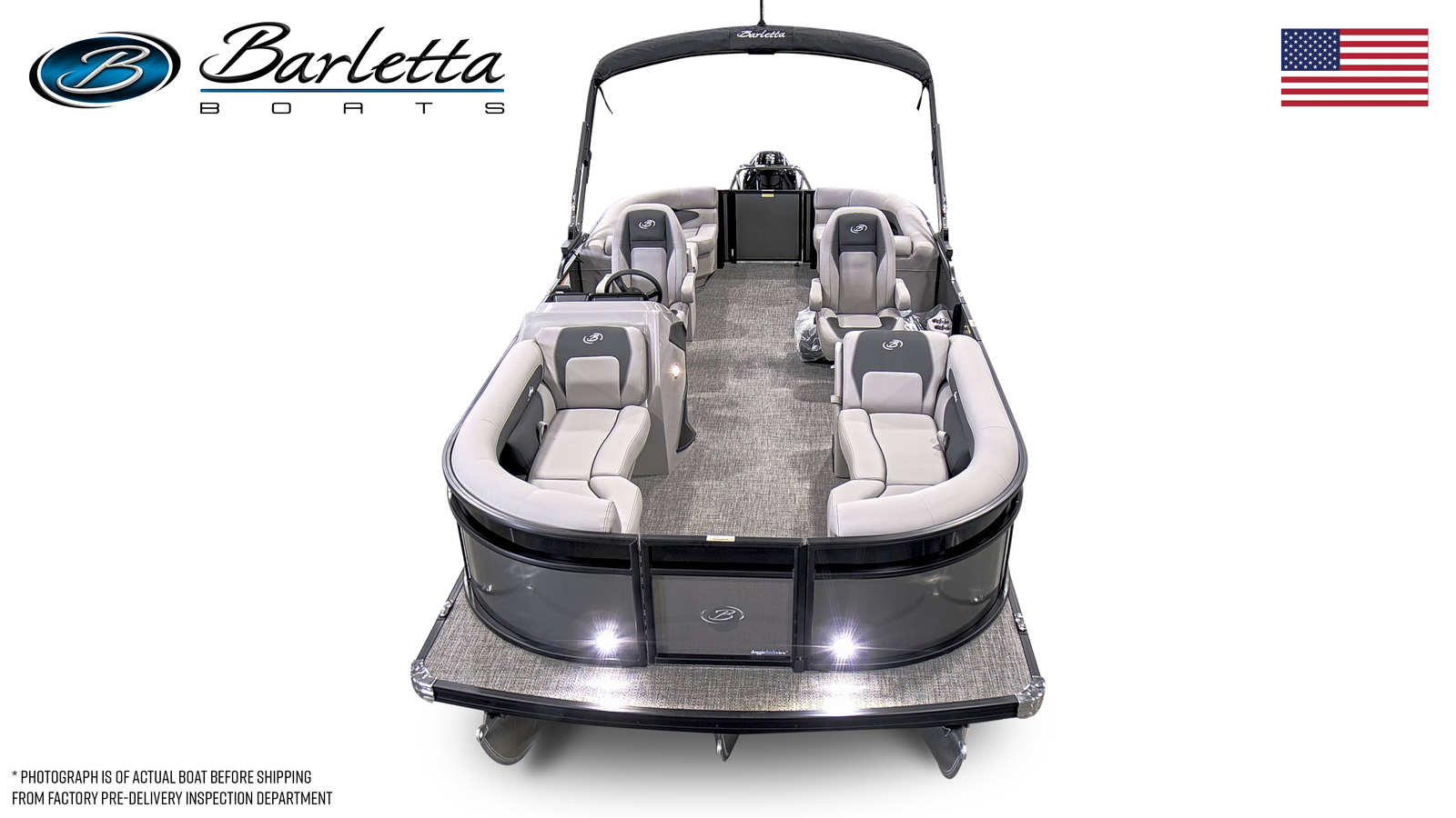 The Barletta Aria A22QC-Platinum is loaded with features designed to maximize comfort, style, and functionality. The Railskin Color Aria in Gray Moonstone, paired with the Black Diamond accent and Blackout Package Aria, gives the boat a sophisticated and modern look. Inside, the Tempest Gray furniture provides plush, supportive seating for all your guests, while the Amore Gray flooring adds a touch of elegance and is easy to clean after a day of fun on the water. The Triple Toon Package Aria ensures enhanced stability and performance, making every ride smooth and enjoyable. The boat is pre-rigged for Mercury engines with power assist, and the engine is expertly rigged with a stainless steel prop for maximum efficiency. As a finishing touch, the exterior features a stainless steel flag pole with an American flag, adding a patriotic flair to your boating experience.