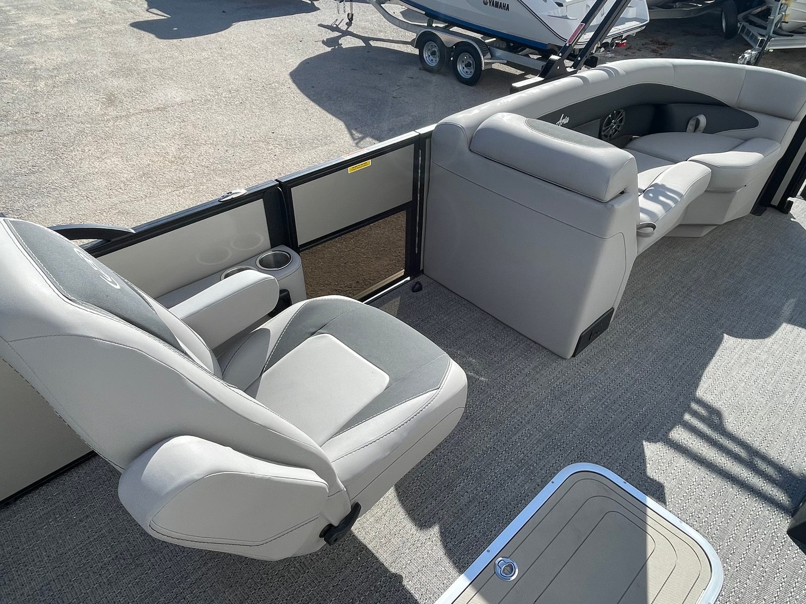 Step aboard the Barletta Aria A22UC-Platinum and experience a world of luxury and convenience. The Railskin Color Aria in Champagne, complemented by the Black Diamond accent, creates a sophisticated and eye-catching exterior. The Blackout Package Aria adds a touch of modern elegance, ensuring your pontoon stands out from the crowd. Inside, the Tempest Gray furniture provides plush seating and a contemporary look, while the Amore Gray flooring offers both style and durability.The Double Bimini canvas delivers ample shade, allowing you and your guests to relax comfortably even on the sunniest days. The Triple Toon Package Aria enhances stability and buoyancy, making this pontoon ideal for larger groups and more active water activities. Every detail, from the rigged engine with stainless steel prop to the thoughtful layout, is designed to maximize your enjoyment and convenience on the water.