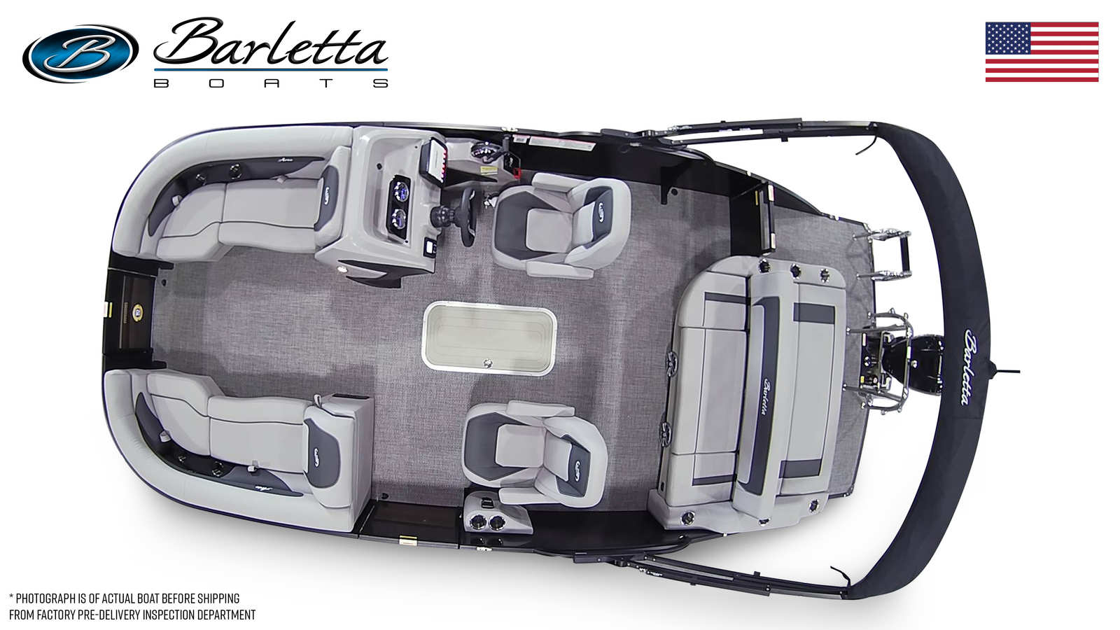 This Barletta pontoon boat for sale is loaded with features that cater to both comfort and functionality. The Triple Toon Package Aria provides enhanced stability and buoyancy, allowing for a smoother ride and increased capacity. The in-floor midship storage offers convenient space for stowing gear, water toys, and personal items, keeping the deck clutter-free and organized. The stainless steel flag pole with an American flag adds a patriotic touch, making this pontoon perfect for holiday gatherings and special occasions. Every detail, from the plush Tempest Gray furniture to the resilient Amore Gray flooring, is designed to create a luxurious and inviting atmosphere on board.