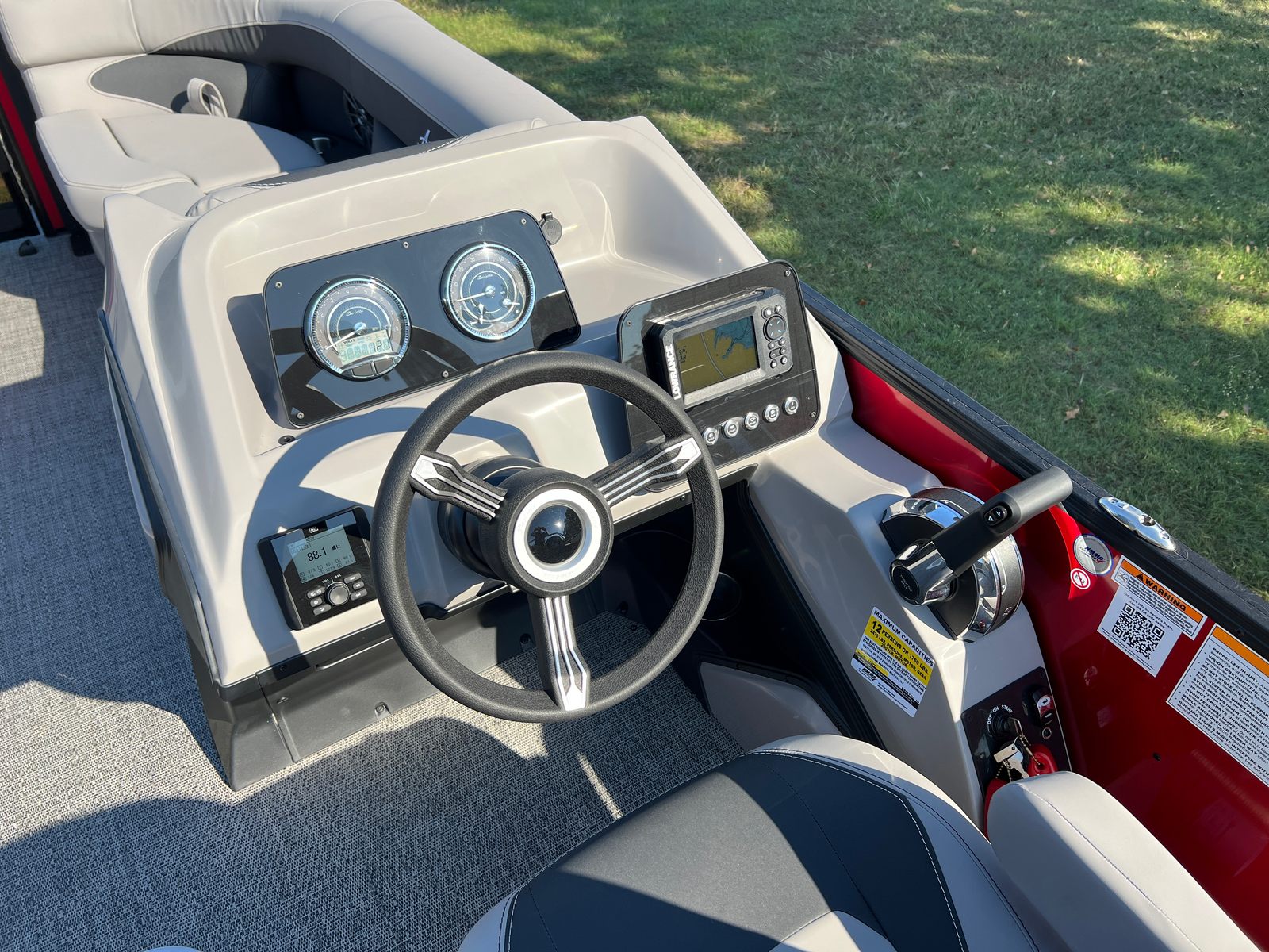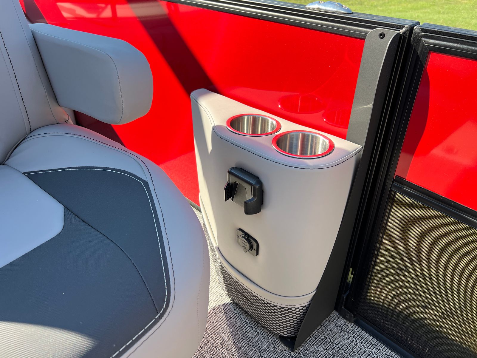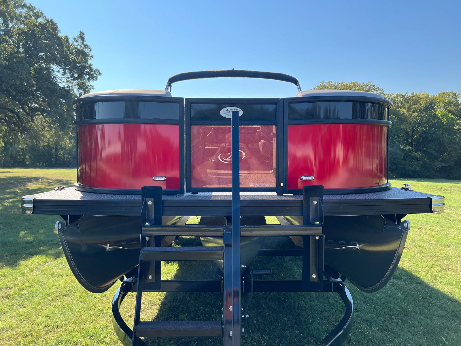 The Barletta Aria A22UC-Platinum is packed with premium features that set it apart from other pontoon boats for sale. The Railskin Color Aria in Macau Red, complemented by the Black Diamond accent and Blackout Package Aria, gives this vessel a bold, sophisticated look. Inside, the Tempest Gray furniture offers plush seating and ergonomic comfort, while the Amore Gray flooring provides a stylish, easy-to-clean surface for all your onboard activities. The Triple Toon Package Aria ensures enhanced buoyancy and stability, making every ride smooth and secure. A Stainless Steel Flag Pole with an American Flag adds a patriotic touch, perfect for celebrating holidays or simply showing your pride on the water.