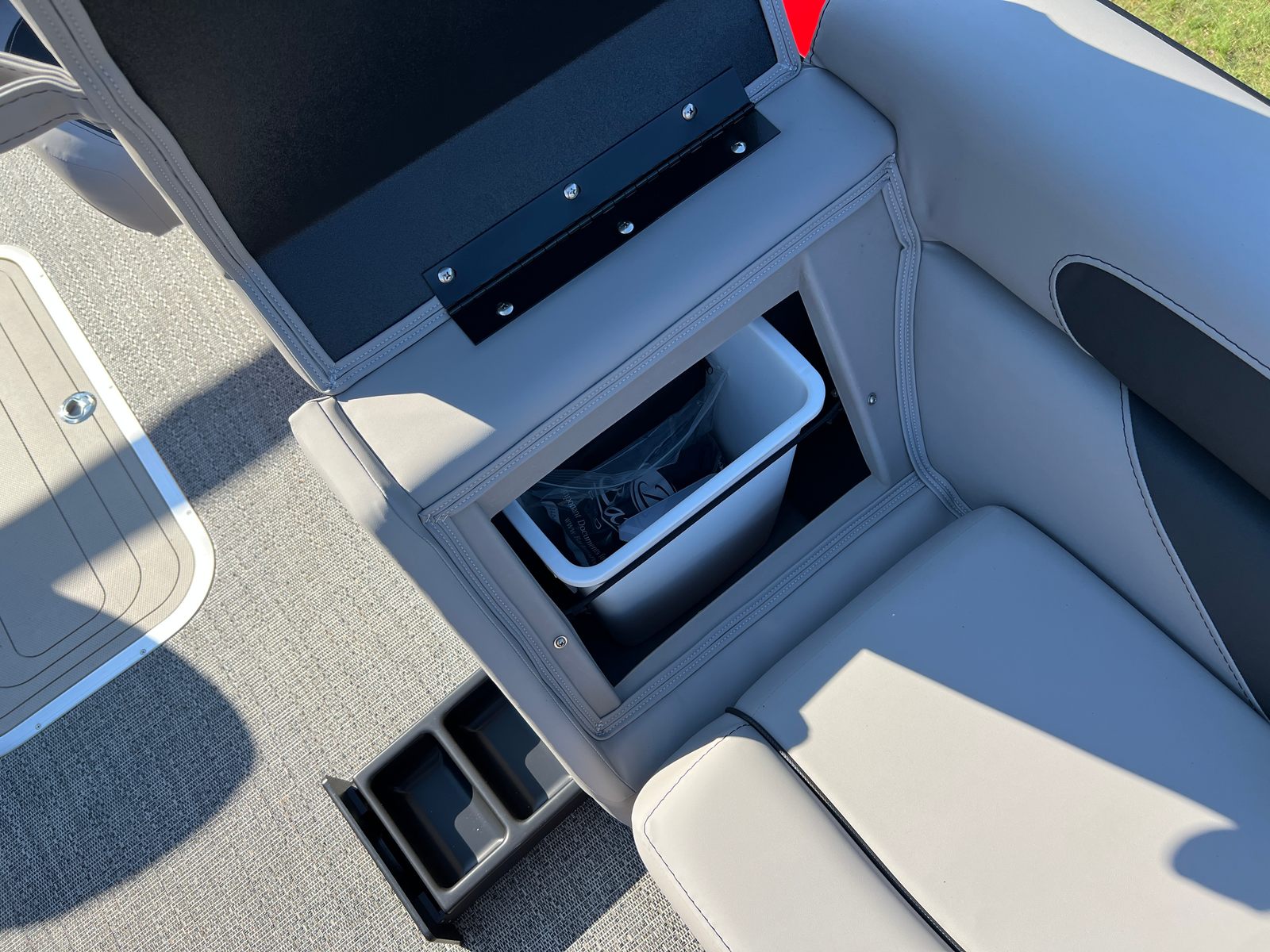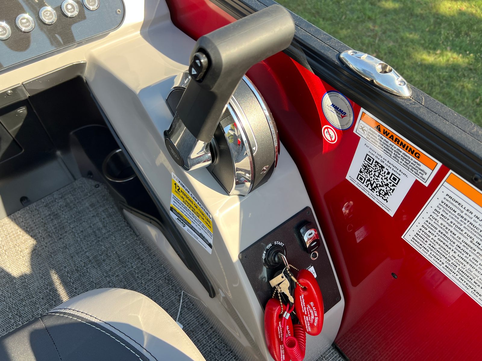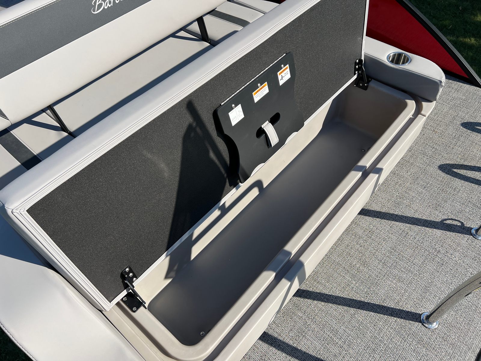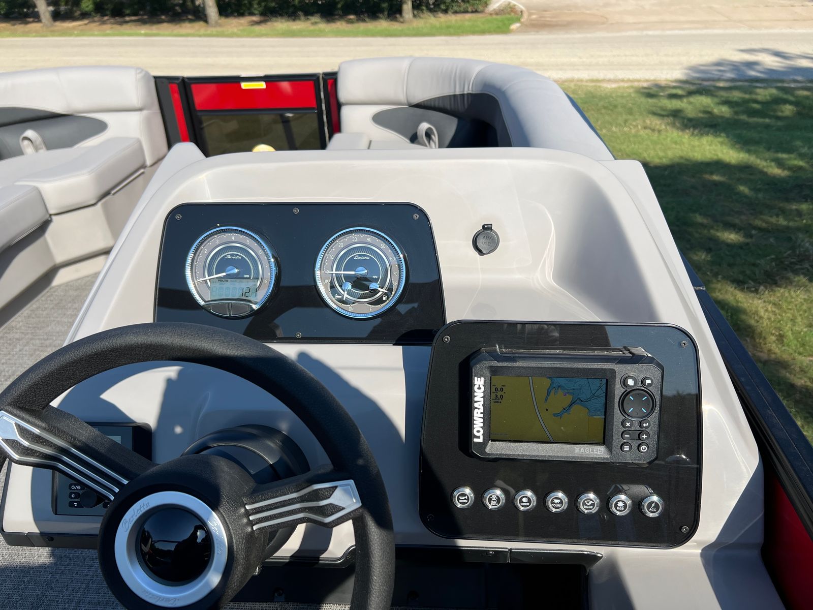 The Barletta Aria A22UC-Platinum is packed with premium features that set it apart from other pontoon boats for sale. The Railskin Color Aria in Macau Red, complemented by the Black Diamond accent and Blackout Package Aria, gives this vessel a bold, sophisticated look. Inside, the Tempest Gray furniture offers plush seating and ergonomic comfort, while the Amore Gray flooring provides a stylish, easy-to-clean surface for all your onboard activities. The Triple Toon Package Aria ensures enhanced buoyancy and stability, making every ride smooth and secure. A Stainless Steel Flag Pole with an American Flag adds a patriotic touch, perfect for celebrating holidays or simply showing your pride on the water.