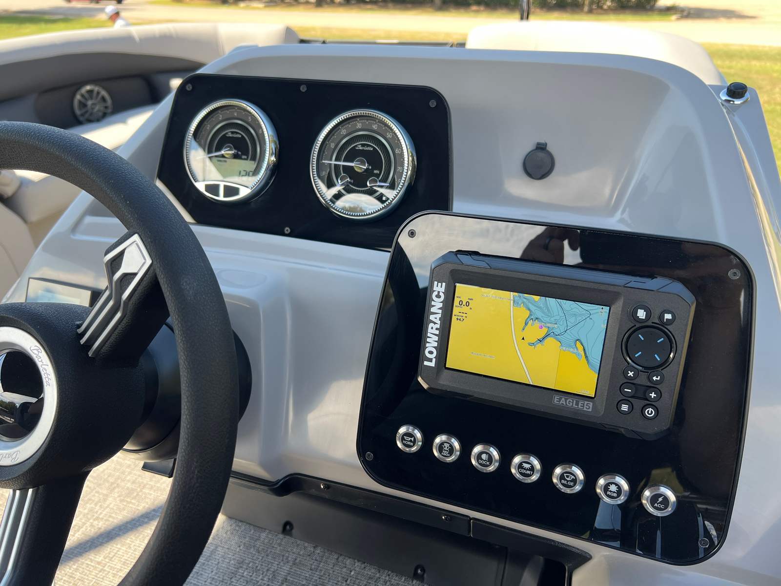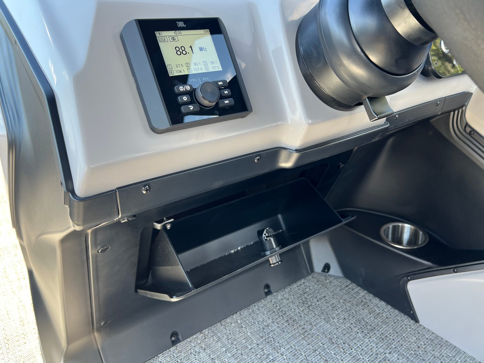The Barletta Aria A22UC is packed with features designed to elevate your boating experience. The Pacific Matte Blue Railskin, complemented by Black Diamond accents and the Blackout Package Aria, creates a striking visual impression. Inside, the Tempest Gray furniture offers a plush, inviting atmosphere, while the Amore Gray flooring is both stylish and easy to maintain. The Triple Toon Package Aria enhances buoyancy and stability, making this pontoon perfect for larger groups or those who want extra peace of mind on the water. The Mercury 150L Four Stroke engine, paired with a stainless steel prop, ensures reliable performance and longevity. A stainless steel flag pole with an American flag adds a patriotic touch, making this boat a true standout.