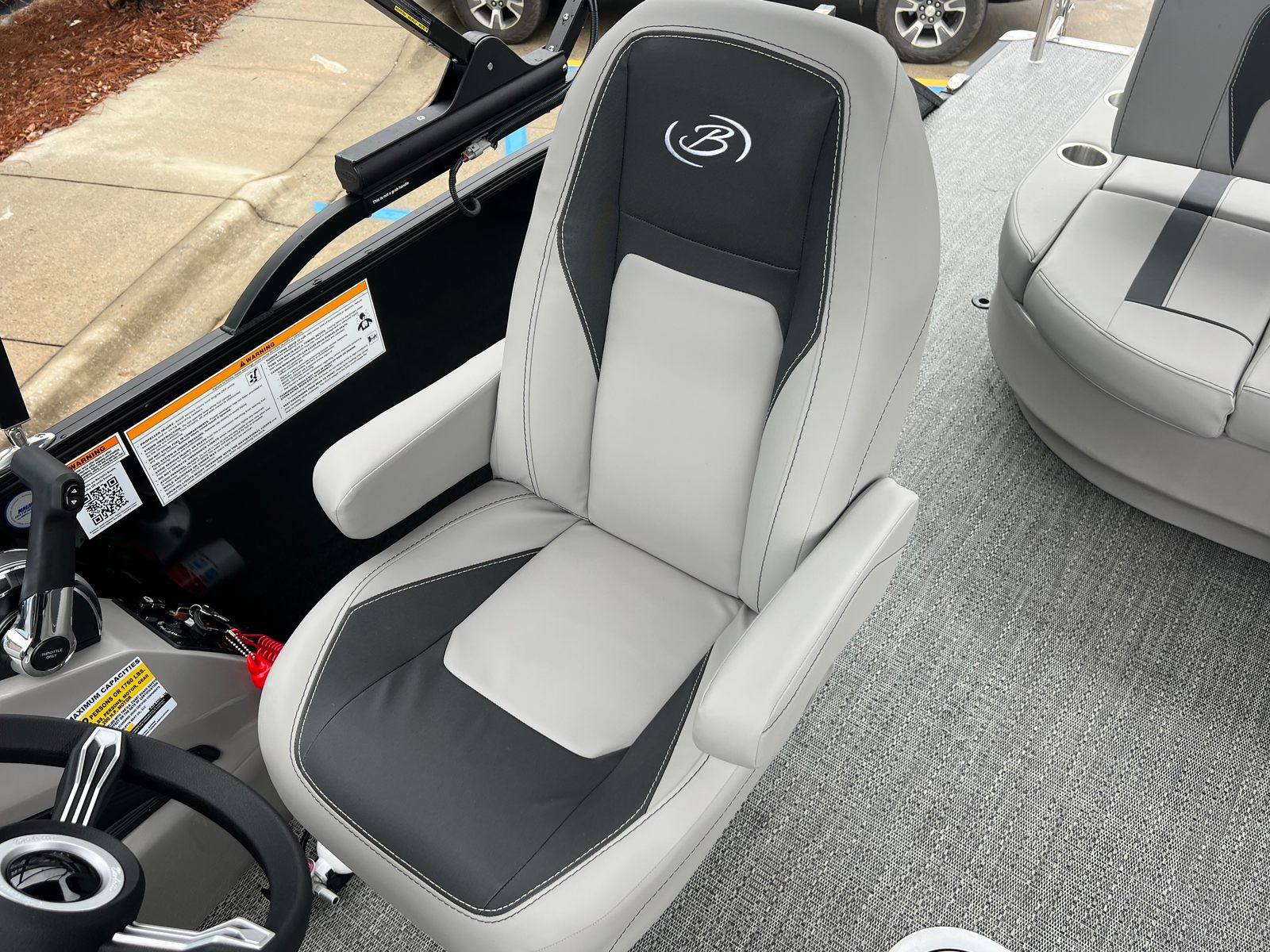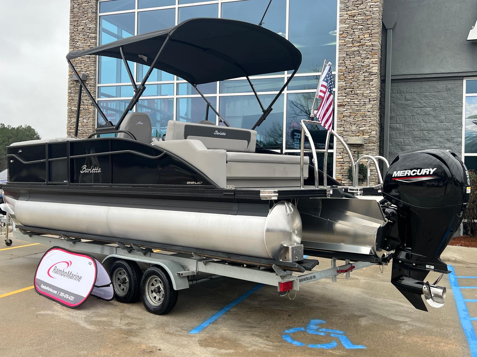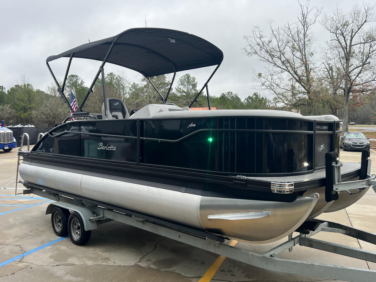 The 2026 Barletta Aria A22UC is packed with features that elevate your boating experience. The Black Diamond Railskin color and Blackout Package Aria give the exterior a sophisticated, modern look, while the Tempest Gray furniture offers plush seating for you and your guests. The Amore Gray flooring is both stylish and easy to maintain, providing a durable surface that stands up to the demands of active days on the water. The Triple Toon Package Aria adds an extra pontoon for enhanced stability and performance, making this pontoon boat ideal for a variety of activities.Additional highlights include Mercury pre-rig mechanical controls for seamless engine operation and a stainless steel prop for optimal propulsion. The on-board battery charger ensures your single battery stays charged and ready for every adventure, while the stainless steel flag pole with an American flag adds a patriotic touch to your outings.