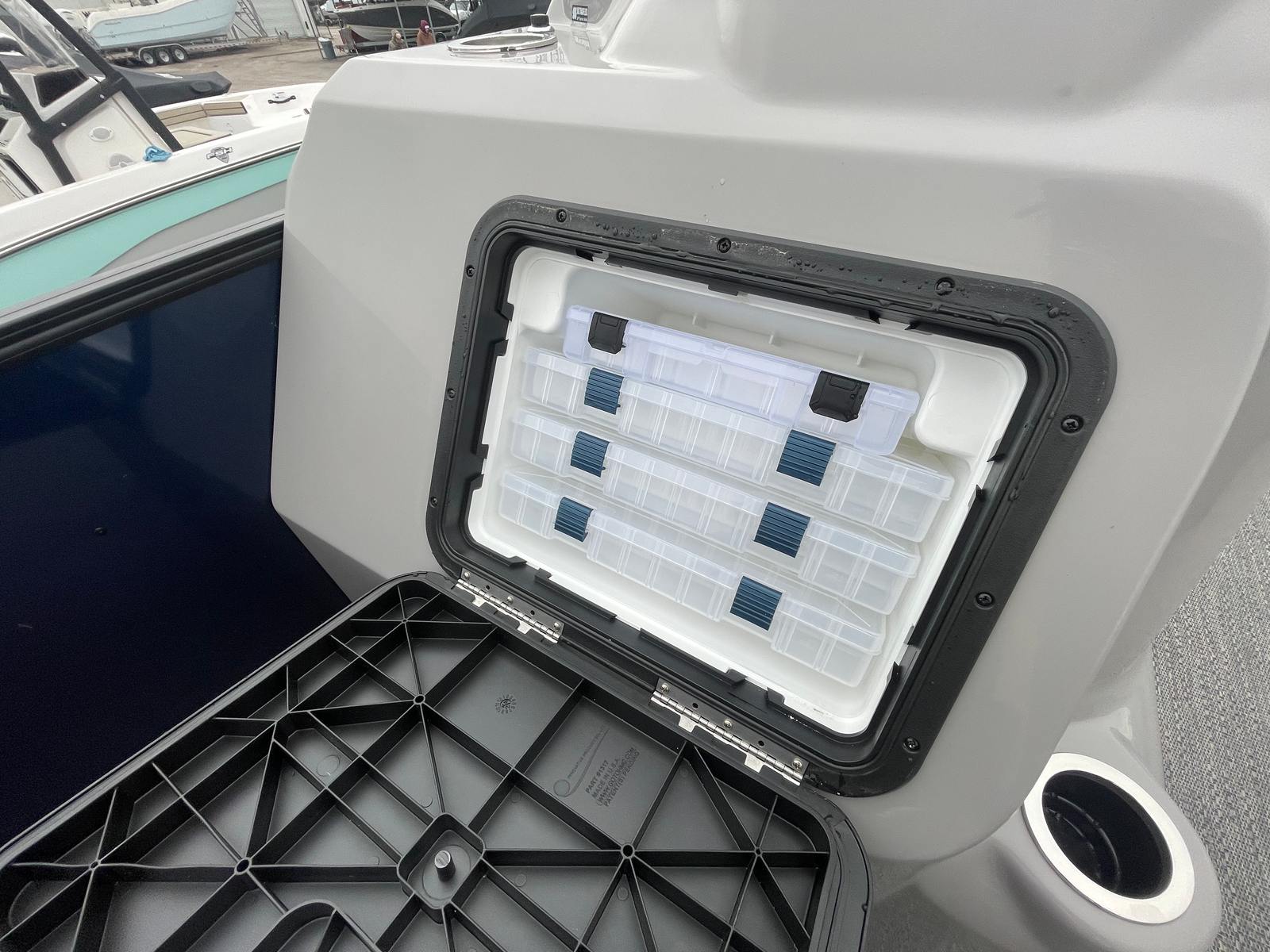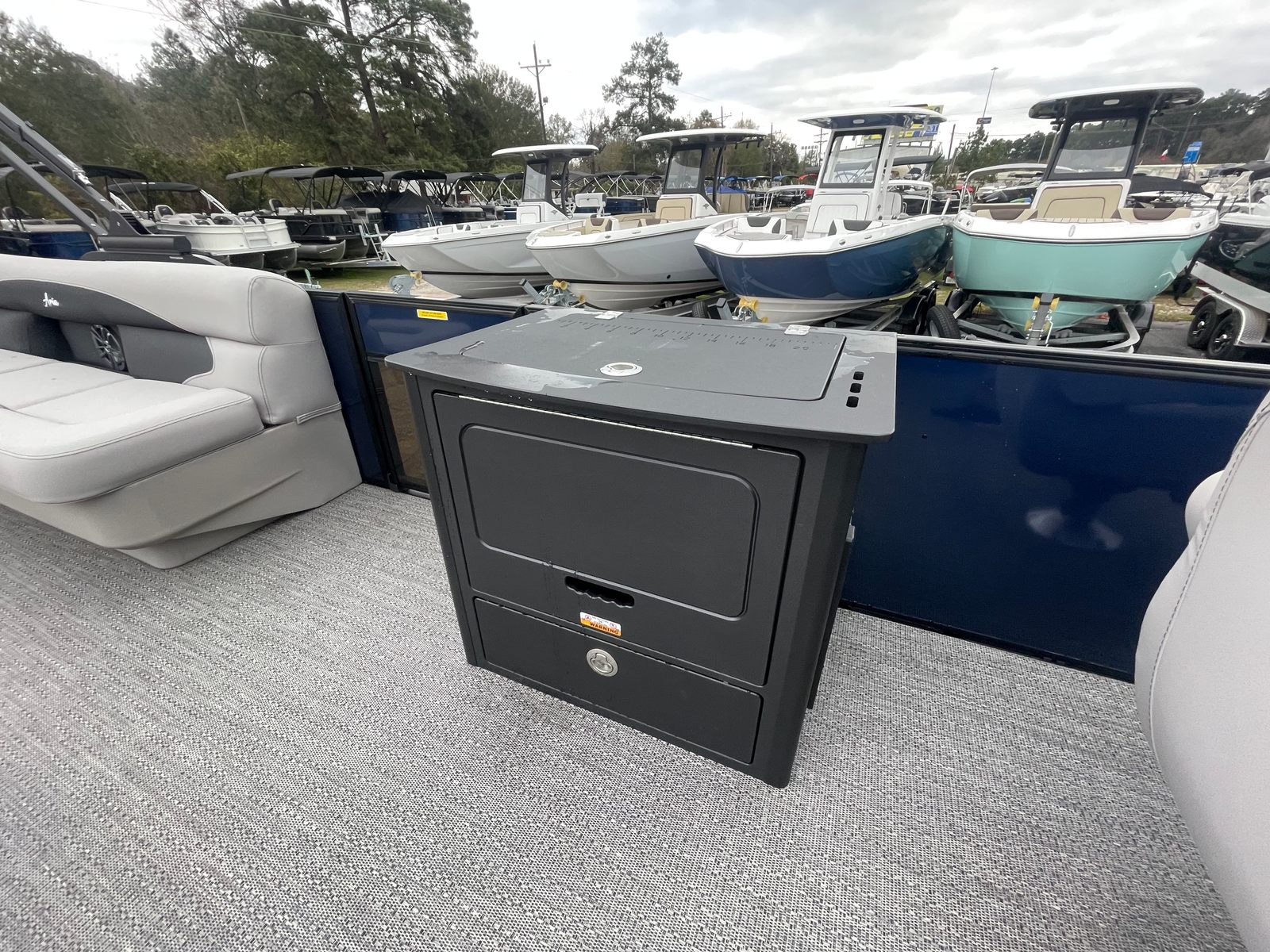 Step aboard the Barletta Aria A24F and experience a world of luxury and convenience. The furniture is finished in Tempest Gray, offering a plush and inviting atmosphere for passengers. The Amore Gray flooring is both stylish and practical, providing a durable surface that’s easy to maintain. The exterior is adorned with a stainless steel flag pole featuring an American flag, adding a patriotic touch to your boating adventures. The Triple Toon Package Aria further enhances the boat’s stability and performance, making it ideal for a variety of activities, from leisurely cruises to lively gatherings. Every detail, from the railskin packages to the rigging, reflects Barletta’s dedication to excellence and innovation.