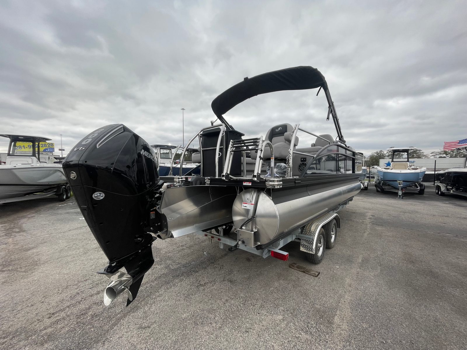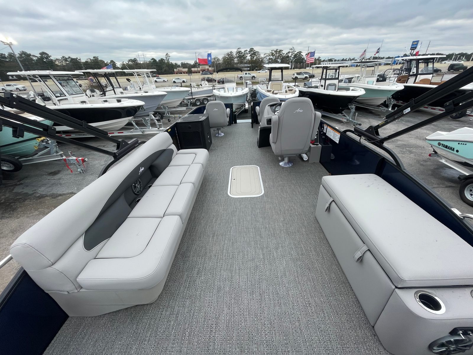The 2025 Barletta Aria A24F is a pontoon boat that measures an impressive 23 feet in length, offering ample space for entertaining, lounging, and enjoying the water. As a new model, it showcases the latest innovations and craftsmanship from Barletta, a brand renowned for its commitment to quality and luxury. The Aria A24F’s sleek profile is enhanced by the Railskin Color Aria in Blue Sapphire, complemented by the Railskin Accent Aria in Gray Moonstone. The Blackout Package Aria adds a touch of modern sophistication, making this pontoon boat a true head-turner wherever you go.