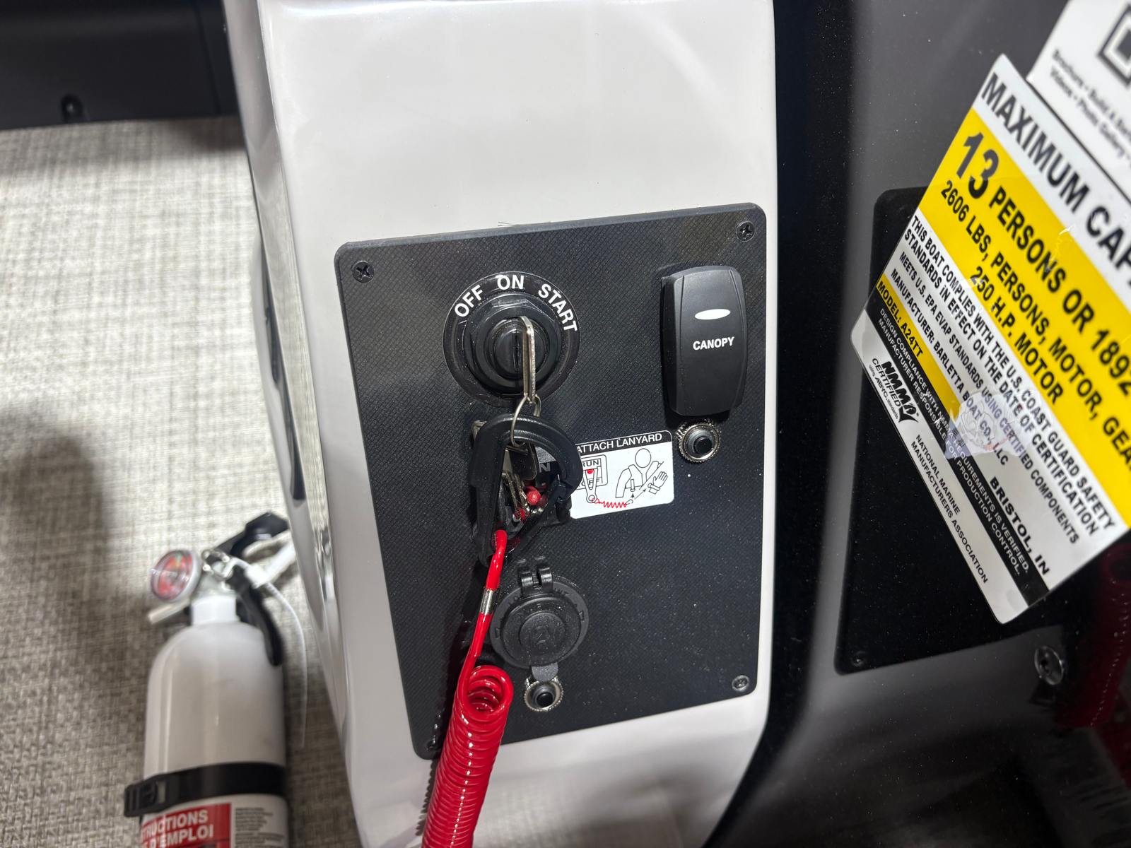 The Barletta Aria A24QC is loaded with features designed to enhance your time on the water. The Aria Blackout Package adds a bold, contemporary flair to the exterior, while the Black Diamond Railskin provides a striking visual impact. Inside, the Tempest Gray furniture offers plush seating for relaxation and socializing, complemented by the Amore Gray flooring that is both stylish and easy to maintain.For added convenience, the in-floor midship storage provides ample space for stowing gear, water toys, and personal items, keeping the deck clutter-free and organized. The clipped playpen cover with poles offers protection from the elements, ensuring your pontoon stays in pristine condition when not in use. The rigging includes a stainless steel prop for enhanced performance and longevity, while the Mercury pre-rig with power assist makes operating the boat smooth and responsive.