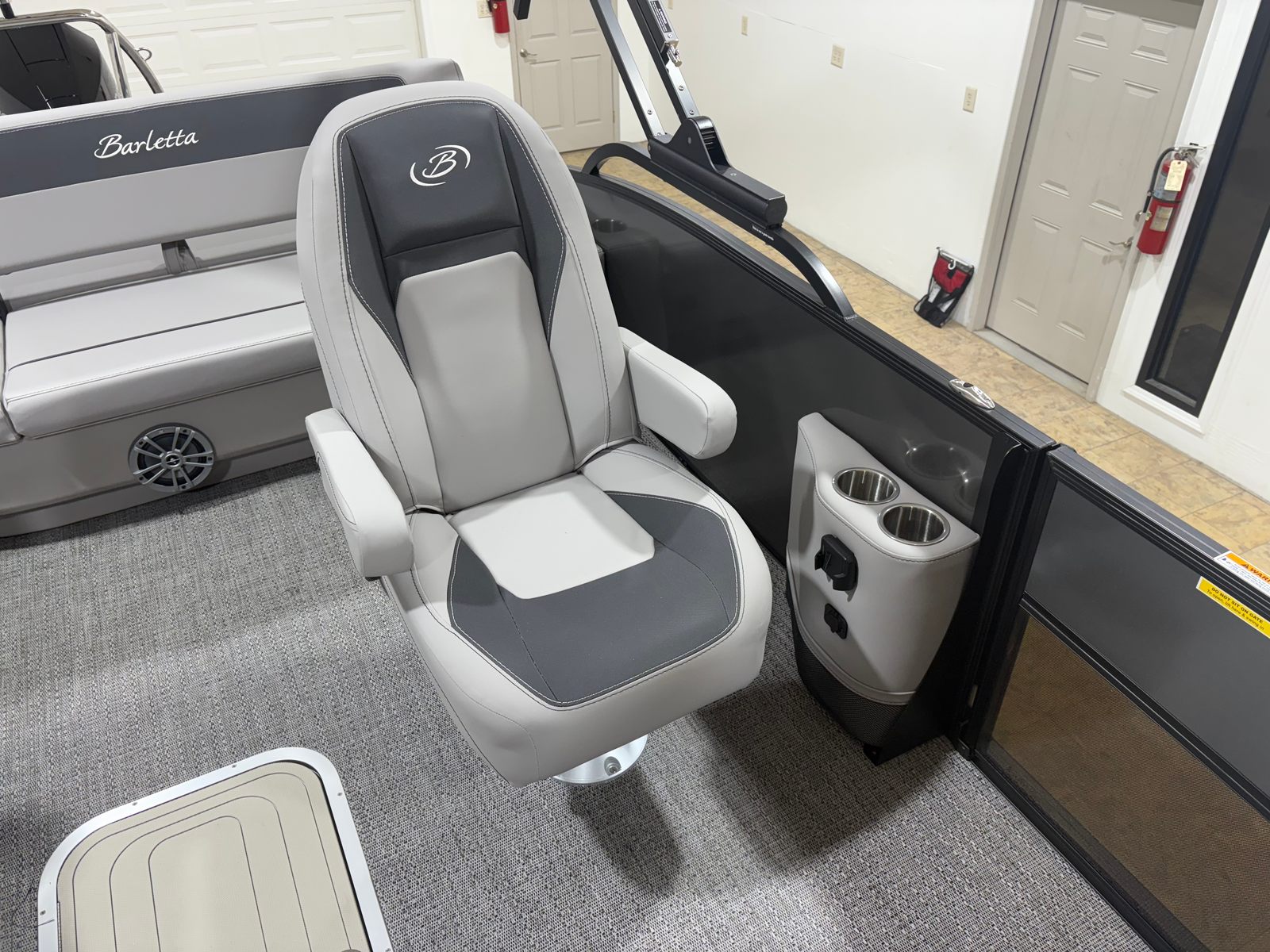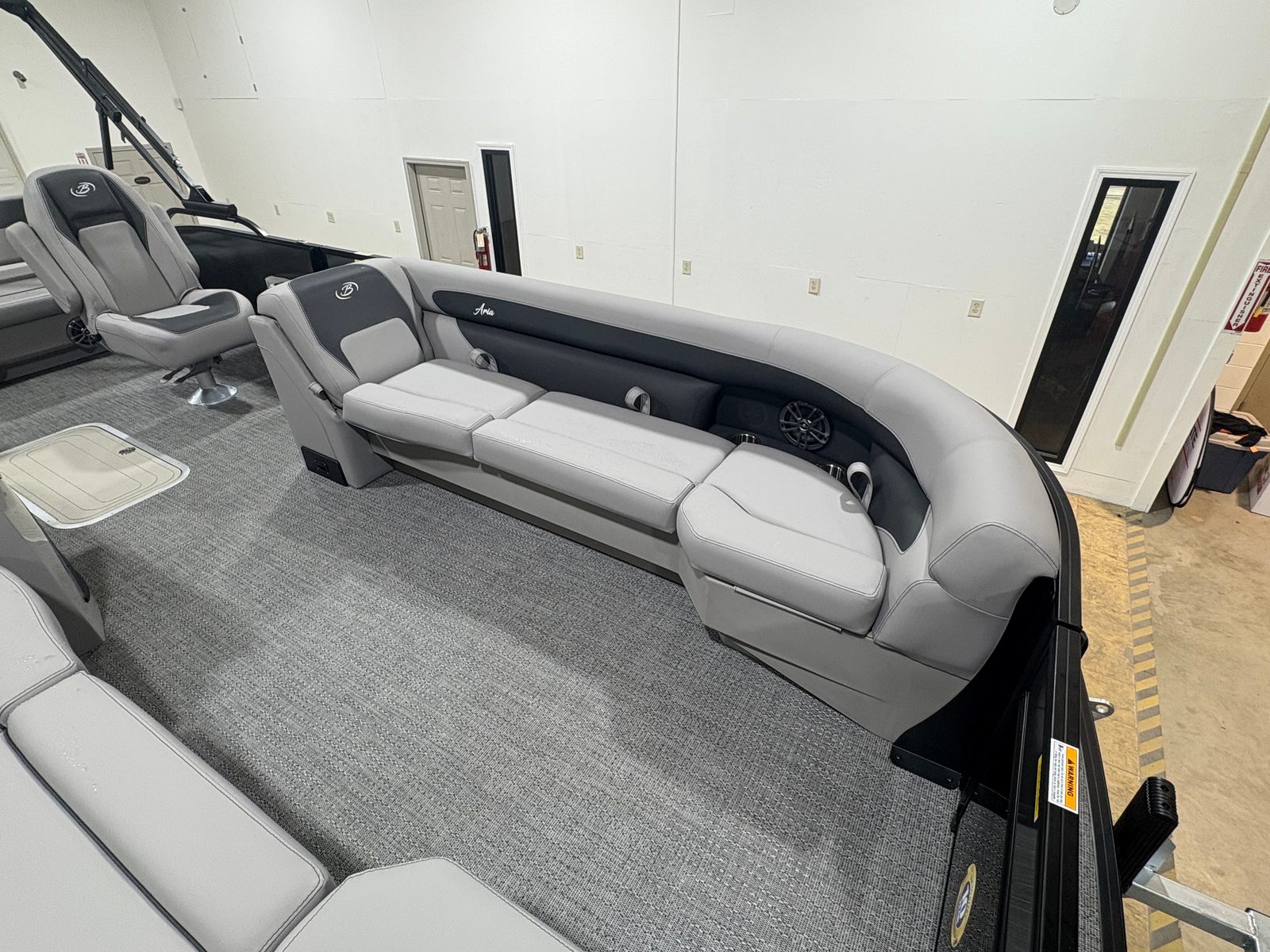 The Barletta Aria A24UC is packed with special features that elevate your boating experience. The Railskin Color Aria in Gray Moonstone and the Blackout Package Aria create a striking exterior that turns heads at every dock. The furniture, finished in Tempest Gray, offers plush seating and a sophisticated look, while the Amore Gray flooring provides both comfort and durability underfoot. The Triple Toon Package Aria enhances stability and ride quality, making this pontoon boat ideal for larger groups and choppy waters.Inside, you’ll find in-floor midship storage (available with the Triple Toon configuration), offering convenient space for gear, water toys, and personal items. The exterior is adorned with a stainless steel flag pole and an American flag, adding a touch of patriotic flair and elegance. Every detail, from the premium materials to the thoughtful layout, is designed to maximize comfort and usability.