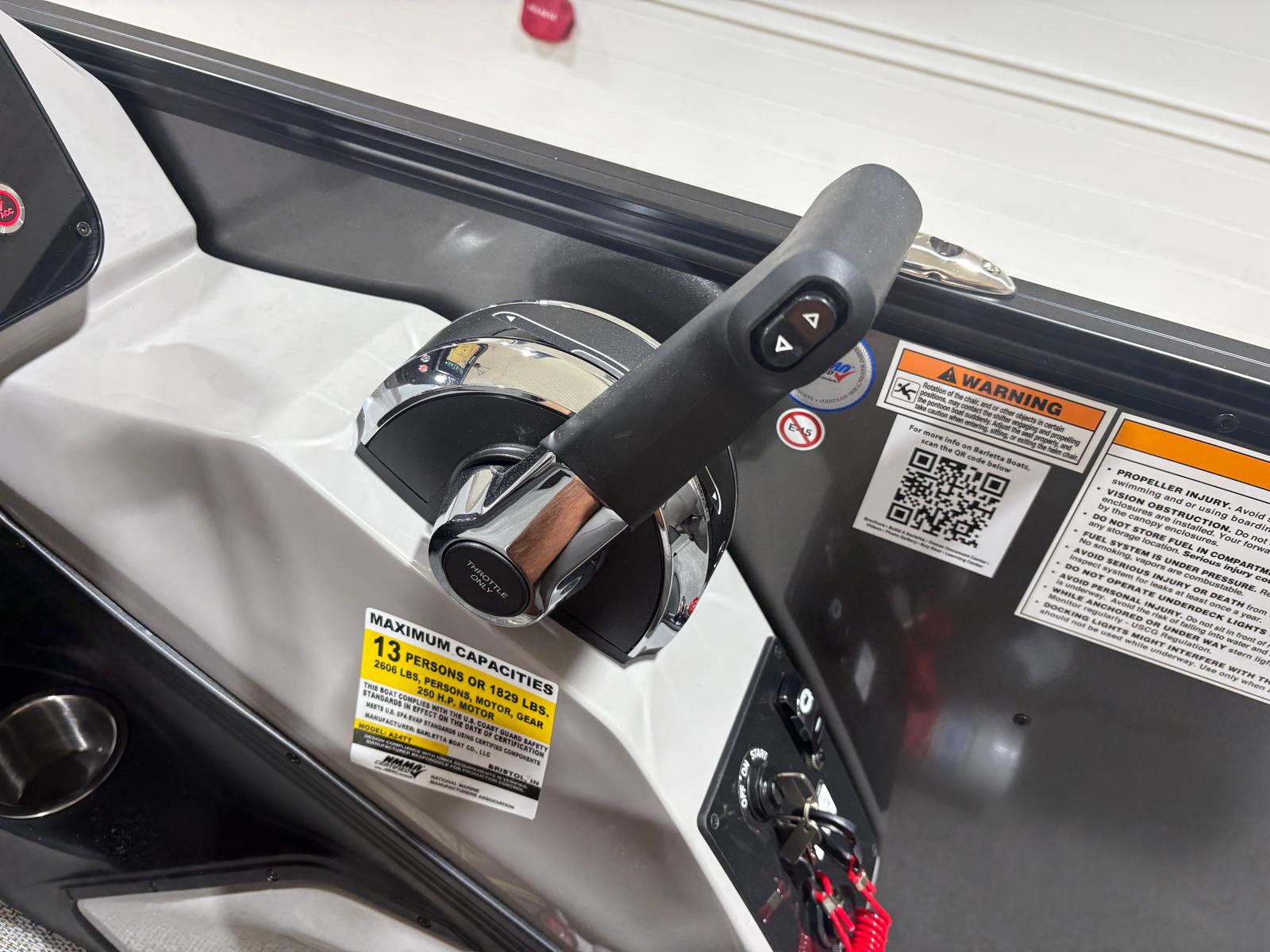 Powering the Barletta Aria A24UC is a robust Mercury 200L FourStroke engine, delivering a thrilling 200 horsepower. This single-engine setup ensures smooth acceleration, reliable cruising, and efficient fuel consumption, making every trip enjoyable and worry-free. The Mercury - Mechanical pre-rig with power assist (200HP) enhances handling and maneuverability, allowing you to navigate tight spaces and open waters with confidence. The rigging includes a stainless steel prop, optimizing performance and durability for years of adventure. Whether you’re cruising at a leisurely pace or picking up speed for watersports, the Aria A24UC’s engine package provides the power and reliability you expect from a premium pontoon boat.