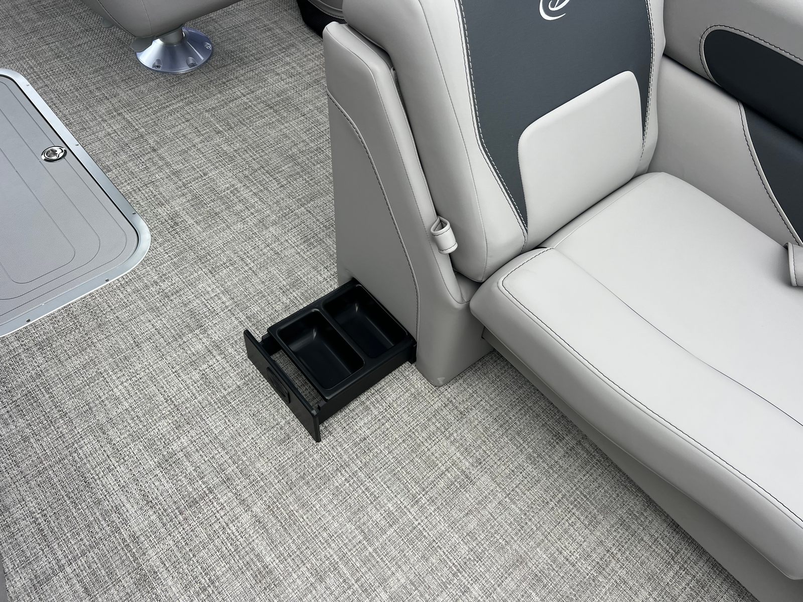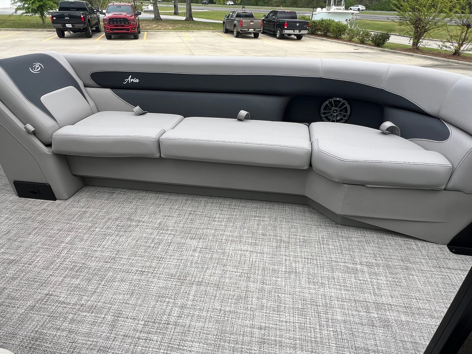 The Barletta Aria A24UC is packed with special features that elevate your boating experience. The Blackout Package Aria adds a bold, contemporary touch to the railskin, while the Black Diamond color scheme exudes elegance and style. The Tempest Gray furniture provides plush, supportive seating for all your guests, and the Amore Gray flooring is both attractive and easy to maintain. The Triple Toon Package Aria ensures superior buoyancy and handling, making this pontoon boat as capable as it is comfortable.For added convenience, the Aria A24UC includes a clipped playpen cover with poles, offering protection from the elements when your boat is not in use. The in-floor midship storage is perfect for stowing away gear, water toys, or personal items, keeping your deck clutter-free and organized. Every feature is thoughtfully designed to enhance your time on the water and make every outing more enjoyable.