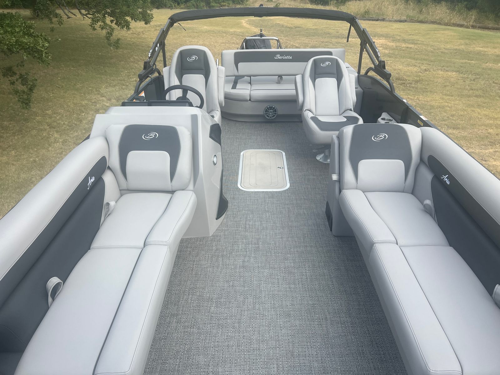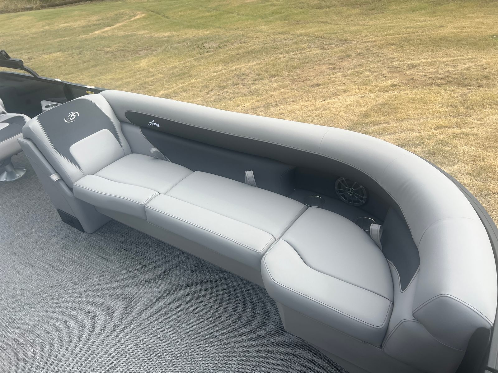 Step aboard and you’ll immediately notice the attention to detail in the Aria A24UC’s design. The Railskin Color Aria in Gray Moonstone and the Railskin Accent Aria in Black Diamond create a sophisticated, modern look, while the Blackout Package Aria adds a bold, distinctive touch. The furniture, finished in Tempest Gray, provides plush seating and a refined aesthetic, ensuring every passenger enjoys maximum comfort. The Amore Gray flooring is both stylish and practical, offering a soft surface that’s easy to clean and maintain.The Triple Toon Package Aria enhances the boat’s stability and buoyancy, making it ideal for larger groups and providing a smoother ride. The stainless steel flag pole with an American flag adds a patriotic flair, perfect for holiday outings or simply showing your pride on the water.