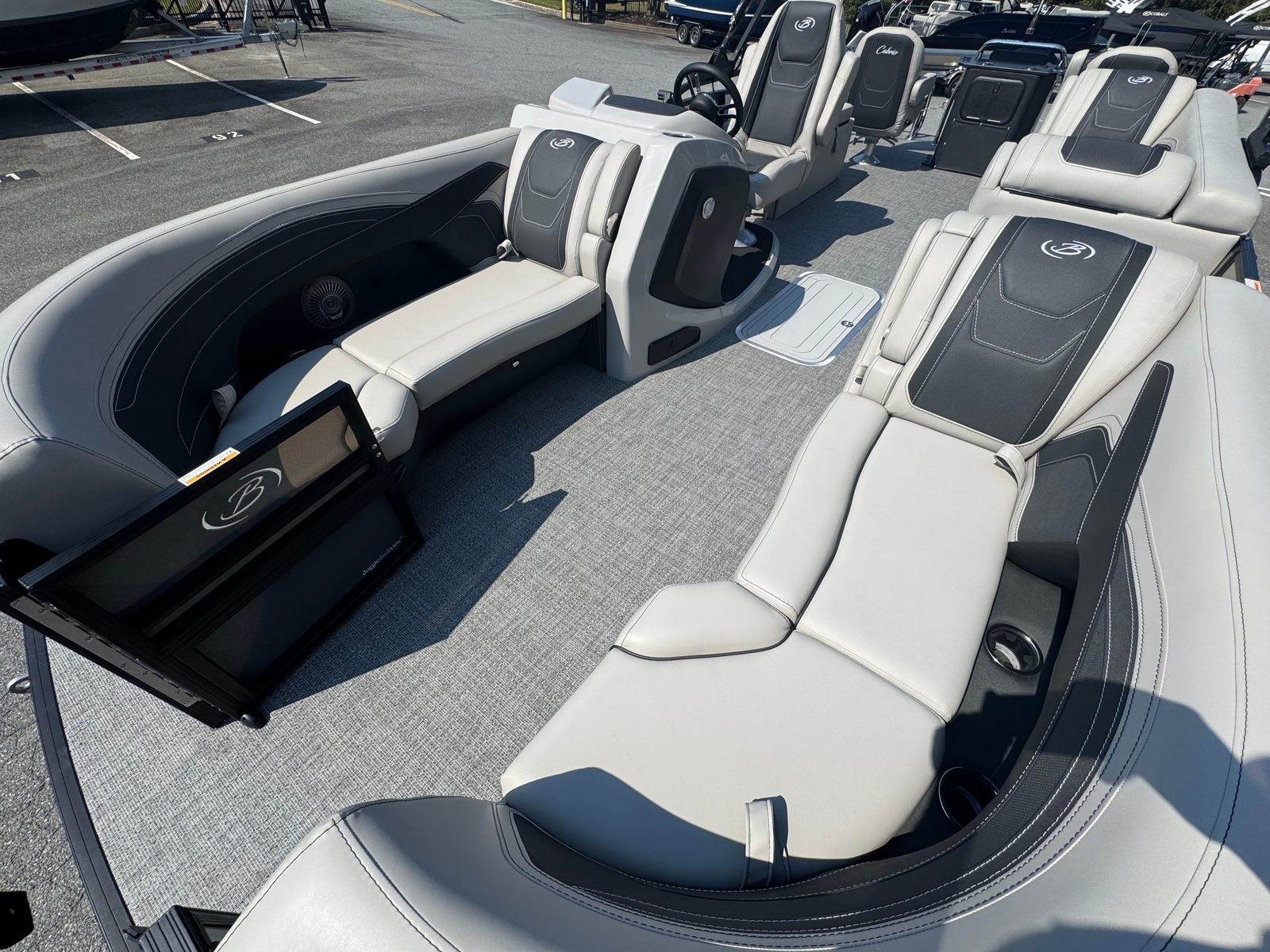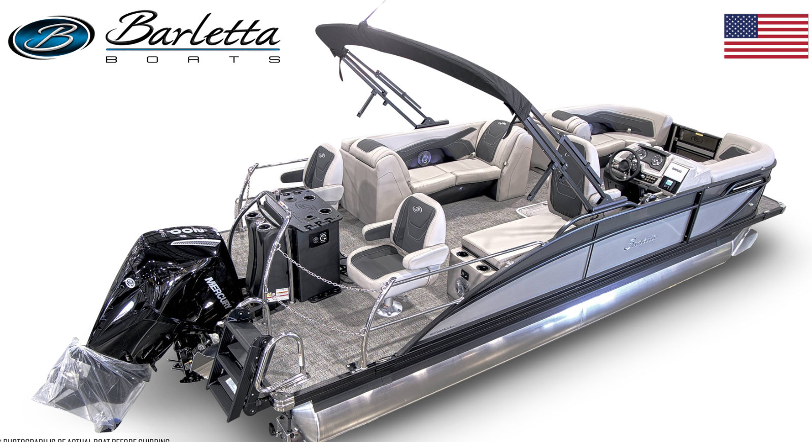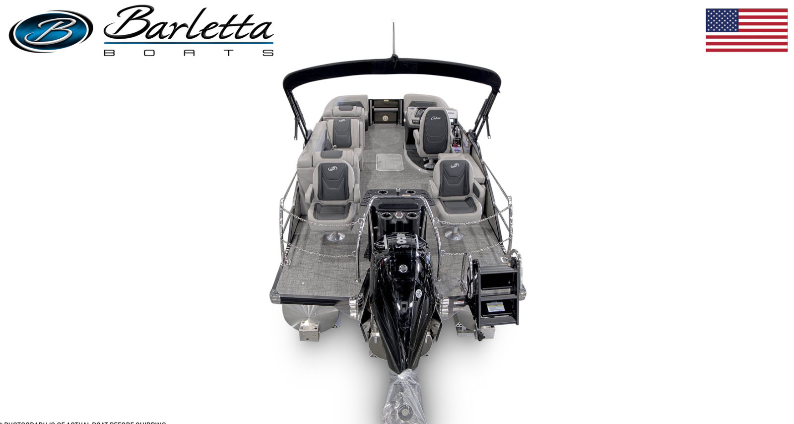 The Barletta Cabrio C22CC is packed with premium features designed to enhance your boating experience. The Triple Toon Package with Midship Storage – Cabrio adds stability and extra storage capacity, making it ideal for extended trips and larger groups. The interior boasts In Floor Midship Storage for CC with Rod Storage (requires Triple Toon), providing a convenient and secure place for fishing gear and other essentials. The flooring is finished in Amore Gray, offering a modern and easy-to-clean surface that complements the Marquesan Gray with Onyx furniture. The exterior is adorned with a Stainless Steel Flag Pole and American Flag, adding a touch of patriotic flair to your vessel.At the helm, you’ll find the Simrad 7" G07 XSR Chartplotter/Multifunction Display (does not include engine communication – dealer add except with digital rig), which provides advanced navigation and system monitoring capabilities. This feature ensures you stay informed and in control, no matter where your adventures take you.