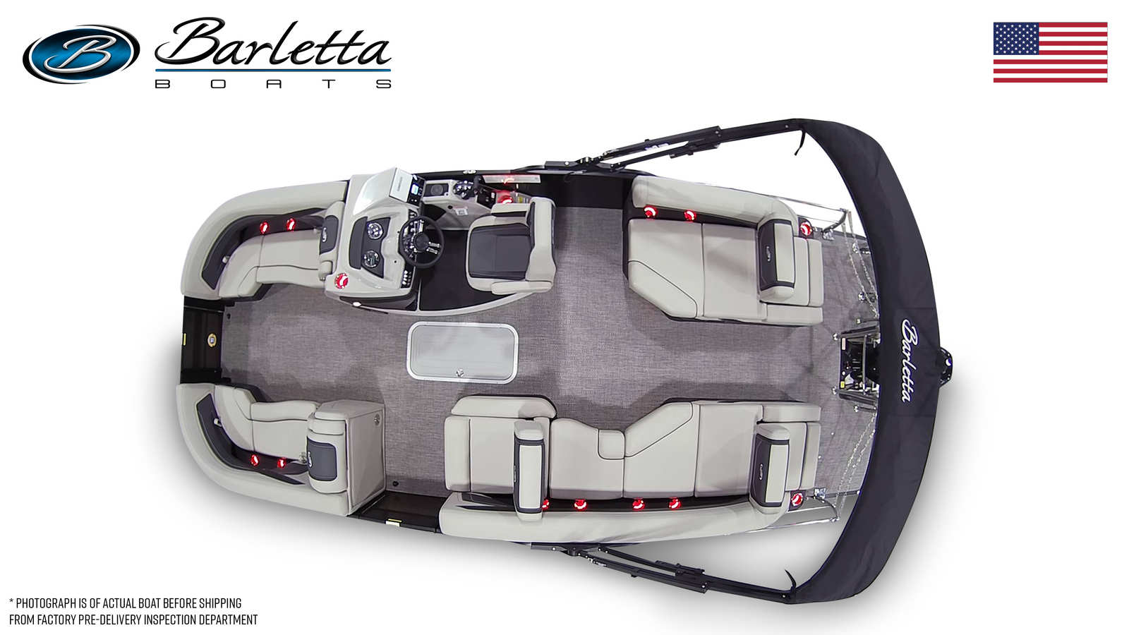 Step aboard the Barletta Cabrio C22M and you’ll immediately notice the attention to detail and premium finishes throughout. The Marquesan Gray furniture with Onyx accents creates a sophisticated and inviting atmosphere, while the Amore Gray flooring adds a touch of elegance and durability. The interior RGB lighting package allows you to set the mood for any occasion, whether you’re hosting a sunset cocktail party or enjoying a quiet evening cruise. The stainless steel flag pole with an American flag adds a patriotic flair to the exterior, complementing the boat’s striking Black Diamond Railskin and Blackout Package Cabrio.The Triple Toon Package with midship storage is a standout feature, providing additional buoyancy and stability for a smoother ride. This package also offers convenient storage solutions for your gear, keeping the deck clutter-free and organized. The rigging includes a stainless steel prop for enhanced performance and longevity, ensuring you get the most out of every boating adventure.