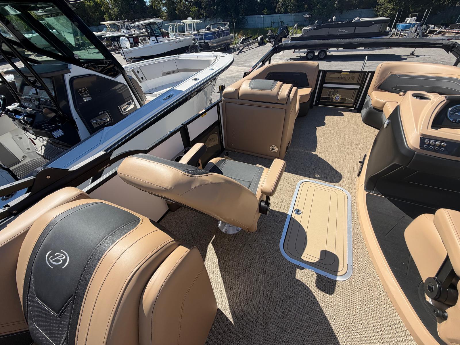 The Barletta Cabrio C22QC is packed with special features that elevate your boating experience. The Coastal Edition Cabrio ensures enhanced durability and style, making it ideal for a variety of environments. The Triple Toon Package with midship storage adds stability and extra space, allowing for smoother rides and convenient storage solutions. The furniture is finished in Carmella Tan with Onyx accents, providing plush seating and a luxurious atmosphere. The Amore Tan flooring complements the overall design, creating a warm and inviting space for you and your guests. Every detail, from the railskin packages to the premium upholstery, is thoughtfully crafted to deliver comfort and elegance.