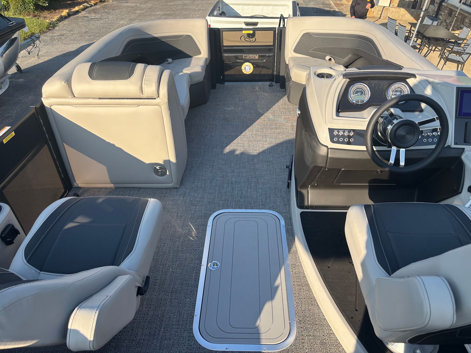 The 2026 Barletta Cabrio C22QC is loaded with features that elevate your boating experience. The Blackout Package Cabrio railskin adds a sleek, modern touch to the exterior, while the stainless steel prop ensures durability and optimal performance. Inside, the Marquesan Gray furniture with Onyx accents creates a sophisticated and inviting atmosphere, perfectly complemented by the Amore Gray flooring for a cohesive and stylish look.For those who appreciate advanced technology, the helm is equipped with a Simrad 7" G07 XSR chartplotter and multifunction display, providing essential navigation tools at your fingertips. The interior RGB lighting package allows you to set the mood for any occasion, while the stainless steel flag pole with an American flag adds a patriotic flair to your vessel. The Triple Toon Package with midship storage not only enhances performance but also offers convenient space for your gear and essentials, keeping the deck clutter-free and organized.