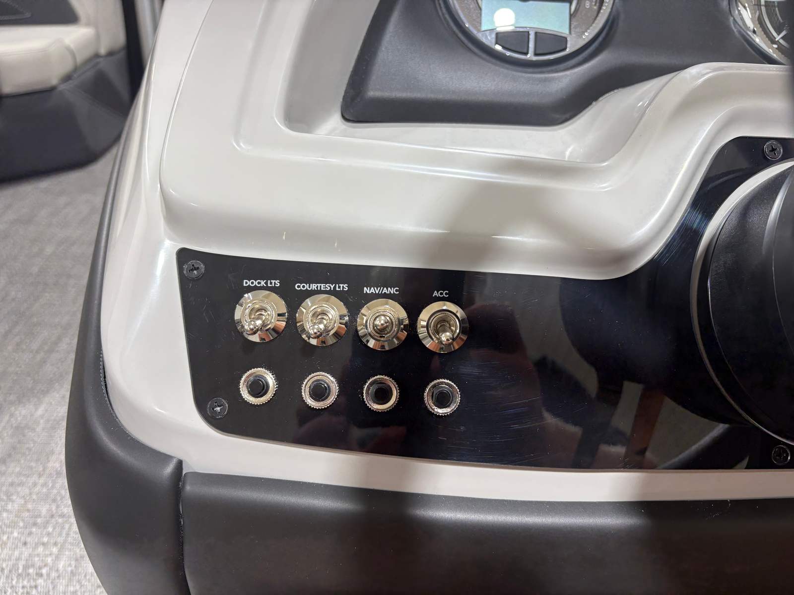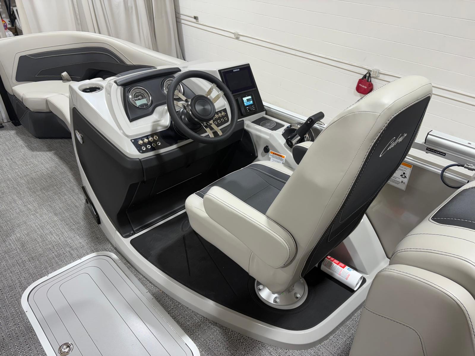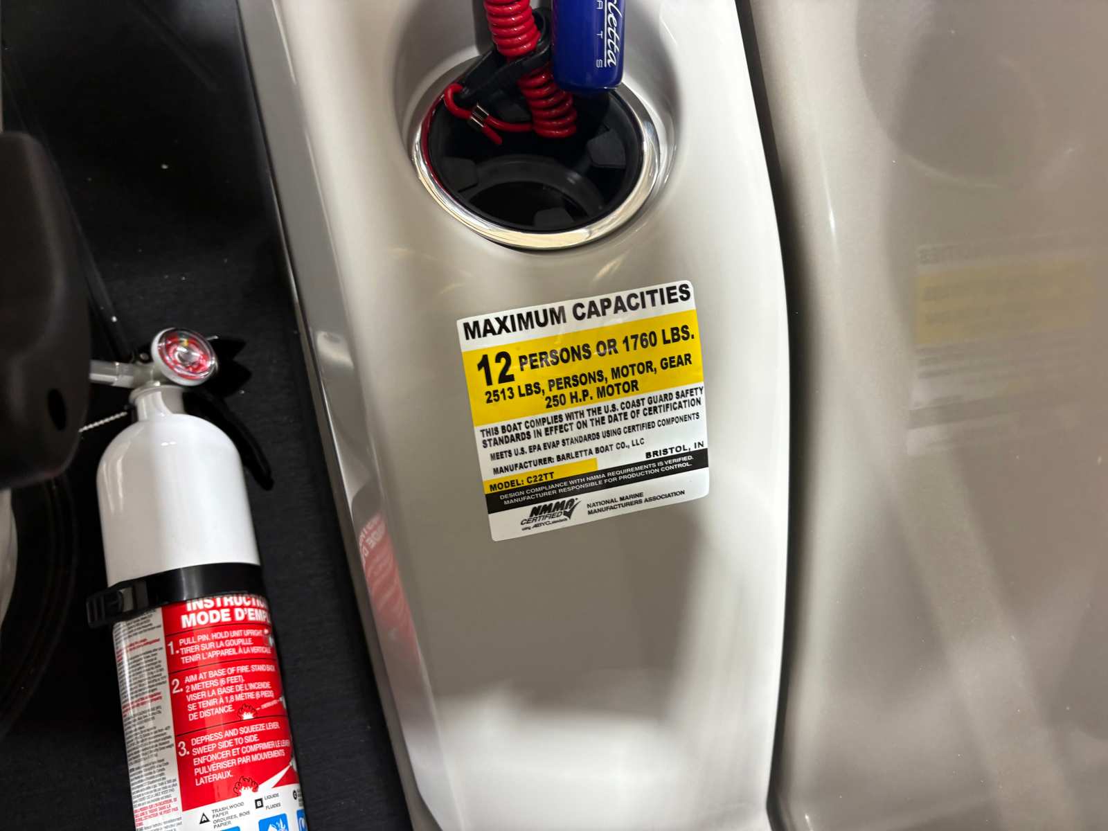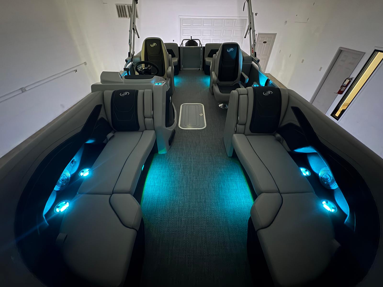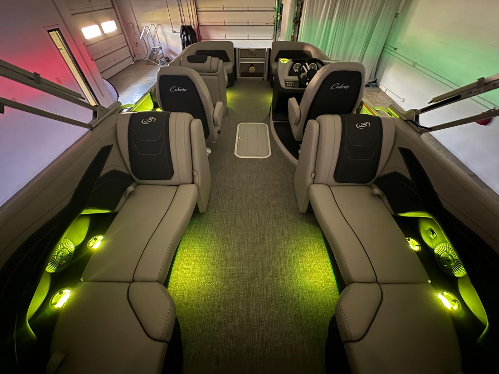 Step aboard and experience a world of comfort and innovation. The Cabrio C22QC boasts a Triple Toon Package with midship storage, maximizing both stability and onboard space. The Marquesan Gray furniture with Onyx accents provides a sophisticated and inviting atmosphere, while the Amore Gray flooring offers durability and easy maintenance. The exterior is adorned with a stainless steel flag pole featuring an American flag, adding a touch of patriotism and elegance.Lighting is a standout feature, with white underdeck and underwater exterior lighting that creates a captivating ambiance for evening cruises and dockside gatherings. The railskin color in Gray Moonstone, complemented by the Champagne accent, gives the boat a refined, modern look that’s sure to impress. Every detail, from the furniture to the flooring, has been thoughtfully selected to enhance your boating experience.