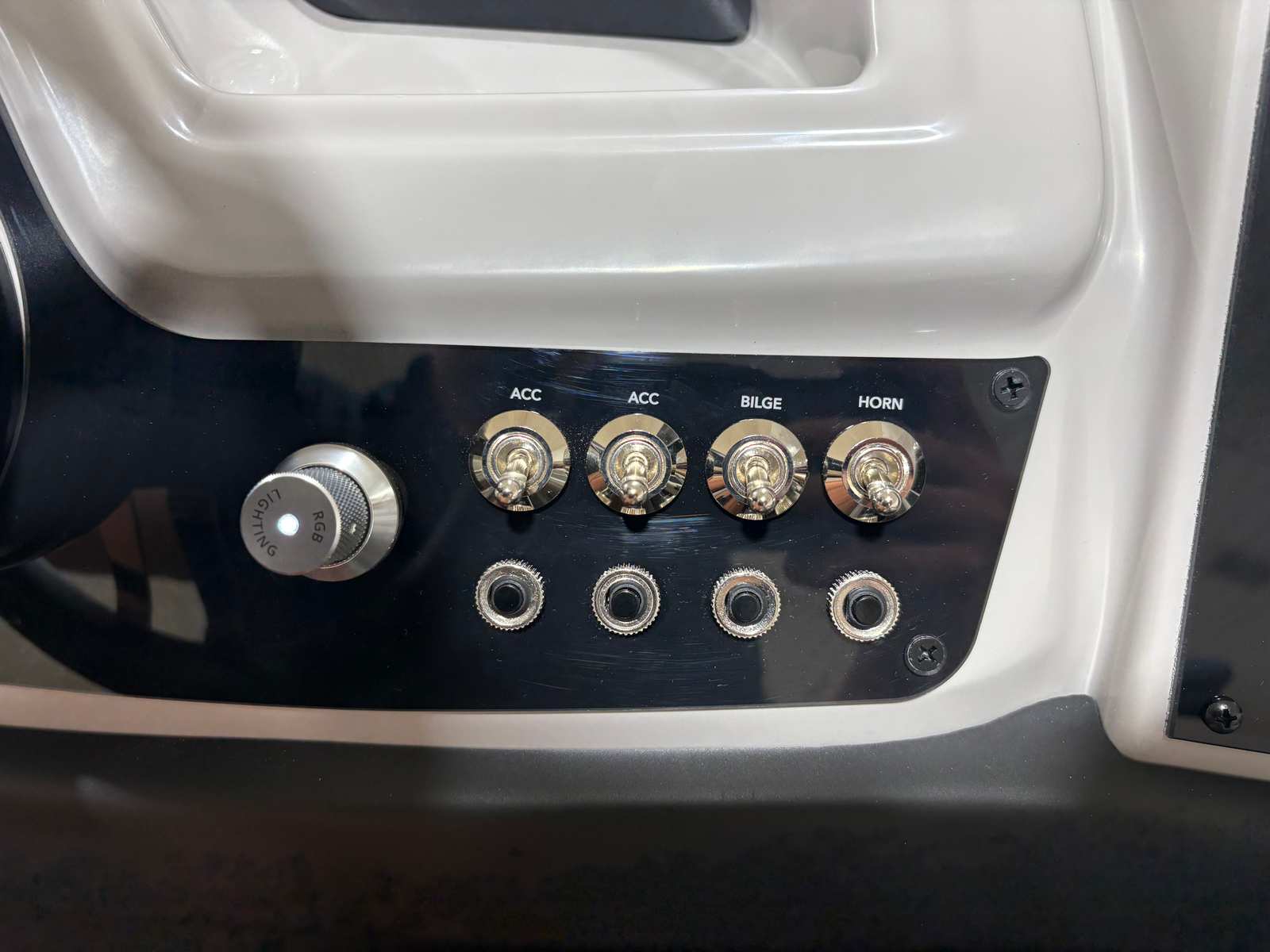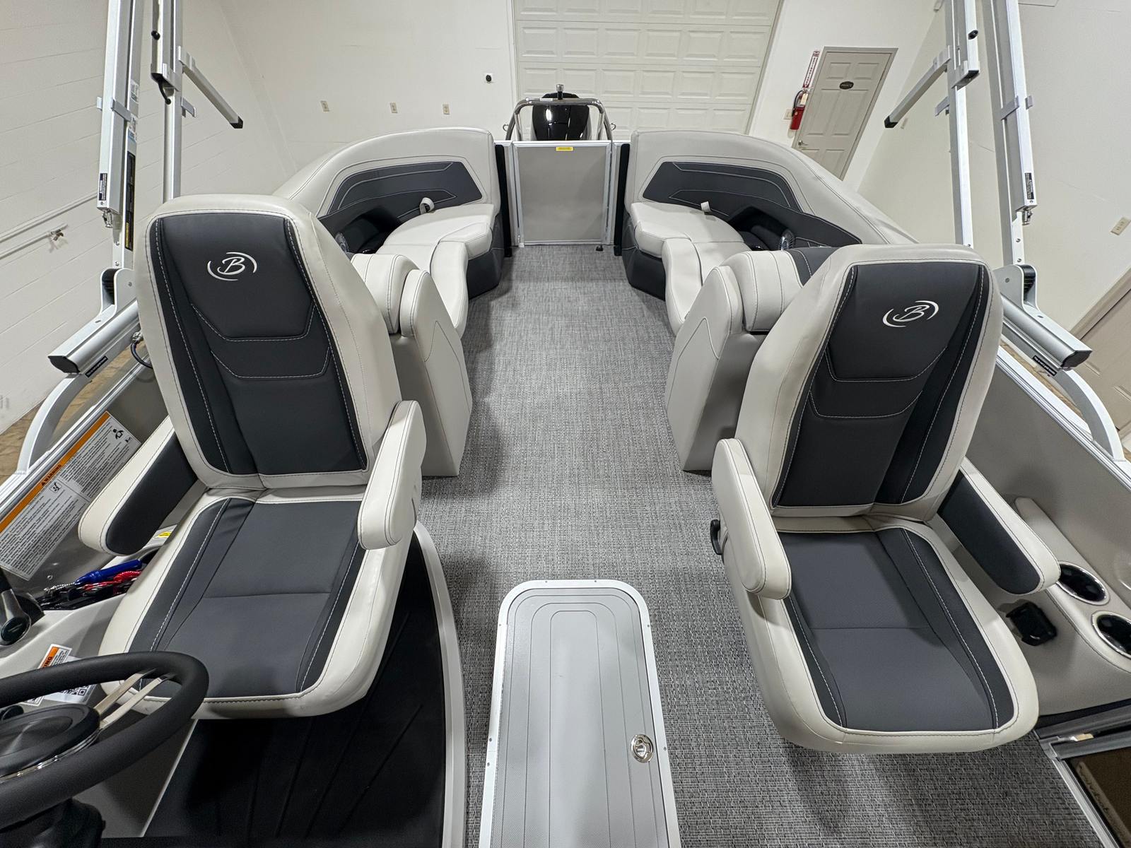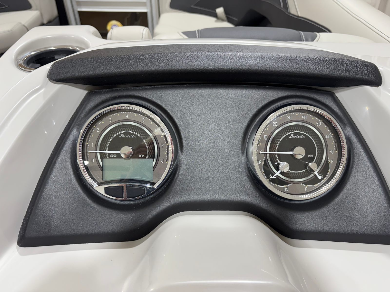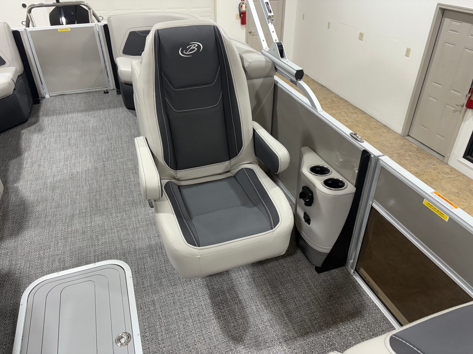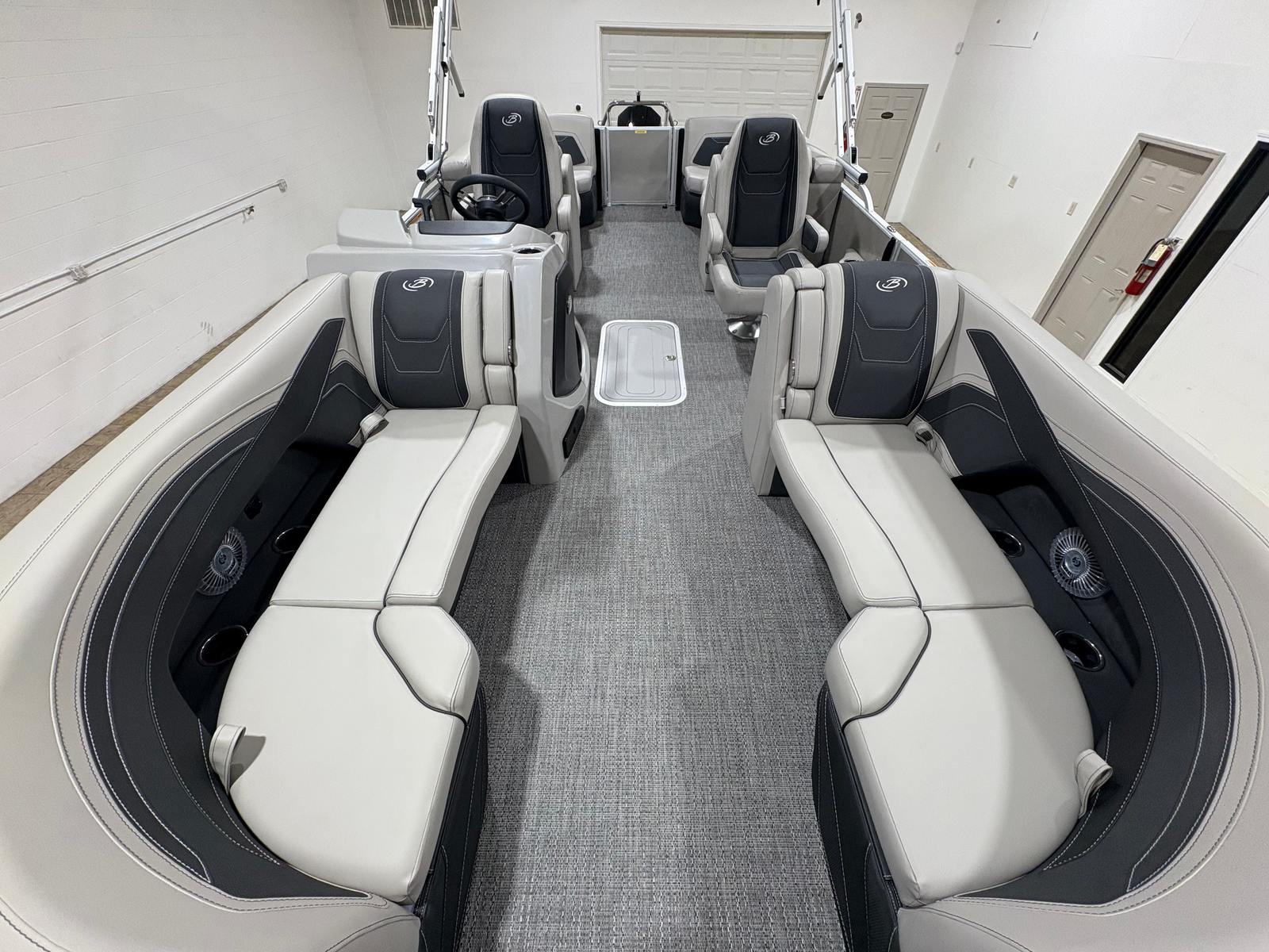 Step aboard and experience a world of comfort and innovation. The Cabrio C22QC boasts a Triple Toon Package with midship storage, maximizing both stability and onboard space. The Marquesan Gray furniture with Onyx accents provides a sophisticated and inviting atmosphere, while the Amore Gray flooring offers durability and easy maintenance. The exterior is adorned with a stainless steel flag pole featuring an American flag, adding a touch of patriotism and elegance.Lighting is a standout feature, with white underdeck and underwater exterior lighting that creates a captivating ambiance for evening cruises and dockside gatherings. The railskin color in Gray Moonstone, complemented by the Champagne accent, gives the boat a refined, modern look that’s sure to impress. Every detail, from the furniture to the flooring, has been thoughtfully selected to enhance your boating experience.