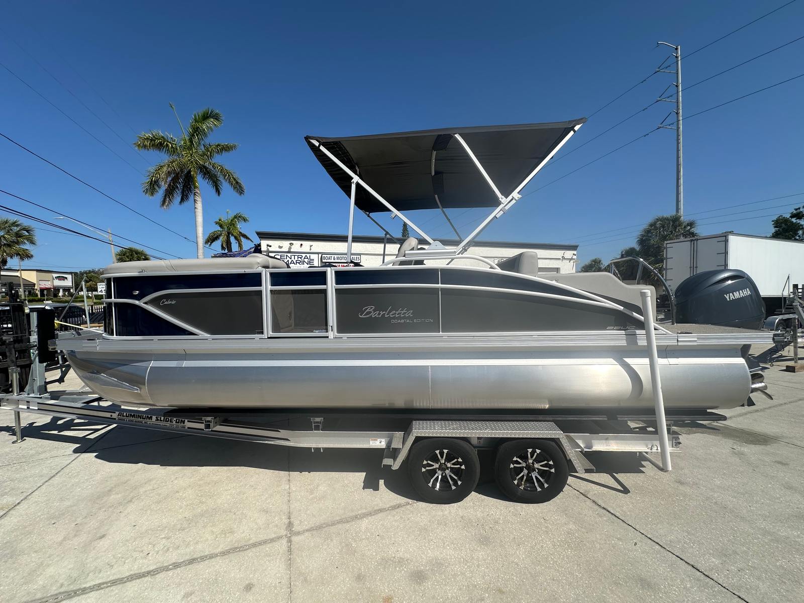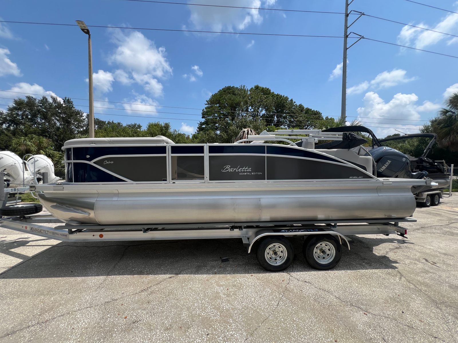 This pontoon boat for sale is packed with special features that elevate your boating experience. The striking Blue Sapphire railskin color, complemented by the Gray Moonstone accent, gives the Barletta Cabrio C22UC a distinctive and elegant appearance. Inside, the Marquesan Gray furniture with Charcoal accents provides plush seating and a modern aesthetic, while the Amore Gray flooring adds a touch of sophistication and is easy to maintain. The Coastal Edition Cabrio package brings added durability and style, making this pontoon ideal for a variety of water conditions.The Triple Toon Package with midship storage offers enhanced stability and additional space for storing gear, water toys, or personal items, keeping the deck clutter-free and organized. The Yamaha (M) F200LC engine is renowned for its reliability and fuel efficiency, ensuring you spend more time enjoying the water and less time refueling. The stainless steel prop and mechanical rigging contribute to the boat’s overall performance and longevity, while power assist steering provides effortless control, making docking and maneuvering a breeze.