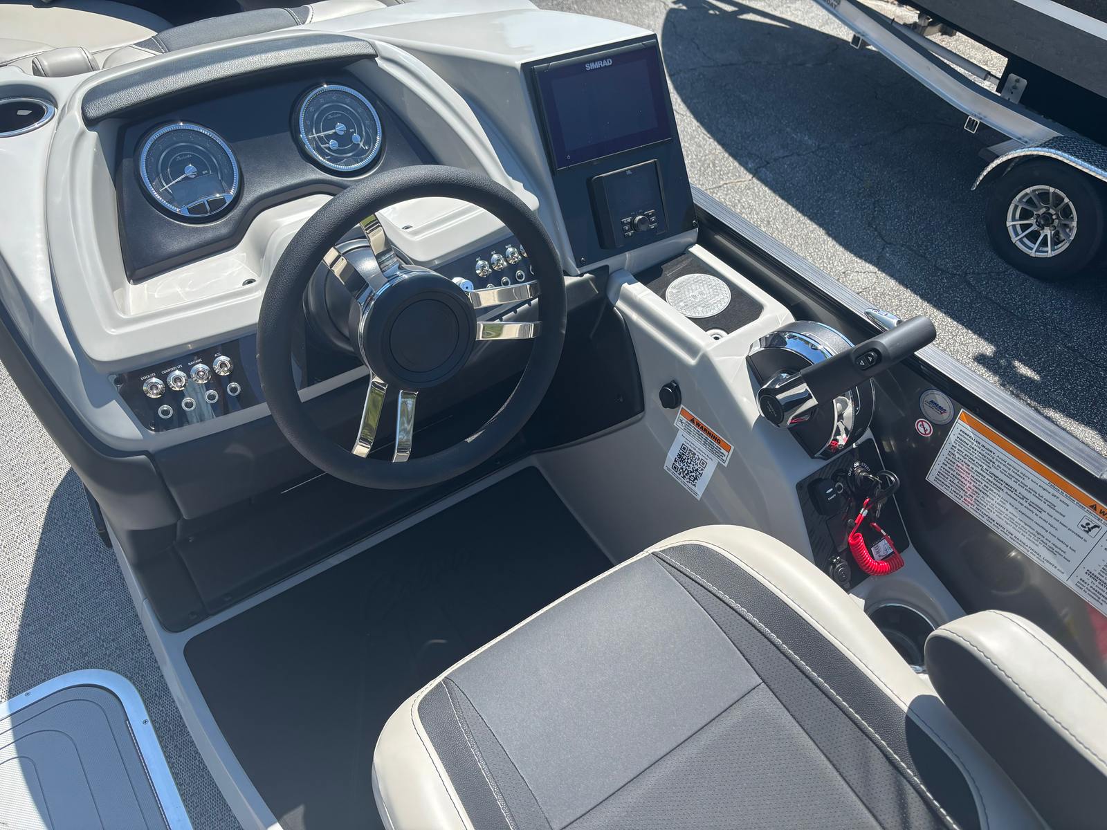 Step aboard the Cabrio C22UC and immerse yourself in a world of comfort and style. The Marquesan Gray with Onyx furniture creates a welcoming and upscale atmosphere, while the Amore Gray flooring adds a touch of elegance and is easy to maintain. The interior RGB lighting package allows you to set the mood for any occasion, whether you’re hosting a sunset cocktail hour or enjoying a quiet evening cruise. The triple toon package with midship storage not only boosts performance but also provides convenient space for stowing gear and water toys. Show your patriotic spirit with the stainless steel flag pole and American flag, a distinctive touch that sets your pontoon apart. Every detail, from the railskin blackout package to the stainless steel prop, is designed to enhance your boating experience and ensure lasting satisfaction.