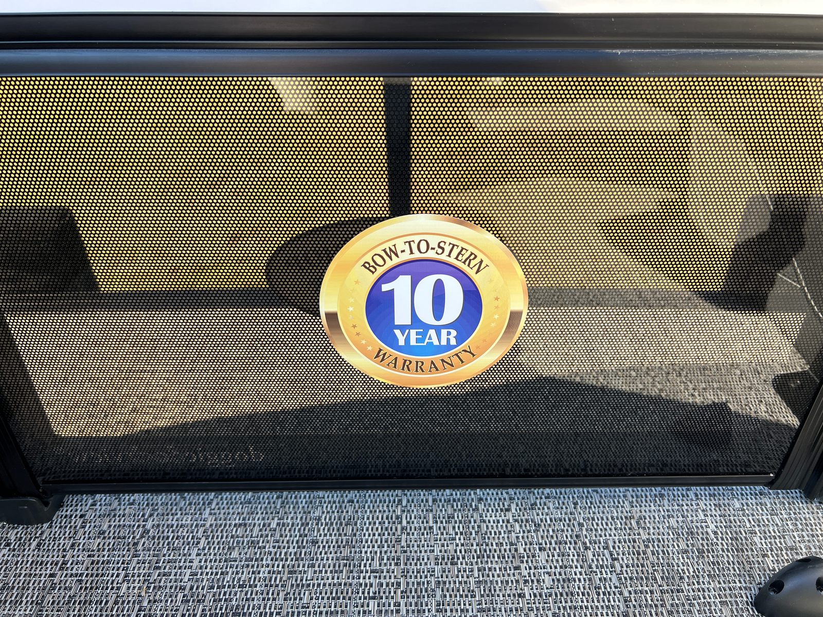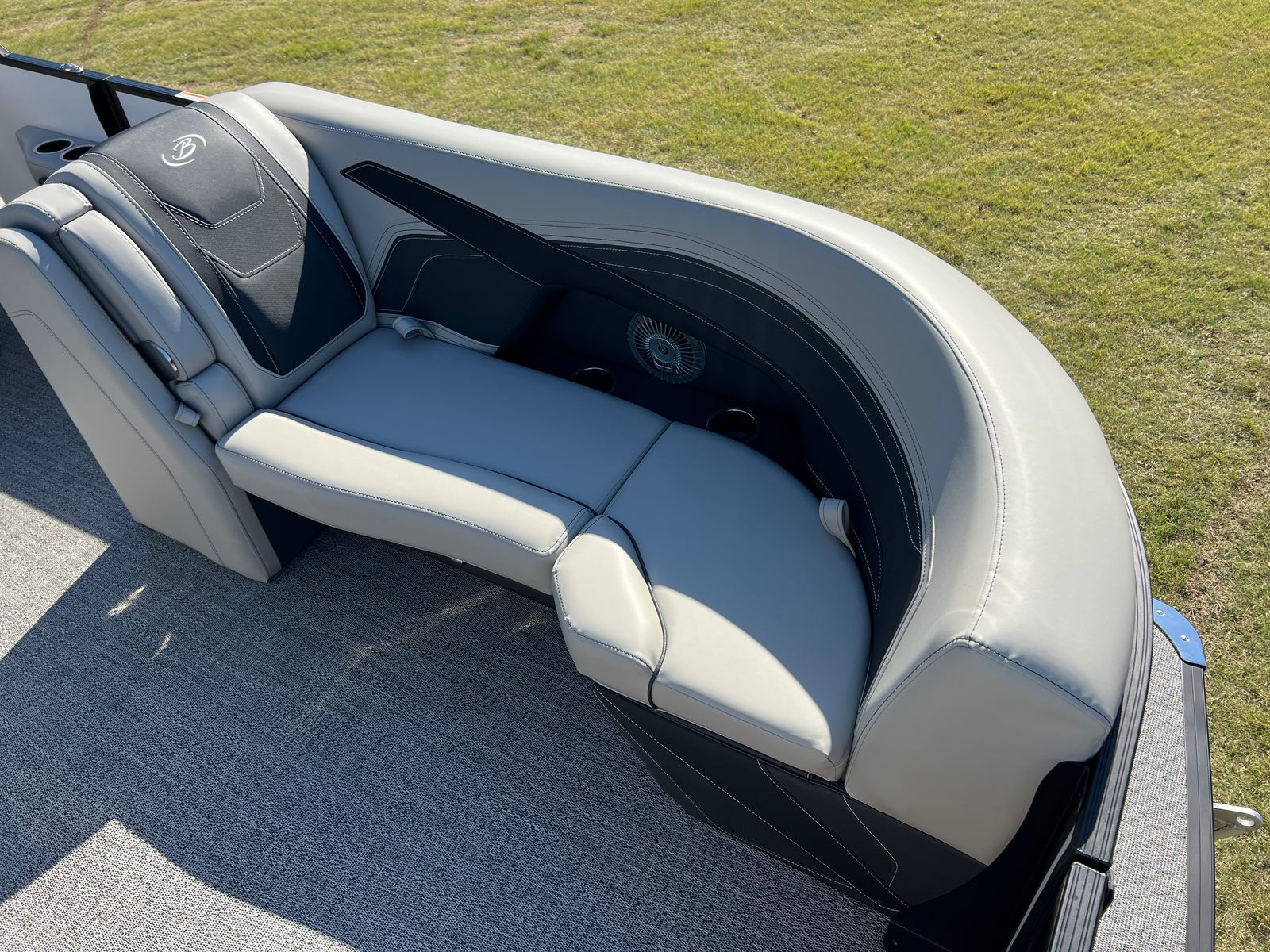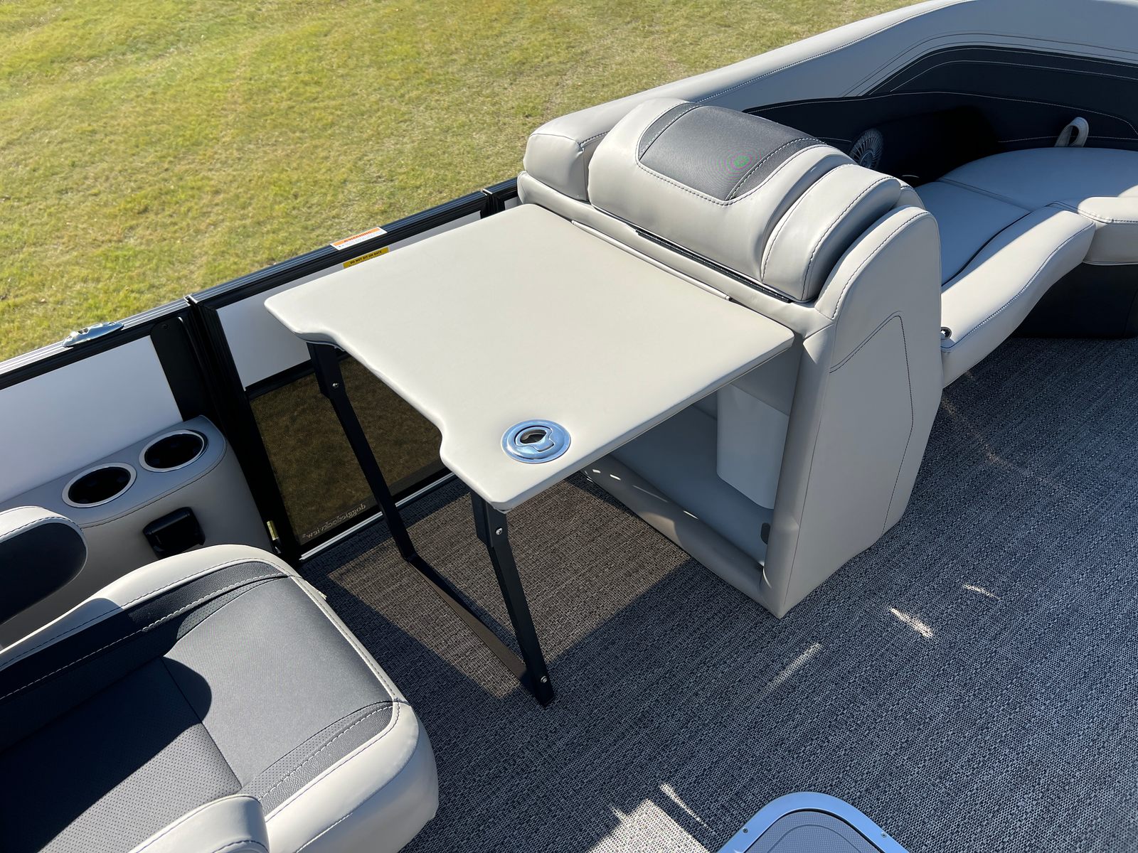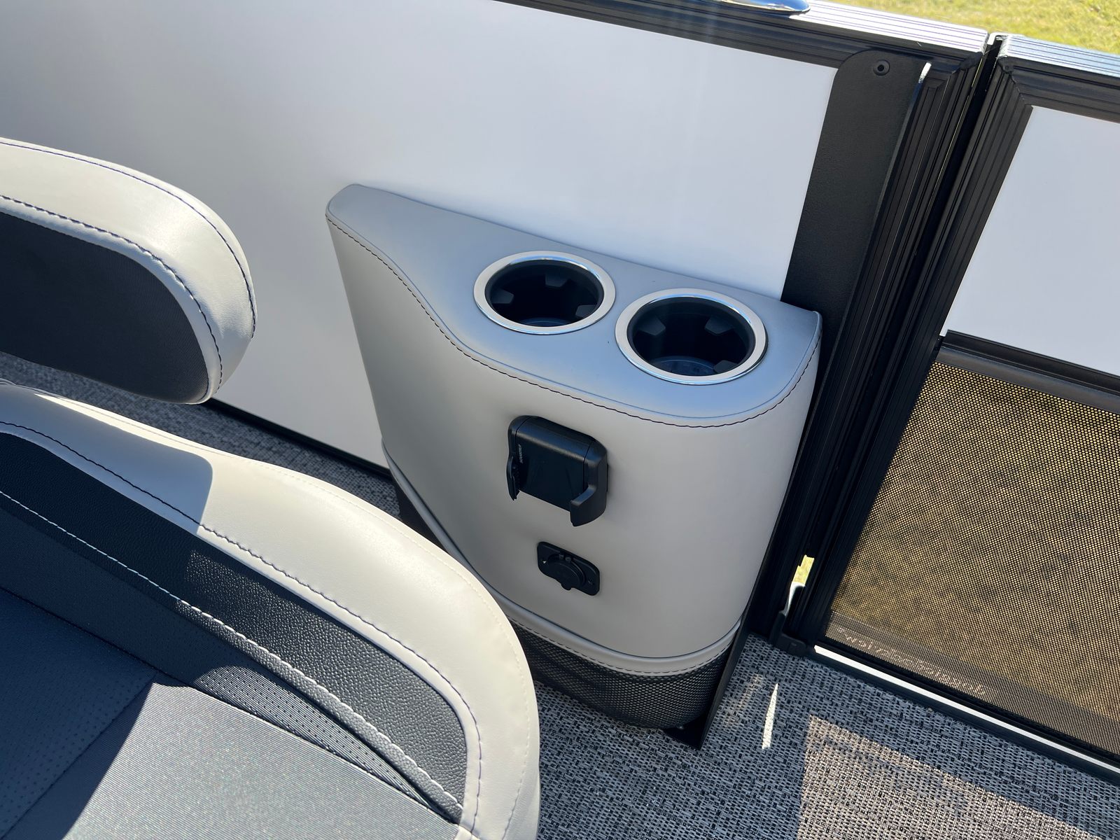 Step aboard the Cabrio C22UC and discover a world of premium features designed for comfort and style. The railskin color in Champagne, accented with Winter White, creates a sophisticated exterior that stands out on the water. The Blackout Package Cabrio adds a sleek, modern touch, while the Marquesan Gray furniture with Onyx accents provides a plush and inviting atmosphere for passengers. The Amore Gray flooring is both stylish and practical, offering a durable surface that’s easy to maintain.The triple toon package with midship storage is a game-changer for those who value organization and convenience. This feature provides ample space for stowing gear, water toys, and personal items, keeping the deck clutter-free and ready for fun. The stainless steel flag pole with an American flag adds a patriotic flair, making this pontoon boat a true showstopper at any marina or waterfront event.