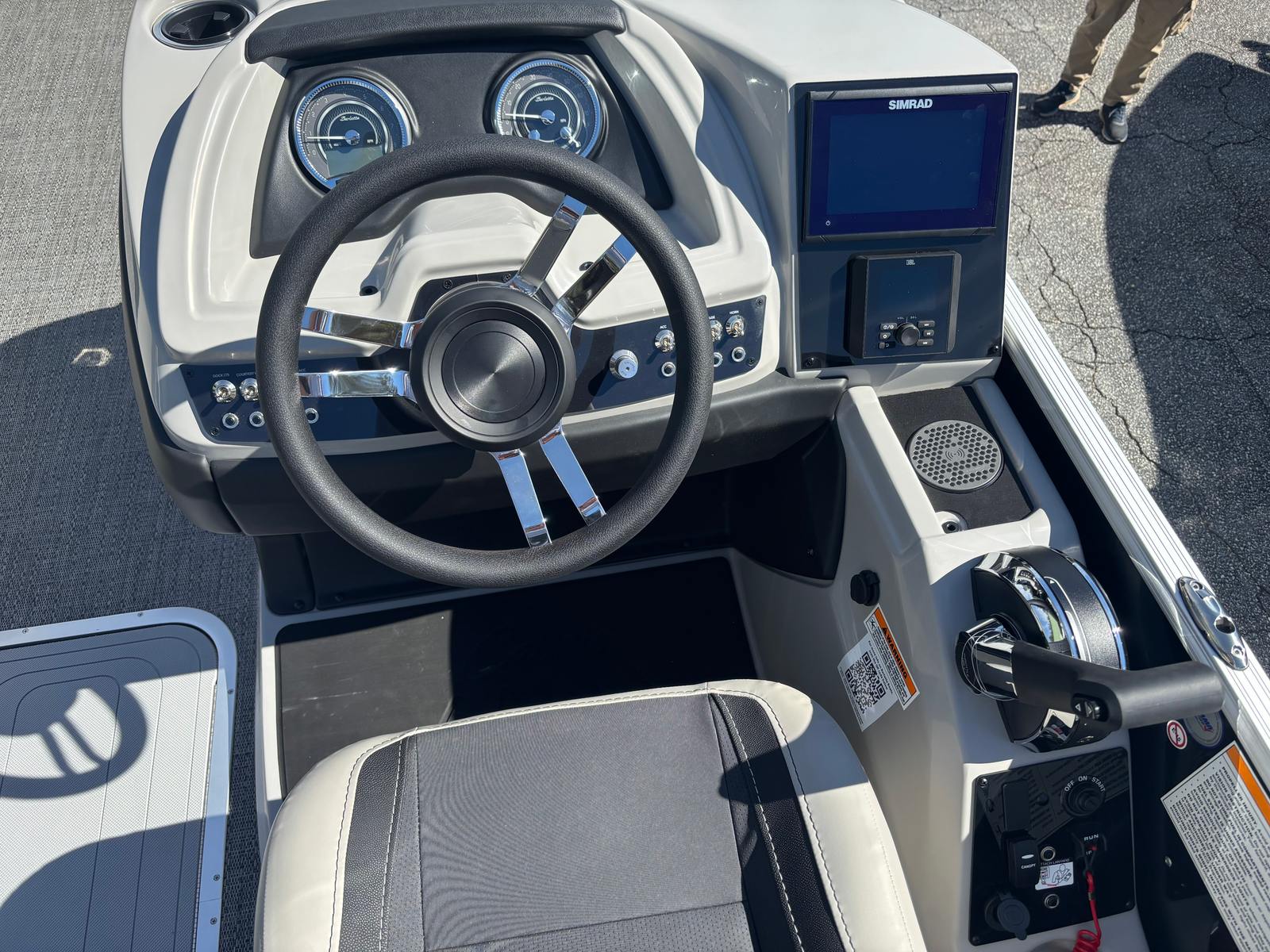 The 2026 Barletta Cabrio C24M is loaded with features designed to maximize your enjoyment and convenience on the water. The interior RGB lighting package creates a customizable ambiance, perfect for evening cruises or lively gatherings. The Amore Gray flooring is both stylish and practical, offering a comfortable and easy-to-clean surface underfoot. At the helm, the Simrad 7" G07 XSR chartplotter/multifunction display puts navigation, system monitoring, and entertainment at your fingertips, ensuring you stay informed and in control throughout your journey.The Marquesan Gray with Onyx furniture provides plush seating and a modern aesthetic, while the stainless steel flag pole with an American flag adds a touch of patriotic flair to your vessel. The Triple Toon Package with midship storage not only improves performance but also offers additional space for storing gear, water toys, or picnic essentials, keeping your deck clutter-free and organized.