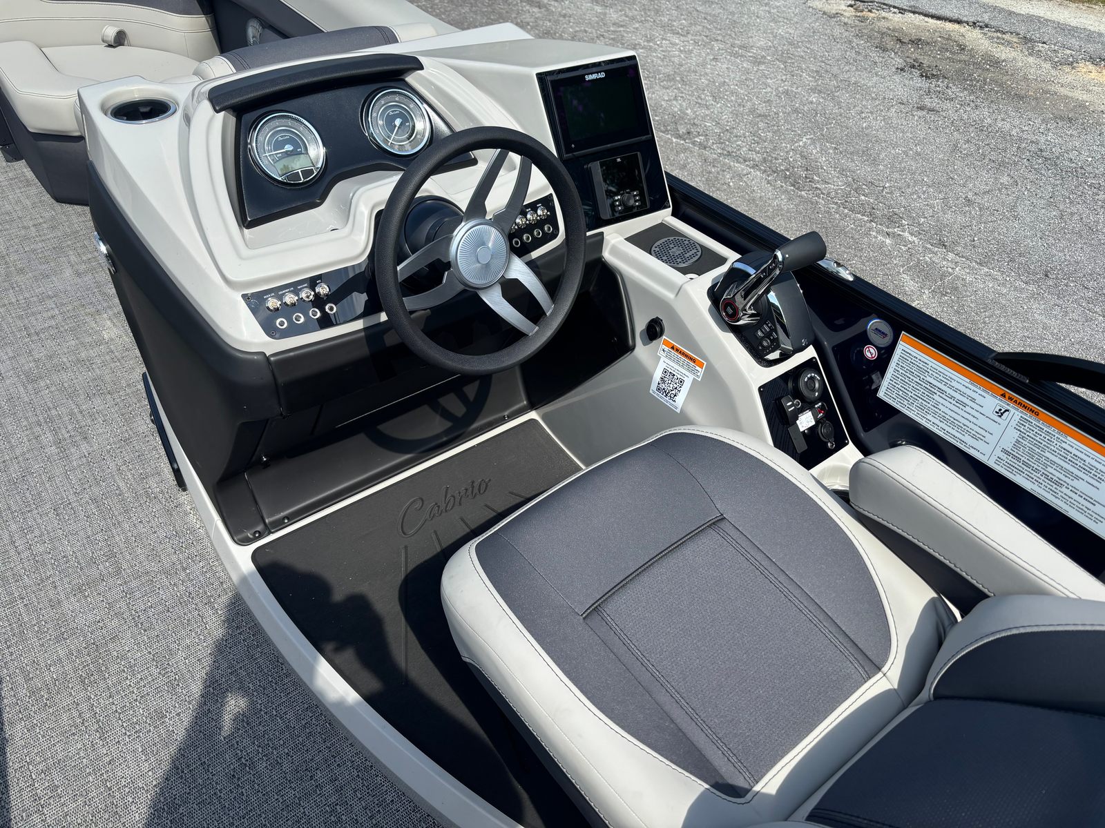 Step aboard the Cabrio C24UE and immerse yourself in a world of comfort and innovation. The Marquesan Gray furniture with Charcoal Accent creates a sophisticated and inviting atmosphere, perfectly complemented by the Amore Gray flooring. The interior RGB lighting package allows you to set the mood for any occasion, while the white underdeck and underwater exterior lighting add a touch of elegance and safety during evening cruises.The Simrad 7 G07 XSR Chartplotter/Multifunction Display puts navigation and system monitoring at your fingertips, making it easy to explore new waters with confidence. Digital gauges provide clear and accurate information, ensuring you stay informed about your boat’s performance at all times. The stainless steel flag pole with American flag adds a patriotic touch, while the Blackout Package Cabrio enhances the boat’s modern aesthetic.