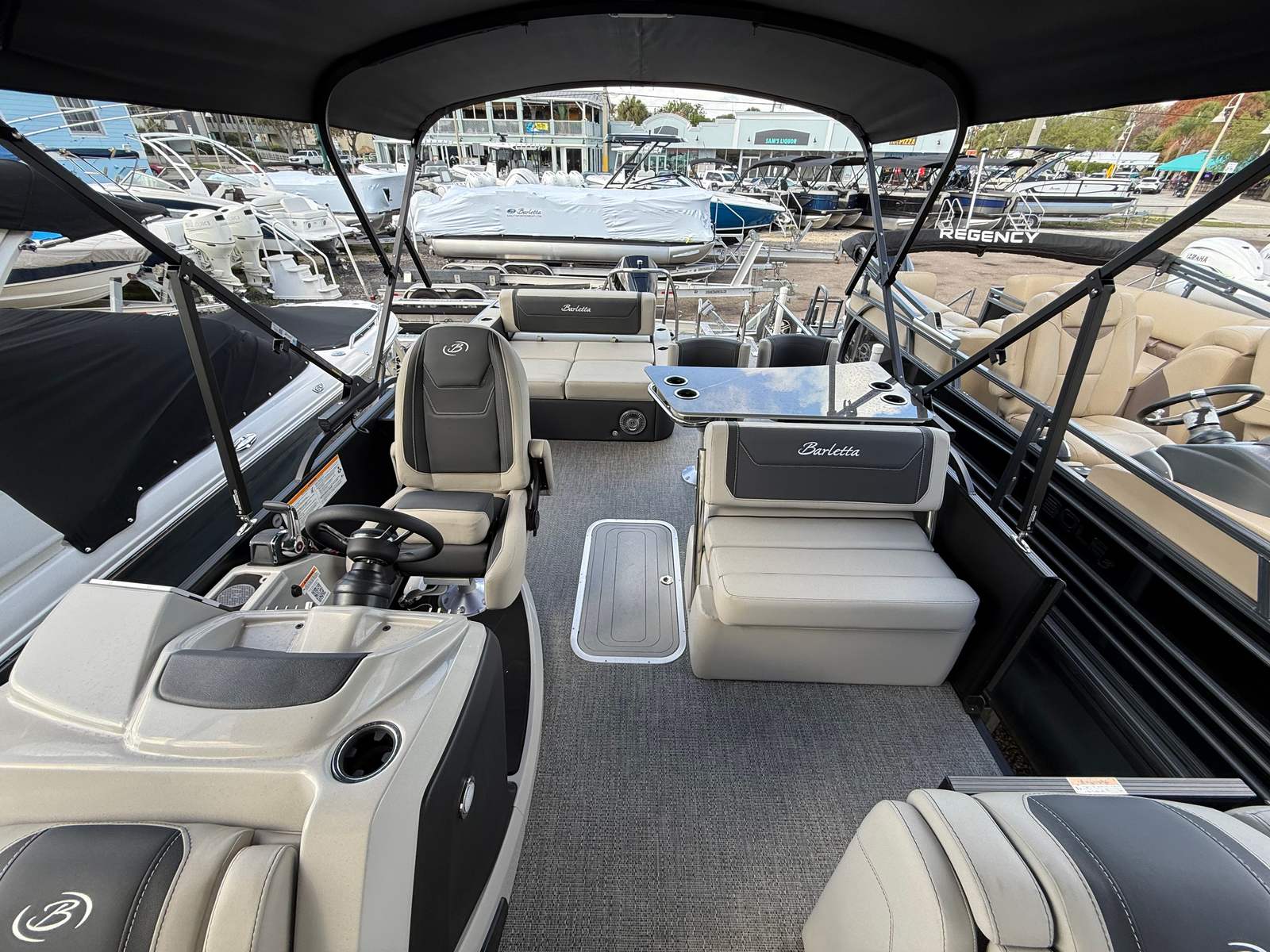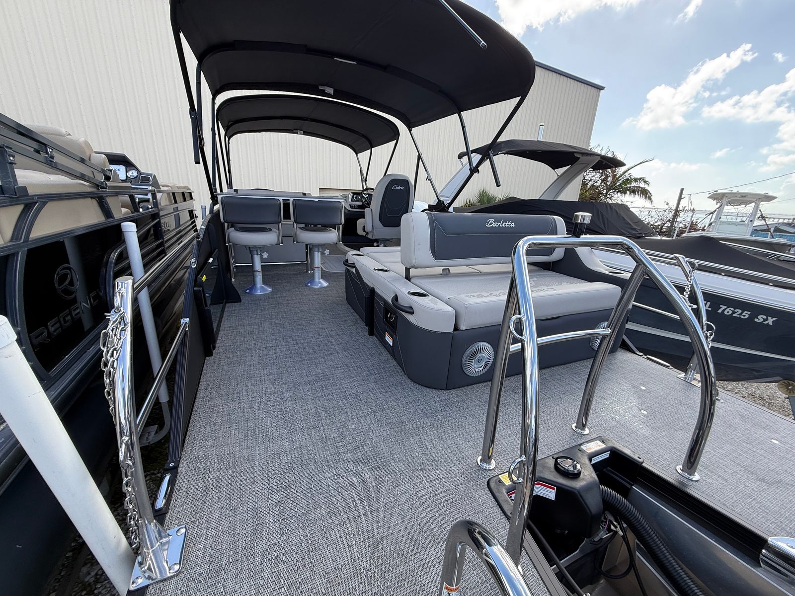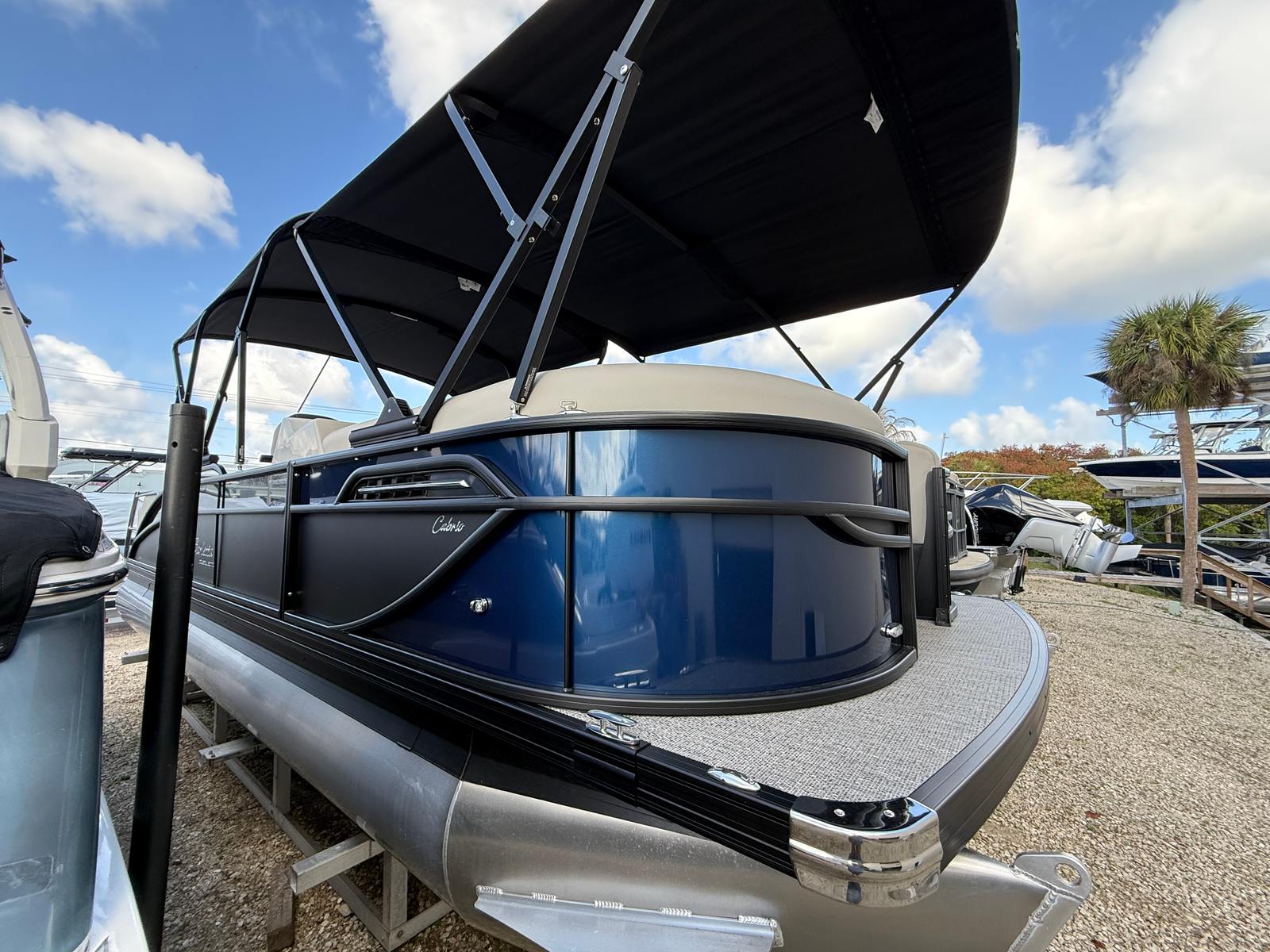 The 2026 Barletta Cabrio C24UE is a brand-new pontoon boat measuring an impressive 25.17 feet in length. Its spacious layout and premium construction make it ideal for families, friends, and anyone who loves spending time on the water. The Cabrio C24UE’s sleek Blue Sapphire Railskin, complemented by the Blackout Package Cabrio, ensures you’ll turn heads at every marina and lakefront. The Marquesan Gray with Onyx furniture and Amore Gray flooring create a sophisticated and inviting atmosphere, perfect for entertaining or unwinding after a day of fun.
