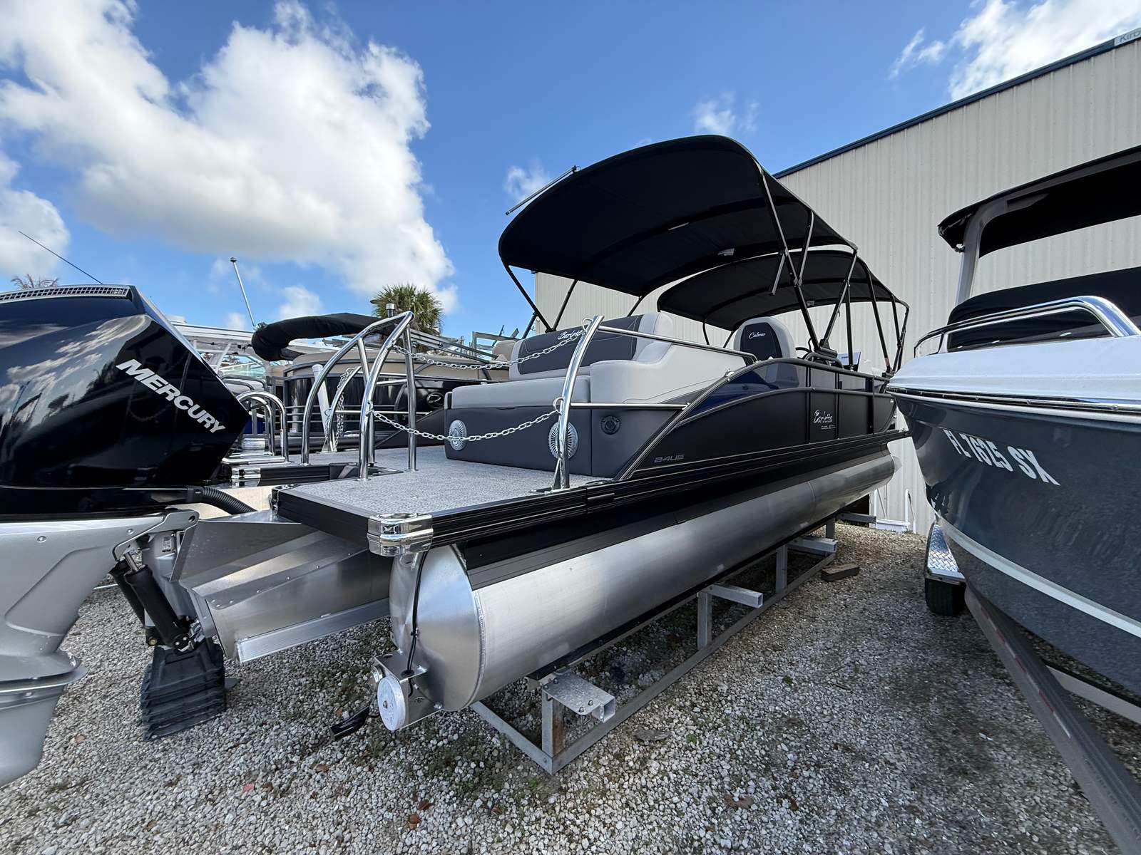 The 2026 Barletta Cabrio C24UE is packed with special features that set it apart from other pontoon boats for sale. The striking Blue Sapphire Railskin and Blackout Package Cabrio give the boat a modern, sporty look, while the Marquesan Gray with Onyx furniture and Amore Gray flooring provide a luxurious, comfortable setting for all your guests. The Coastal Edition Cabrio ensures durability and performance in a variety of water conditions, making this pontoon as versatile as it is stylish.The triple toon package with midship storage offers enhanced buoyancy and ample space for gear, making it easy to bring along everything you need for a day on the water. The Mercury Digital DTS Pre-Rig for VERADO engines with Vessel Link, digital gauges, and rig engine with stainless steel prop deliver advanced technology and reliability. The double bimini canvas provides generous shade, allowing you to enjoy sunny days without worry.