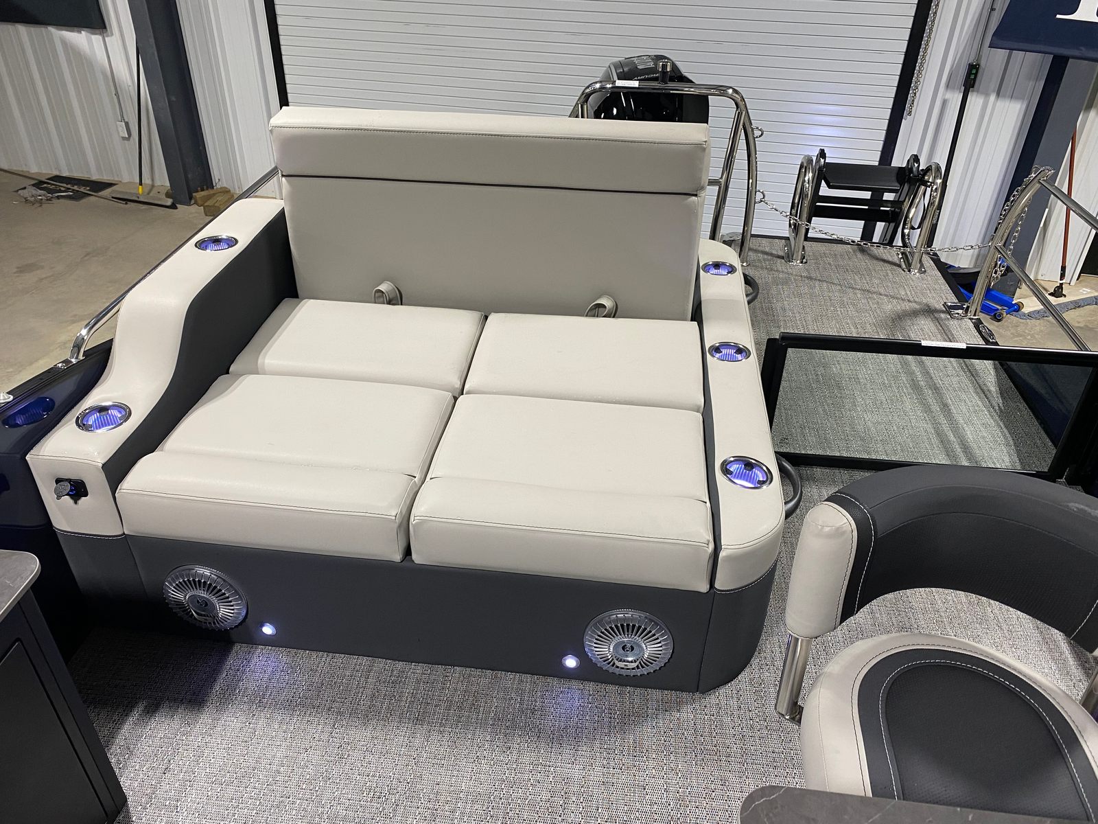 The 2026 Barletta Cabrio C24UE is a standout in the world of pontoons, offering a sleek profile and a generous length of just over 25 feet. This pontoon boat is designed to deliver both style and substance, making it a top contender for those seeking a new pontoon boat for sale. The Cabrio C24UE’s striking Gray Moonstone railskin color, accented by Blue Sapphire, ensures you’ll turn heads at every marina and on every lake. The Blackout Package Cabrio adds a bold, modern touch, while the Marquesan Gray with Onyx furniture and Amore Gray flooring create an inviting and upscale atmosphere onboard.