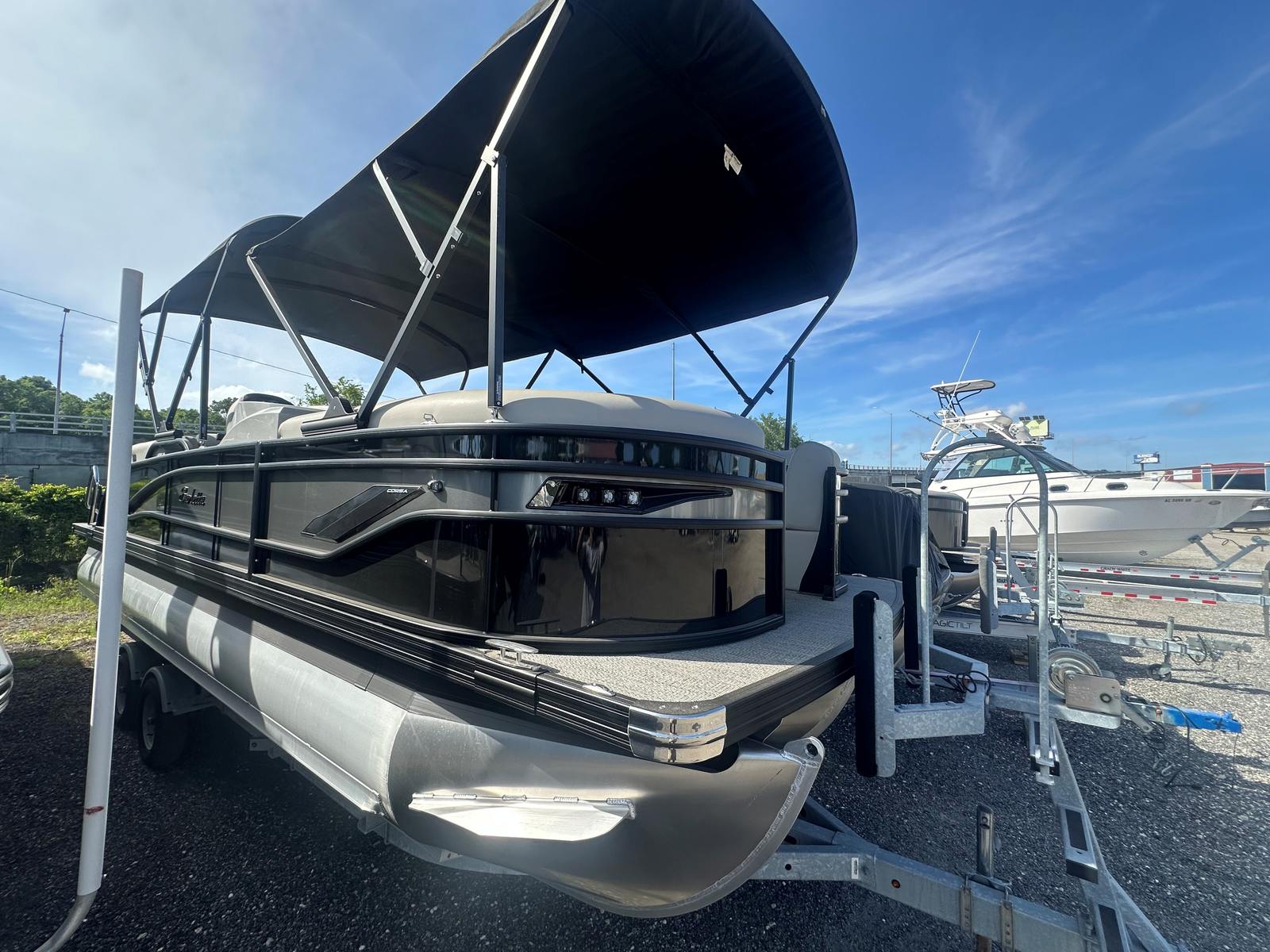 The Barletta Corsa 23QCSS is packed with features that set it apart from other pontoon boats for sale. The striking Railskin Color in Black Diamond, complemented by a Gray Moonstone accent, gives this boat a sophisticated and modern appearance. The Blackout Package Corsa adds an extra layer of elegance, making the boat truly eye-catching on the water.Step aboard and experience the plush comfort of Soft Touch Marquesan Gray furniture with Carbon Accent, designed to provide both style and relaxation. The Amore Gray flooring is not only visually appealing but also practical, offering a durable and easy-to-clean surface for all your boating activities. The Coastal Edition Corsa ensures that this pontoon is ready for a variety of environments, from calm lakes to coastal waters.For those who love to entertain or simply enjoy shade on sunny days, the double bimini setup, including an additional power bimini, offers flexible protection from the elements. Whether you are hosting a gathering or seeking a quiet retreat, the Barletta Corsa 23QCSS adapts to your needs with ease.