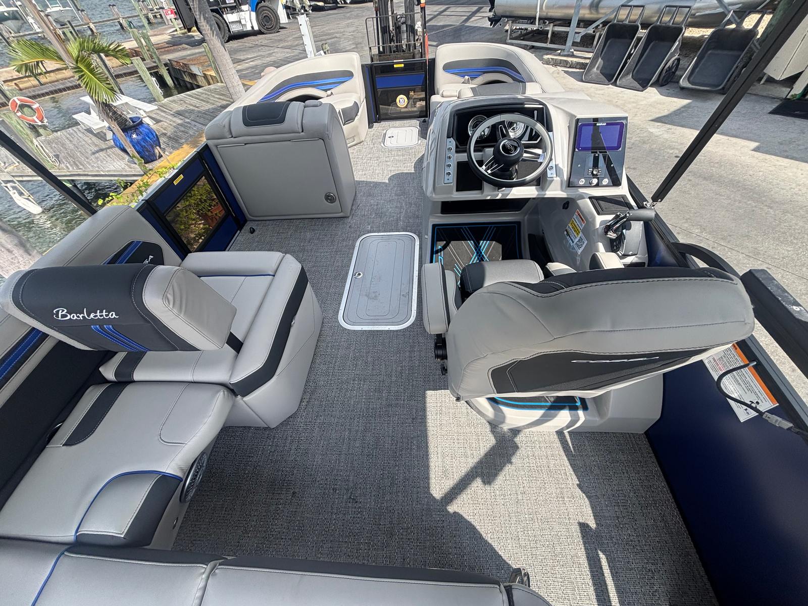 The Barletta Corsa 23U is packed with premium features designed to enhance your boating experience. The striking Bohemian Blue railskin color is complemented by the Blackout Package Corsa, giving the exterior a bold, sophisticated look. Step inside to discover furniture finished in Soft Touch Marquesan Gray with Blue Accent, offering plush comfort and a modern aesthetic. The flooring is crafted from Amore Gray, providing a durable and stylish foundation for all your onboard activities.Enjoy the ambiance created by white underdeck and underwater exterior lighting, perfect for evening cruises and dockside gatherings. The stainless steel flag pole with American flag adds a patriotic touch, while the Coastal Edition Corsa ensures this pontoon is ready for saltwater adventures. Music lovers will appreciate the added subwoofer and amplifier, delivering rich, immersive sound for every journey.