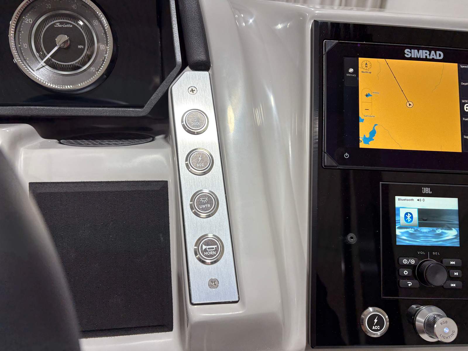 At the heart of the Barletta Corsa 25U is a powerful Mercury 250L Verado V8 engine, delivering an impressive 250 horsepower. This advanced outboard engine is renowned for its smooth acceleration, quiet operation, and remarkable fuel efficiency, ensuring that every outing is both thrilling and economical. The Mercury Digital DTS Pre-Rig for VERADO engines with Vessel Link provides seamless digital throttle and shift control, enhancing responsiveness and precision at the helm. With hydraulic and power assist steering, navigating tight turns and docking becomes effortless, allowing you to focus on enjoying the ride. The stainless steel prop ensures optimal performance and durability, making this pontoon boat for sale a true standout in its class.