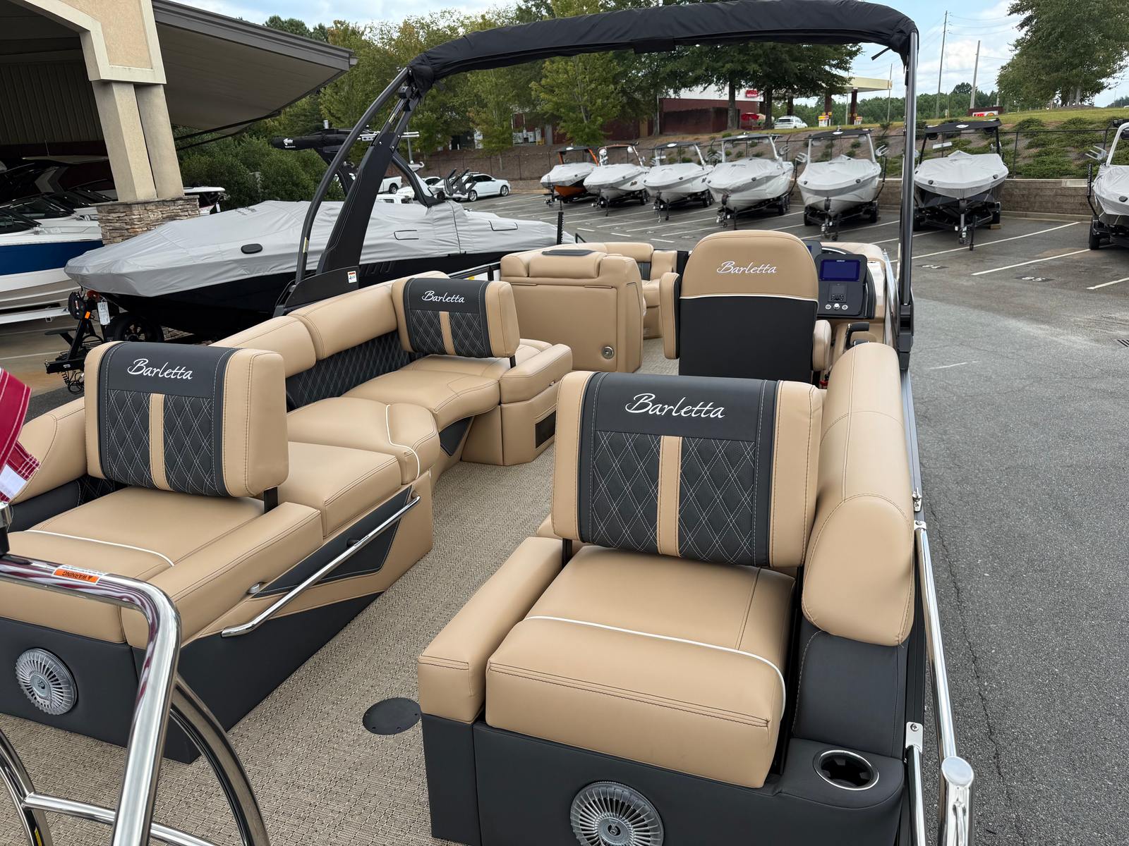 The 2026 Barletta Lusso L23M is loaded with premium features that set it apart from other pontoon boats for sale. The exterior boasts a striking Sweep Color in Winter White, complemented by the Blackout Package Lusso railskin, creating a bold and sophisticated look. The flooring is finished in Amore Tan, providing both durability and a touch of elegance underfoot. The furniture, upholstered in Carmella Tan with Onyx accents, offers plush comfort and a refined aesthetic, ensuring that every seat is the best in the house.For those who appreciate shade and protection from the elements, the Lusso L23M comes equipped with a Sport Bimini (installed in place of the standard Bimini), allowing you to enjoy the sun or seek shelter as needed. Digital gauges provide clear and accurate information at a glance, while the rigging includes a stainless steel prop for optimal performance and longevity. Every detail, from the accent color in Winter White to the thoughtfully designed seating arrangements, reflects Barletta’s commitment to quality and innovation.
