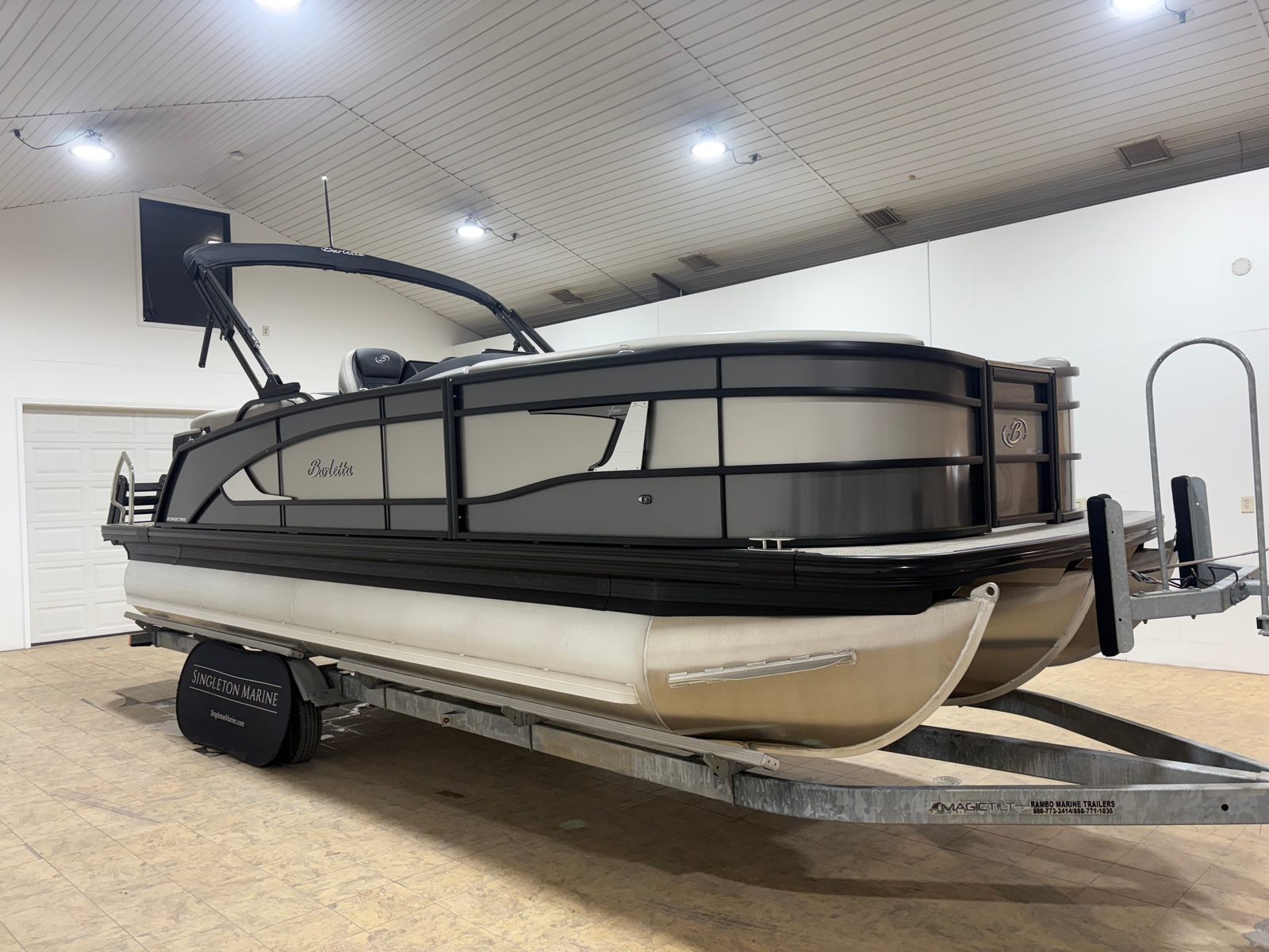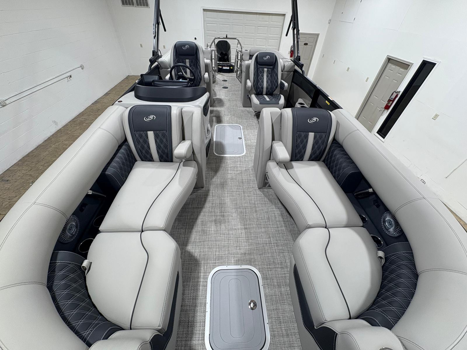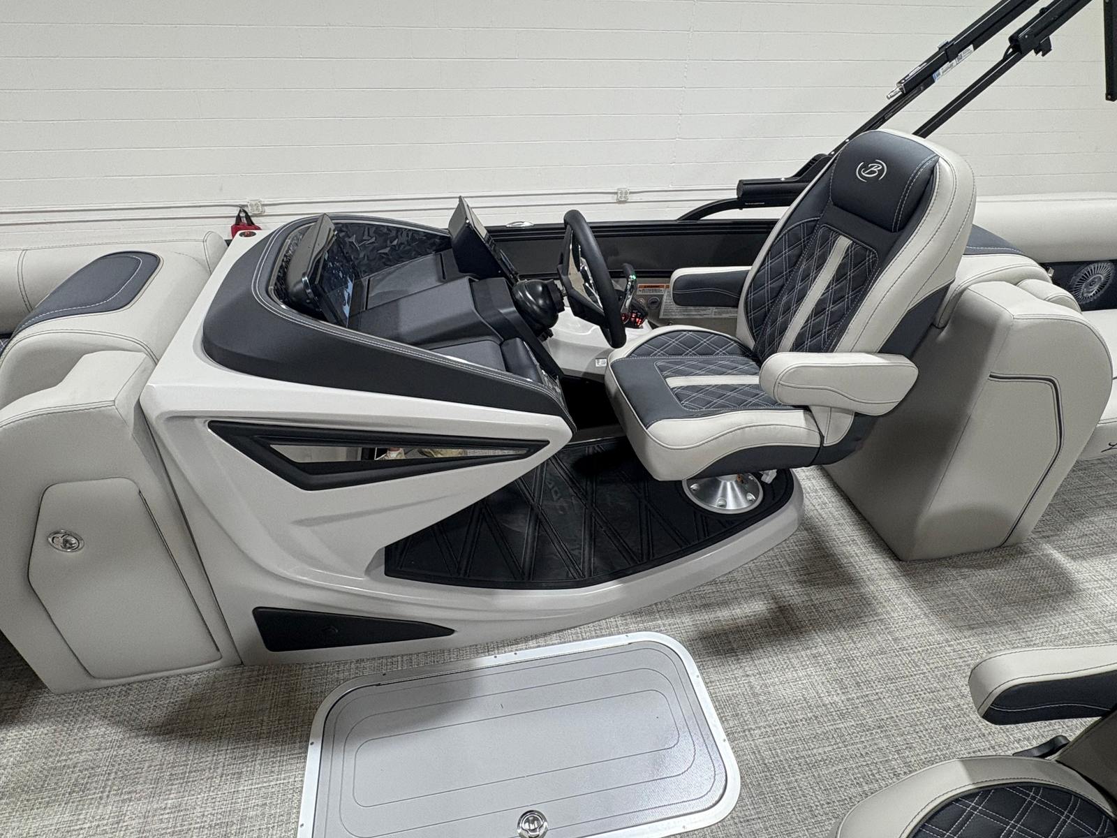 The 2026 Barletta Lusso L23QCSS is a brand-new pontoon boat that stretches an impressive 25.5 feet in length, offering ample space for relaxation, entertainment, and fun. With its sleek lines and contemporary design, this pontoon boat commands attention at every dock and on every lake. The Gray Moonstone sweep color, accented by a touch of Champagne, gives the Lusso L23QCSS a modern yet timeless appeal, while the Lusso Blackout Package adds a bold, sophisticated edge. The Marquesan Gray with Onyx furniture and Amore Gray flooring create a welcoming and stylish environment, making every moment on board feel like a luxury getaway.