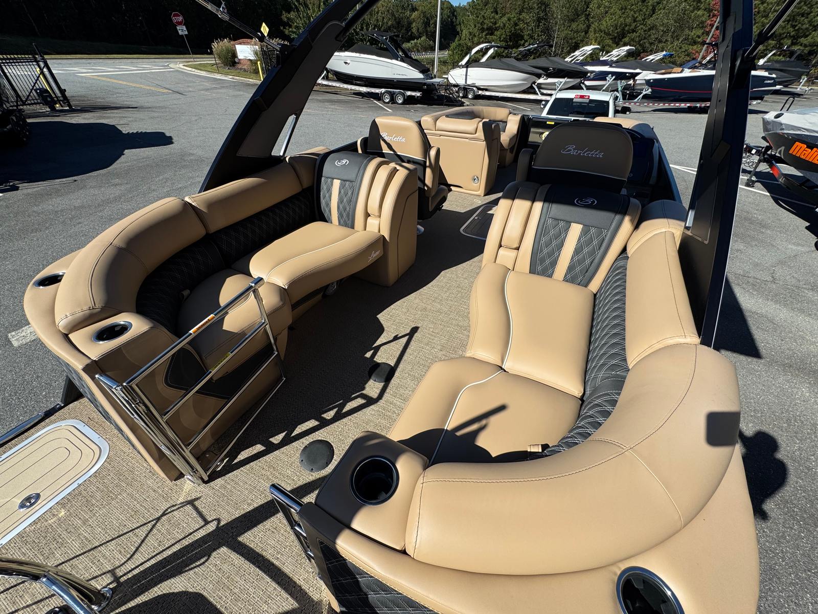 The Barletta Lusso L23QCSSA is loaded with features that enhance both its aesthetics and functionality. The Amore Tan flooring offers a warm, inviting look while providing durability and easy maintenance. The Blackout Package Lusso railskin adds a bold, contemporary edge, perfectly complemented by the Black Diamond accent and sweep colors. The Carmella Tan with Onyx furniture delivers plush comfort and sophisticated style, creating a welcoming environment for you and your guests.For those who appreciate ambiance, the exterior white underdeck and underwater lighting set the mood for evening cruises and dockside gatherings. The 2-bank battery charger ensures your boat is always ready for action, keeping your electronics and accessories powered up for every adventure.
