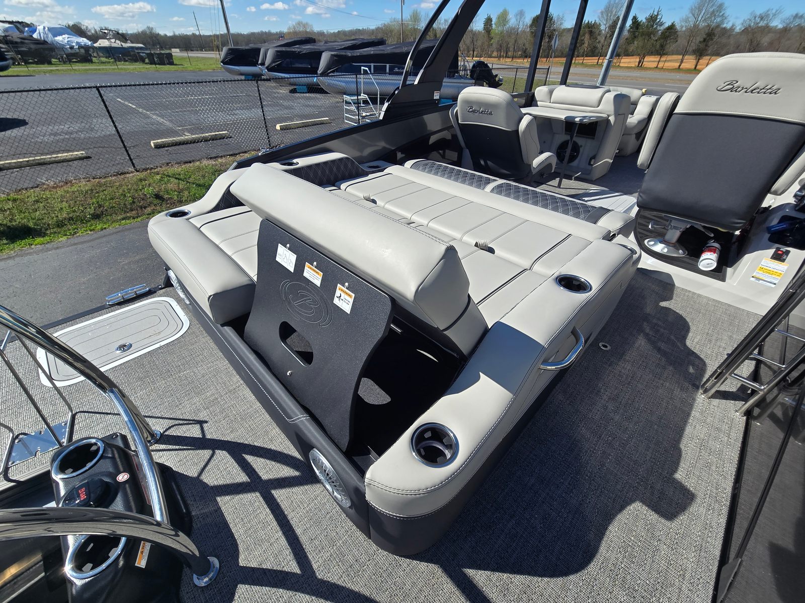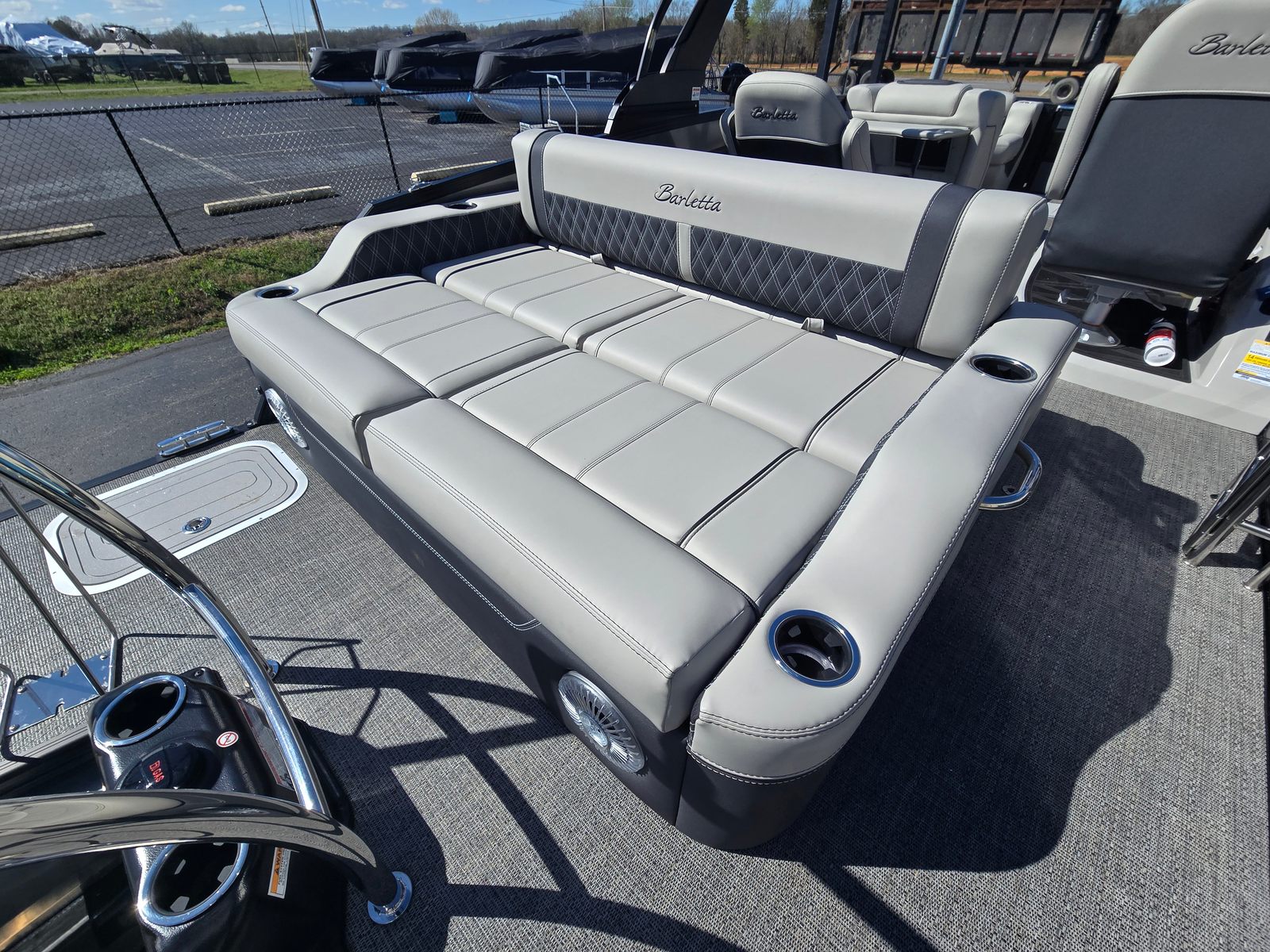 The 2026 Barletta Lusso L23UC is loaded with premium features that elevate your boating experience. The exterior boasts a sophisticated Sweep Color in Gray Moonstone, complemented by a striking Black Diamond accent color. The Blackout Package Lusso railskin adds a touch of modern elegance, while the Marquesan Gray furniture with Onyx accents creates a refined and inviting interior. The Amore Gray flooring is both stylish and durable, providing a comfortable surface underfoot.For those who appreciate advanced technology, the Lusso L23UC comes equipped with digital gauges for easy monitoring of vital stats. The Mercury Digital DTS Pre-Rig and Vessel Link system ensure seamless integration with the engine, offering real-time data and effortless control. The Sport Bimini, installed in place of the standard bimini, provides ample shade and protection from the sun, allowing you to enjoy long days on the water in comfort. Exterior lighting, including white underdeck and underwater lights, adds a touch of ambiance and enhances visibility during evening cruises.