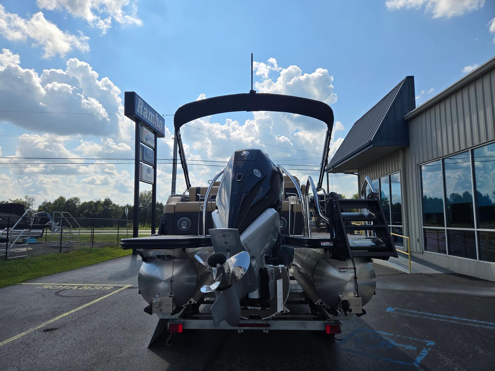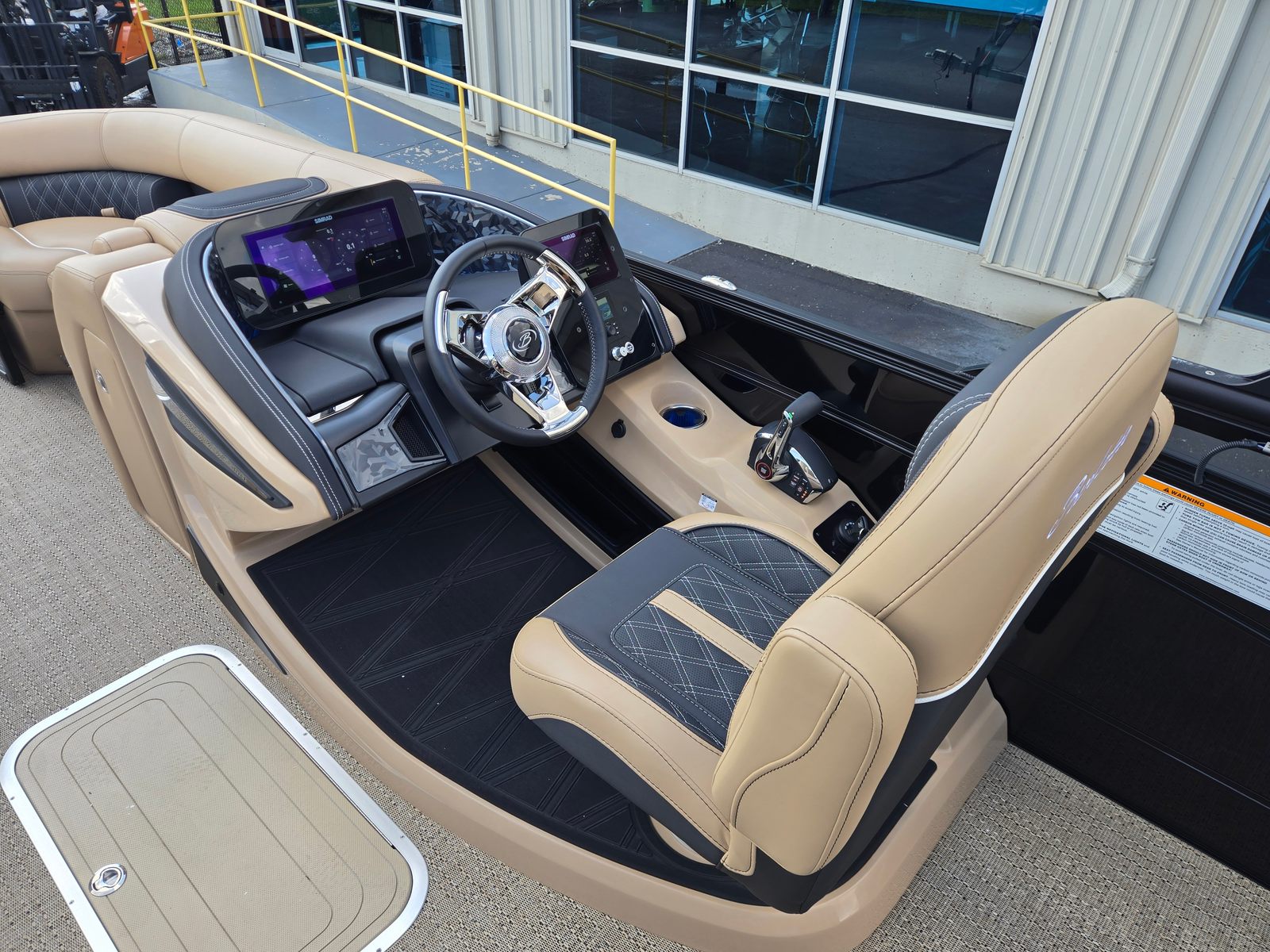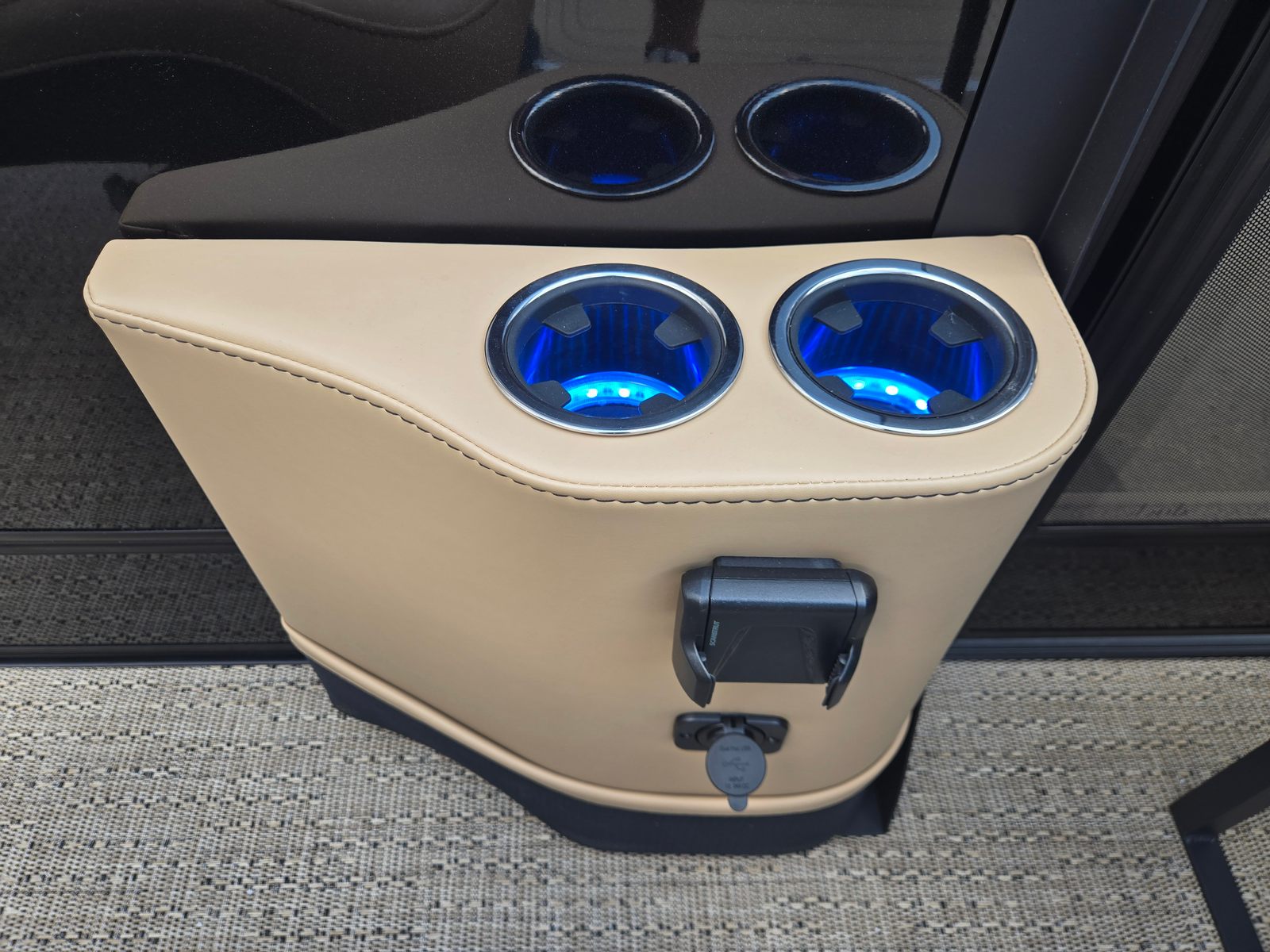 The 2026 Barletta Lusso L23UC is loaded with features designed to enhance your time on the water. The Blackout Package Lusso Railskin gives the exterior a bold, modern look, while the Black Diamond color scheme adds a touch of sophistication. Inside, the Carmella Tan with Onyx furniture offers plush seating and ergonomic support, ensuring comfort for all passengers. The Amore Tan flooring is both stylish and practical, providing a non-slip surface that’s easy to maintain.For those who appreciate advanced technology, the Lusso L23UC comes equipped with Mercury Digital DTS Pre-Rig for VERADO engines with Vessel Link, allowing for intuitive engine management and connectivity. The hydraulic and power assist steering makes docking and navigating tight spaces a breeze, while digital gauges provide clear, accurate information at a glance. Exterior lighting, including white underdeck and underwater lights, not only enhances the boat’s appearance but also improves visibility and safety during evening cruises.