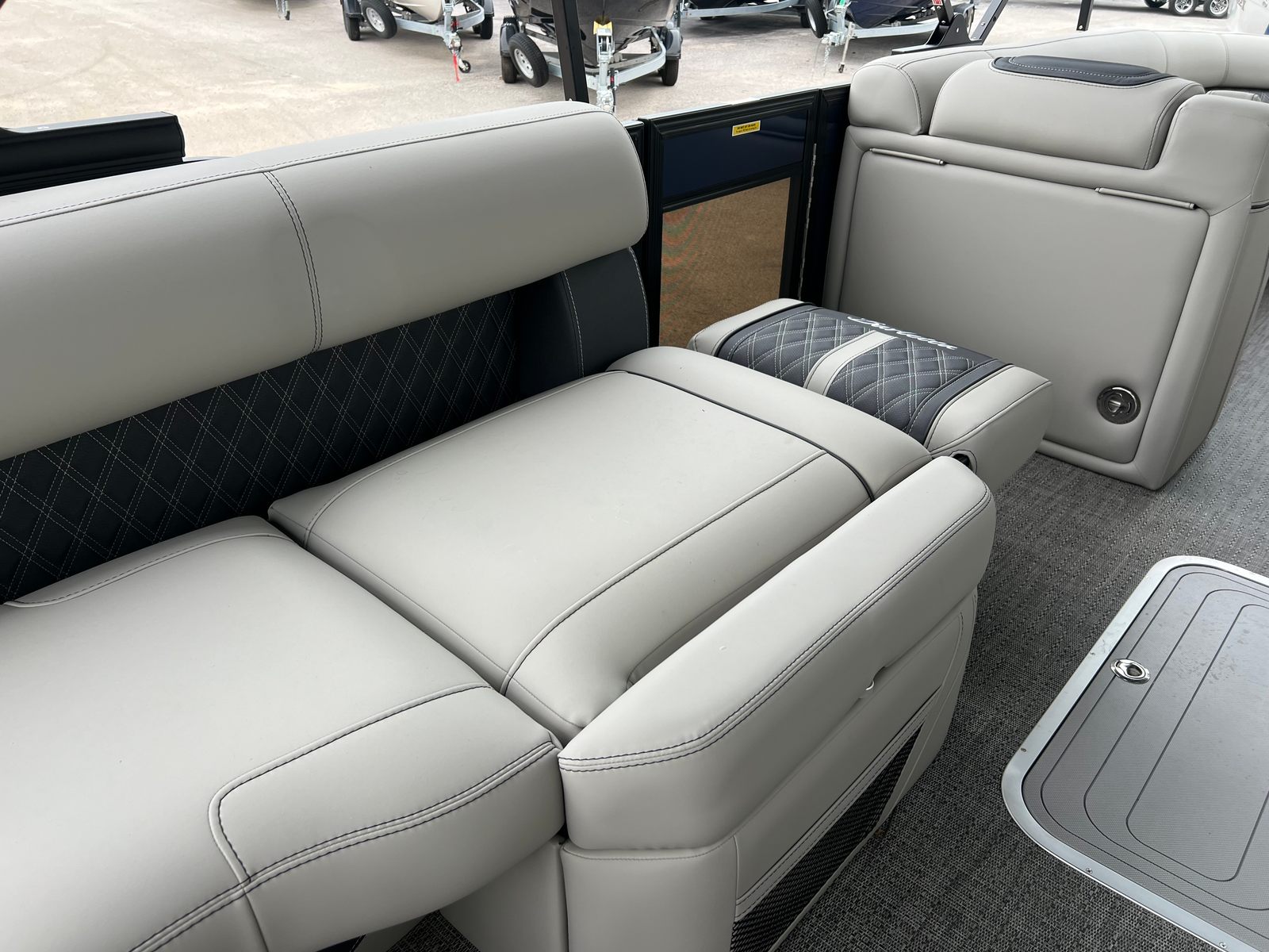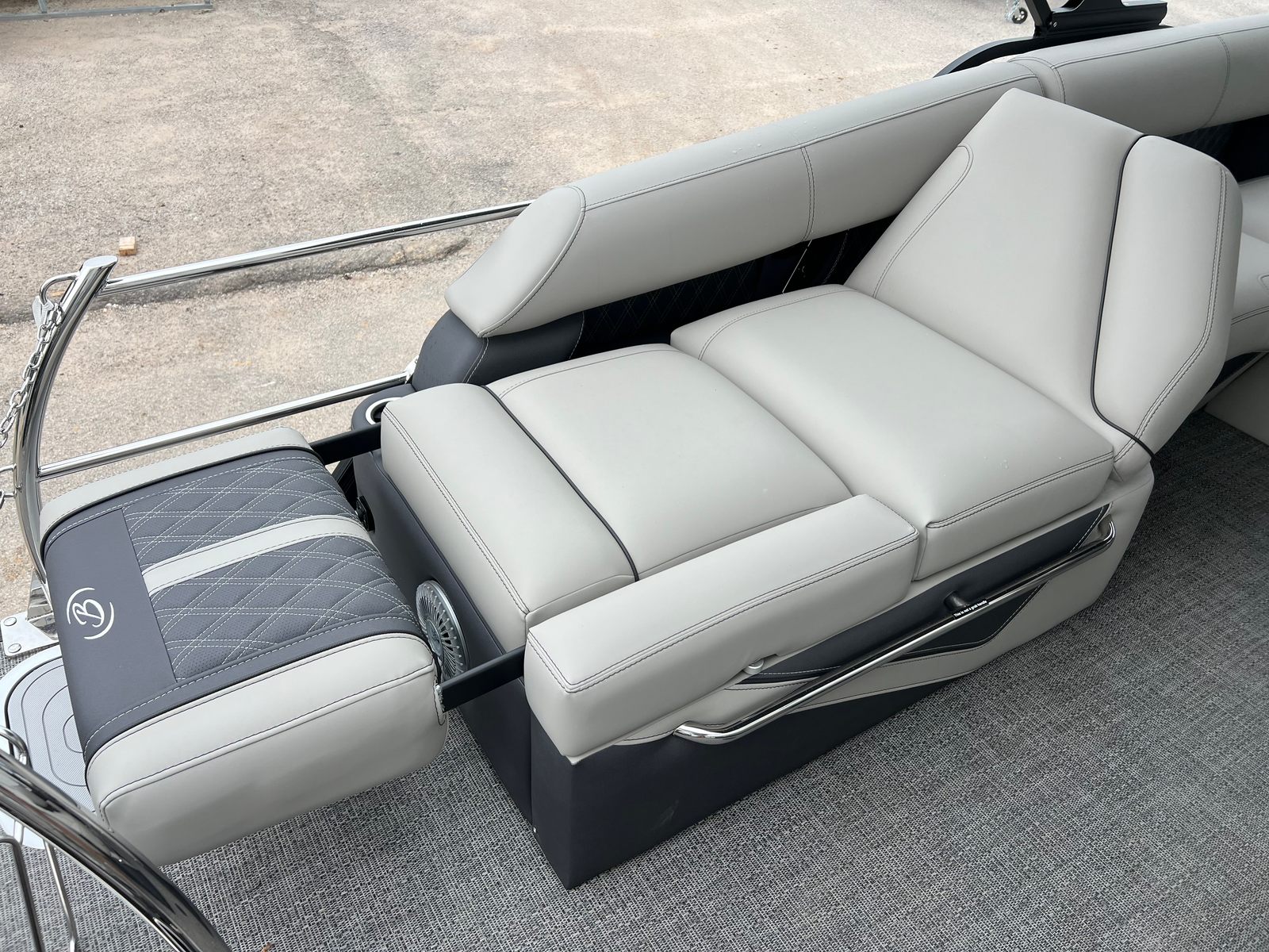 The Barletta Lusso L25M is packed with special features that set it apart from other pontoon boats for sale. The Black Diamond sweep and accent colors give the boat a bold, contemporary look, while the Blackout Package Lusso railskin adds an extra layer of sophistication. Inside, you’ll find Marquesan Gray furniture with Charcoal accents, creating a plush and inviting atmosphere for passengers. The Amore Gray flooring is both stylish and practical, offering durability and easy maintenance for years of enjoyment.For those who love spending long days on the water, the Lusso L25M comes equipped with a double bimini, including an additional power bimini for effortless shade adjustment. This feature ensures that you and your guests can stay cool and comfortable, no matter how bright the sun shines. The exterior is protected by a Metal Jacket Protectant, helping to preserve the boat’s pristine appearance and safeguard against the elements.