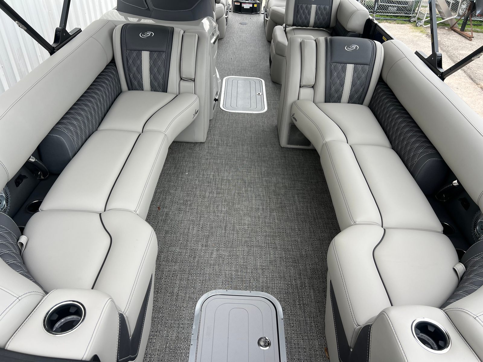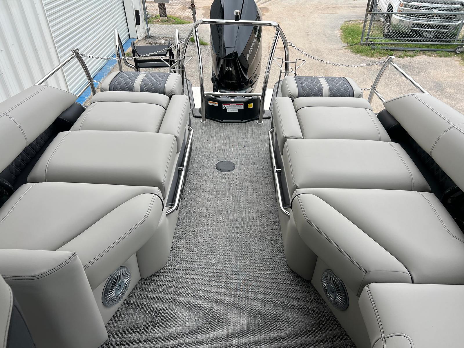 Owning the Barletta Lusso L25M means embracing a lifestyle of fun, relaxation, and social connection. The spacious deck layout is perfect for hosting gatherings, with plenty of room for friends and family to spread out and enjoy the ride. The luxurious seating and thoughtful design details create an inviting environment, whether you’re lounging in the sun or sharing a meal on the water. The double bimini system provides flexible shade options, allowing you to customize your comfort throughout the day.The Lusso L25M’s powerful Mercury engine ensures that you’ll never be left wanting for speed or agility, making it easy to explore new destinations or participate in water sports. The advanced rigging and digital pre-rig systems simplify operation, so you can focus on making memories rather than managing complicated controls. With its striking appearance and high-end finishes, this Barletta boat for sale is sure to impress guests and fellow boaters alike.