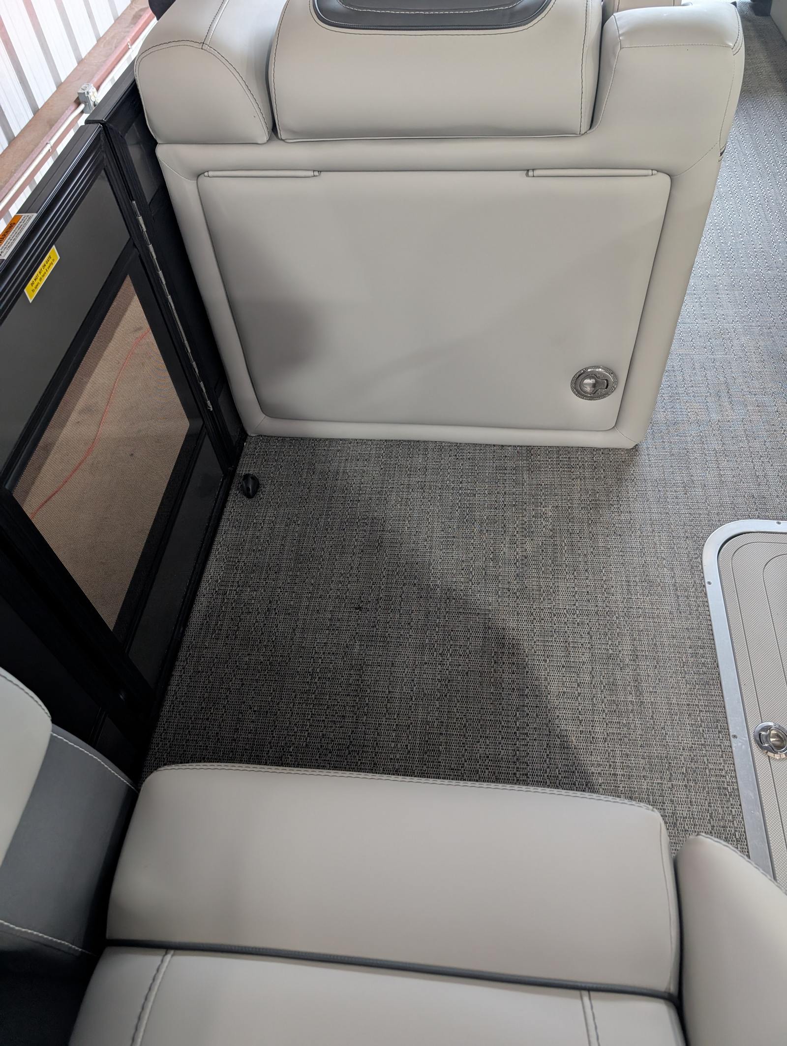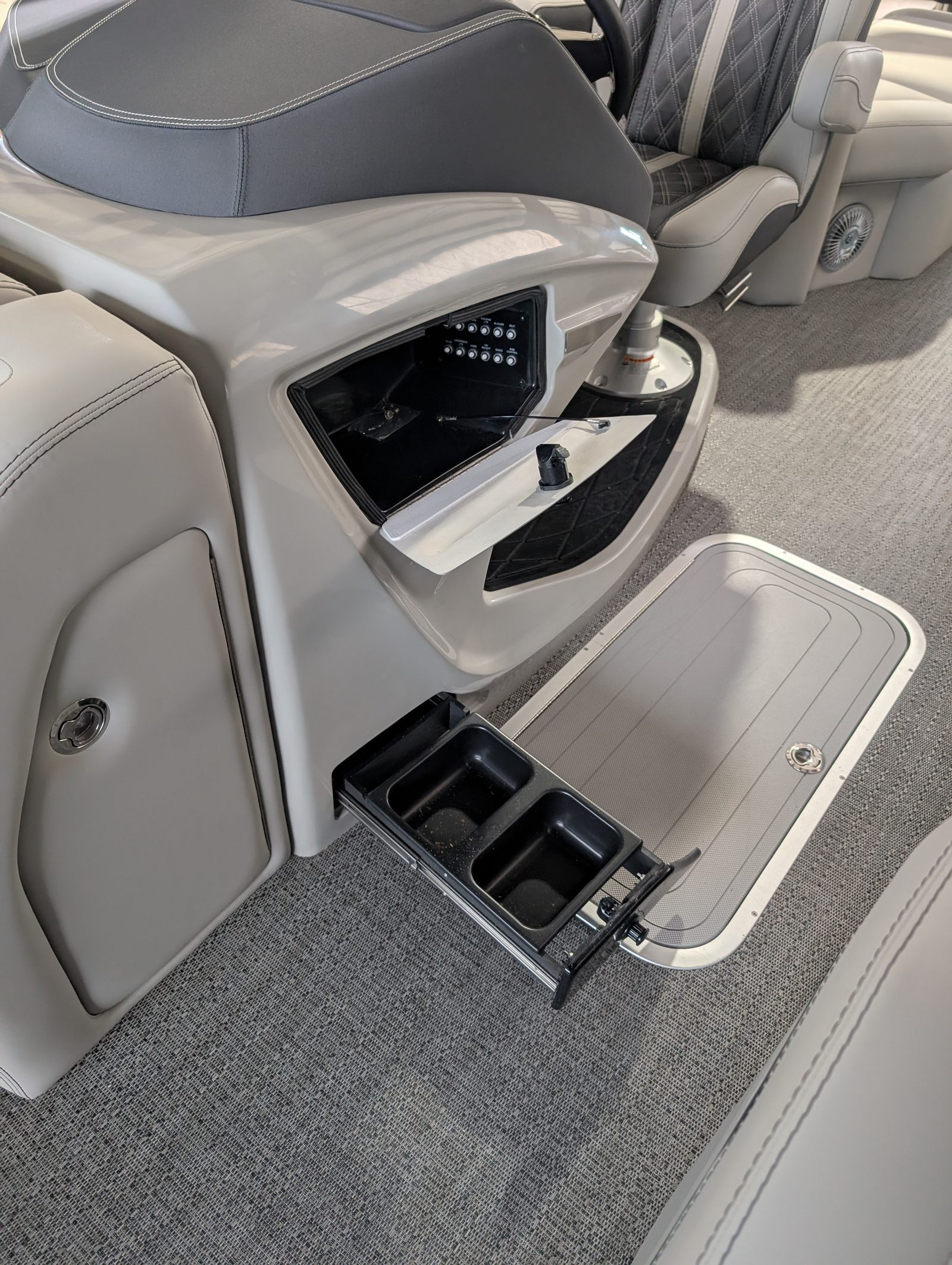 The Barletta Lusso L25M is packed with premium features that set it apart from other pontoon boats for sale. Step aboard and you’ll immediately notice the Amore Gray flooring, which provides a sophisticated foundation for the entire vessel. The interior is equally impressive, featuring Marquesan Gray furniture with Charcoal accents and a Matte Black accent color for a modern, upscale look.The captain’s chair at the helm is equipped with an adjustable pedestal, ensuring optimal comfort and visibility for the driver. Entertaining guests is a breeze thanks to the interior table, pedestal, and base, complete with Yeti-ready cupholders for your favorite beverages. Exterior lighting, including white underdeck and underwater lights, adds a dramatic flair for evening cruises and enhances safety after sunset.The Lusso L25M’s sweep color in Gray Moonstone complements its overall aesthetic, while the rigging and pre-rigging for the Mercury V10 engine ensure seamless integration and reliable performance. Every detail has been thoughtfully designed to maximize comfort, convenience, and enjoyment on the water.