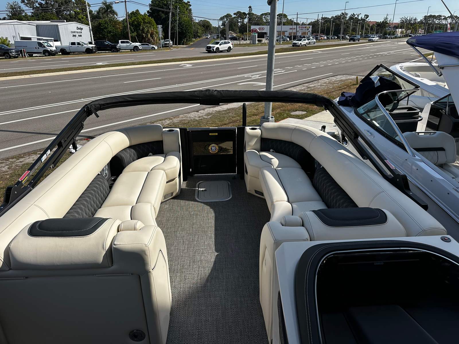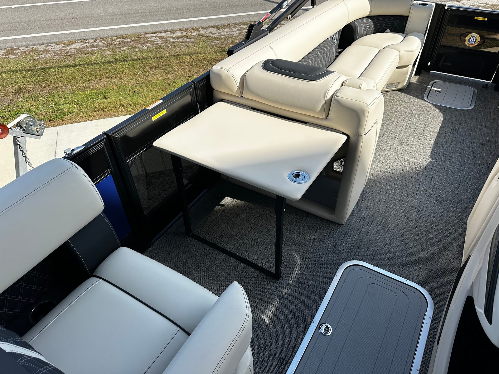 The Barletta Lusso L25M is packed with premium features that elevate your boating experience to new heights. The double bimini canvas, including an additional power bimini, offers versatile shade options, allowing you to enjoy the sun or seek shelter with ease. The exterior lighting package features white underdeck and underwater lights, creating a captivating ambiance for evening cruises and dockside gatherings. The 25-inch transom construction ensures durability and stability, while the onboard battery charger with two batteries provides reliable power for all your adventures.The Lusso L25M’s interior is designed for both style and functionality, featuring Amore Gray flooring that is both elegant and easy to maintain. The table, pedestal, and base with Yeti-ready cupholders (dealer install for customer preference) add a touch of convenience and sophistication, making it easy to enjoy snacks and drinks while on the water. The Blackout Package Lusso railskin enhances the boat’s modern aesthetic, ensuring you turn heads wherever you go.