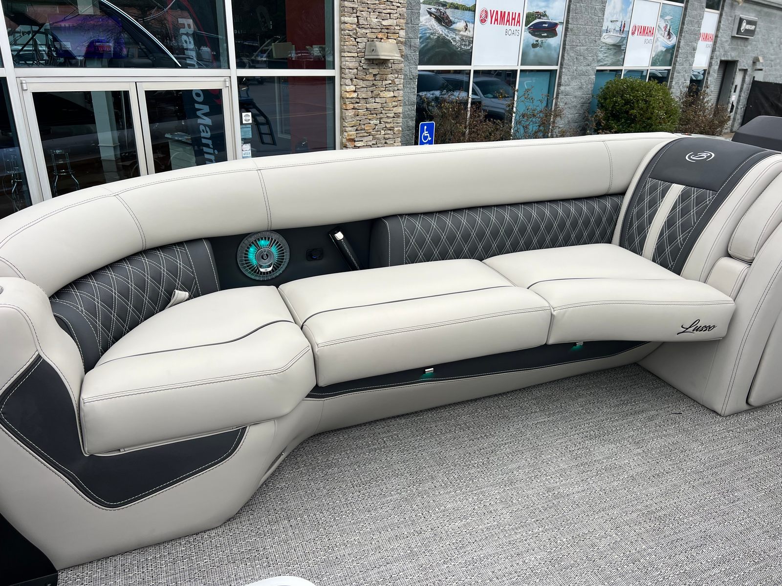 Step aboard the Barletta Lusso L25QCSSA and experience a world of luxury and innovation. The Blackout Package Lusso railskin adds a bold, modern touch to the exterior, while the Marquesan Gray with Onyx furniture provides a plush and inviting atmosphere for you and your guests. The Amore Gray flooring is both stylish and durable, offering a comfortable surface that is easy to maintain. The onboard battery charger with two batteries ensures you have reliable power for all your adventures, while the Metal Jacket Protectant helps preserve the boat’s pristine appearance for years to come.